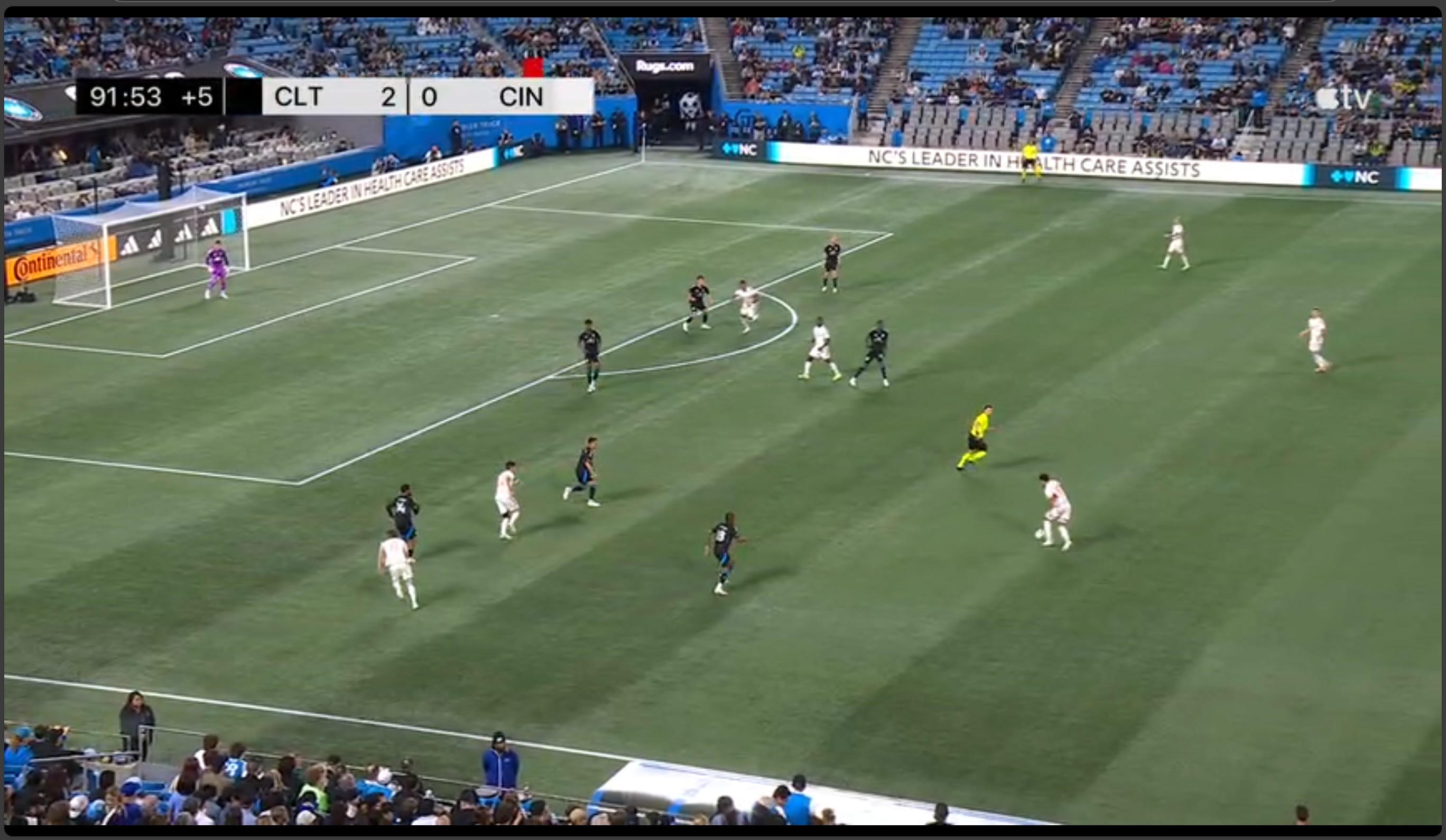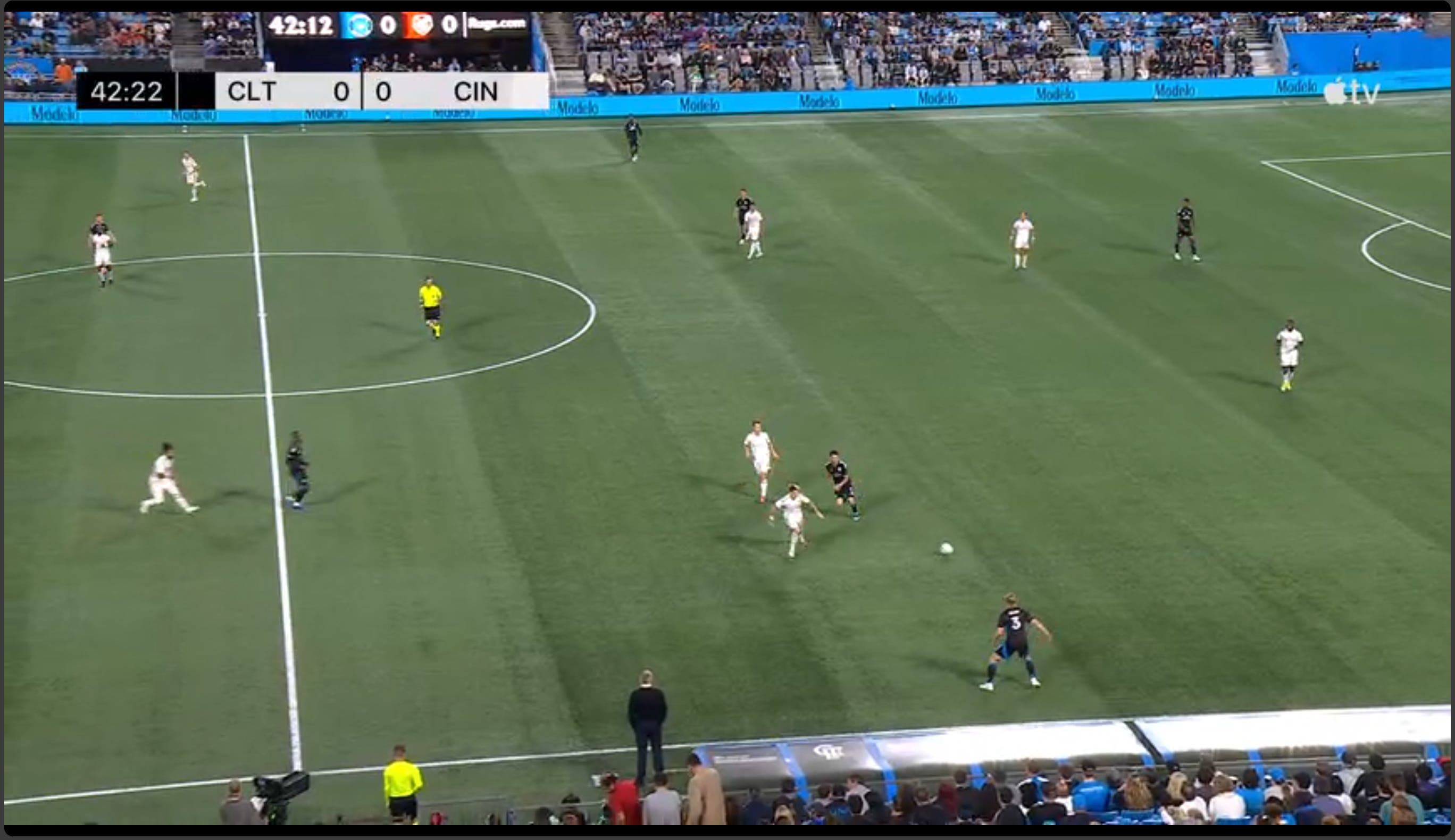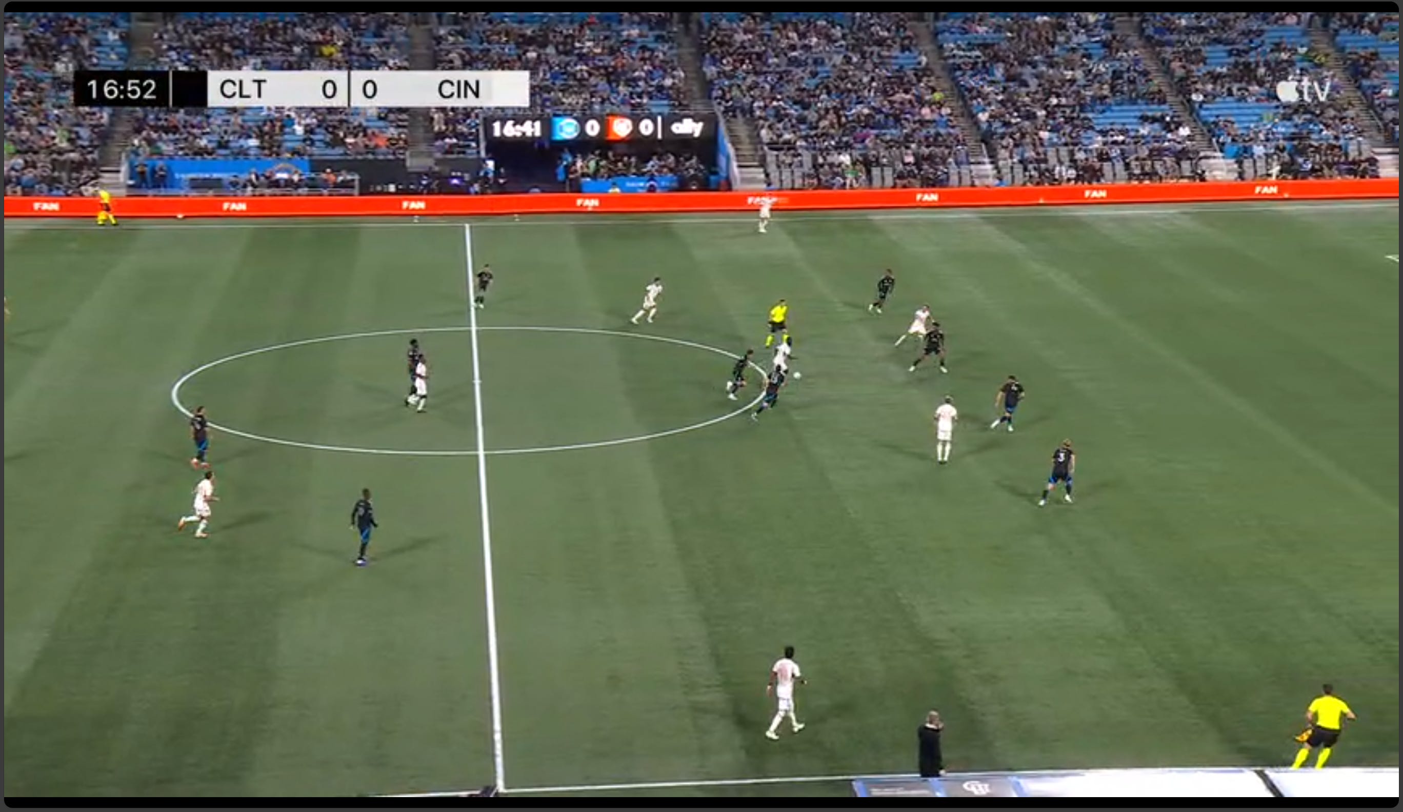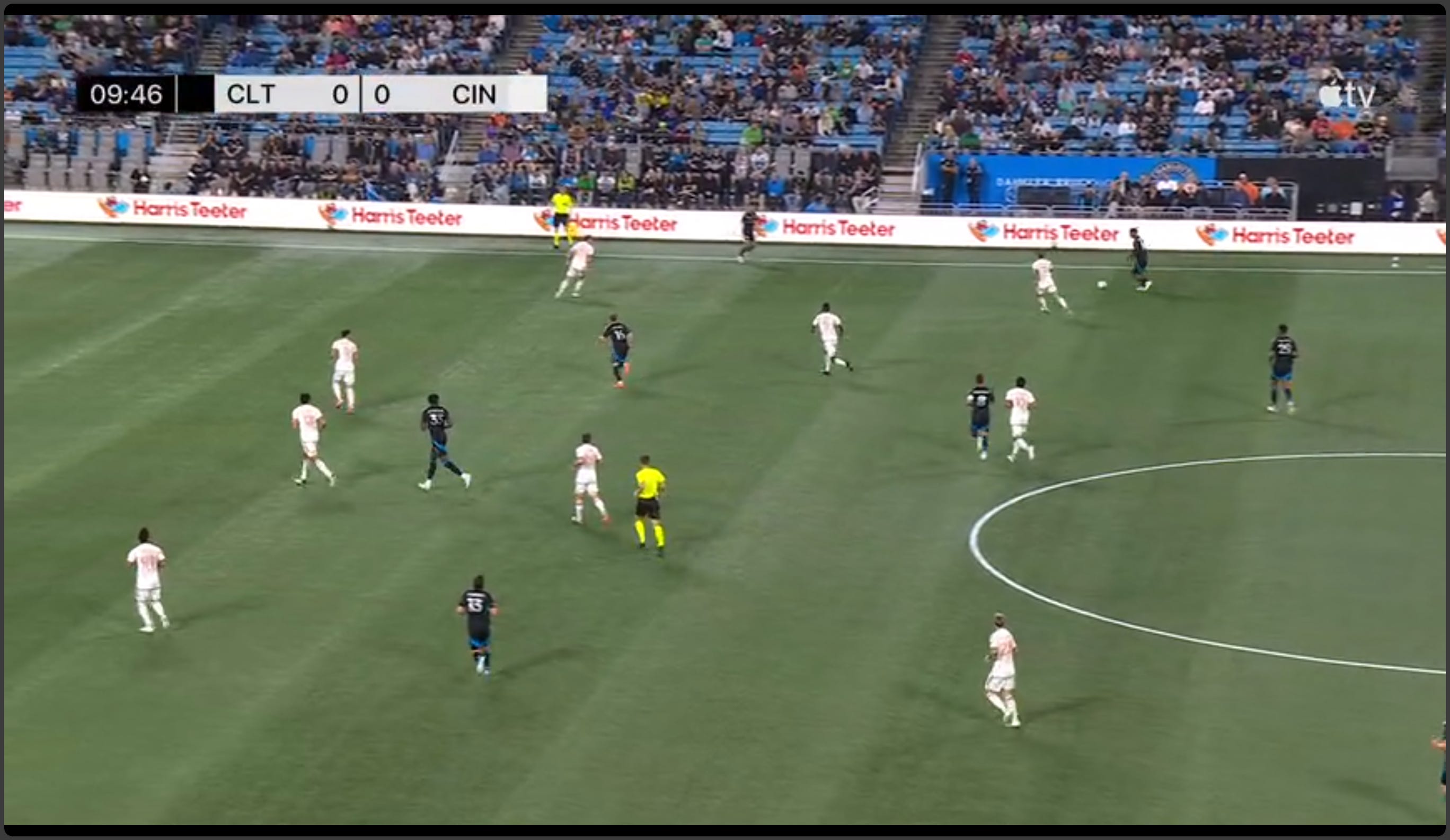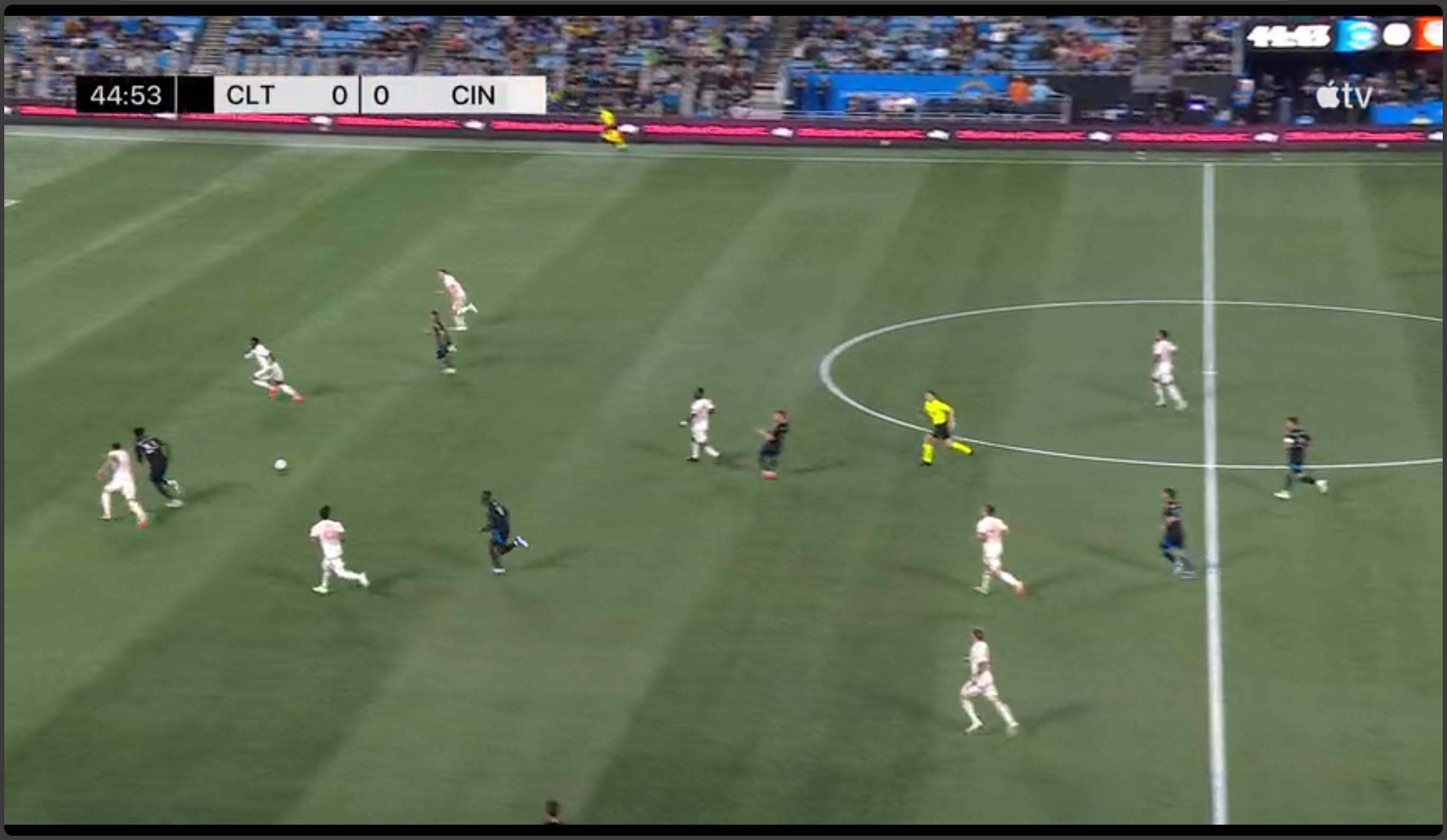 Malanda receives the ball and has no pressure on him and plenty of time to survey the field. As Cincy sets their defense, Nwobodo is central near Westwood and Biel finds open space on the far side.