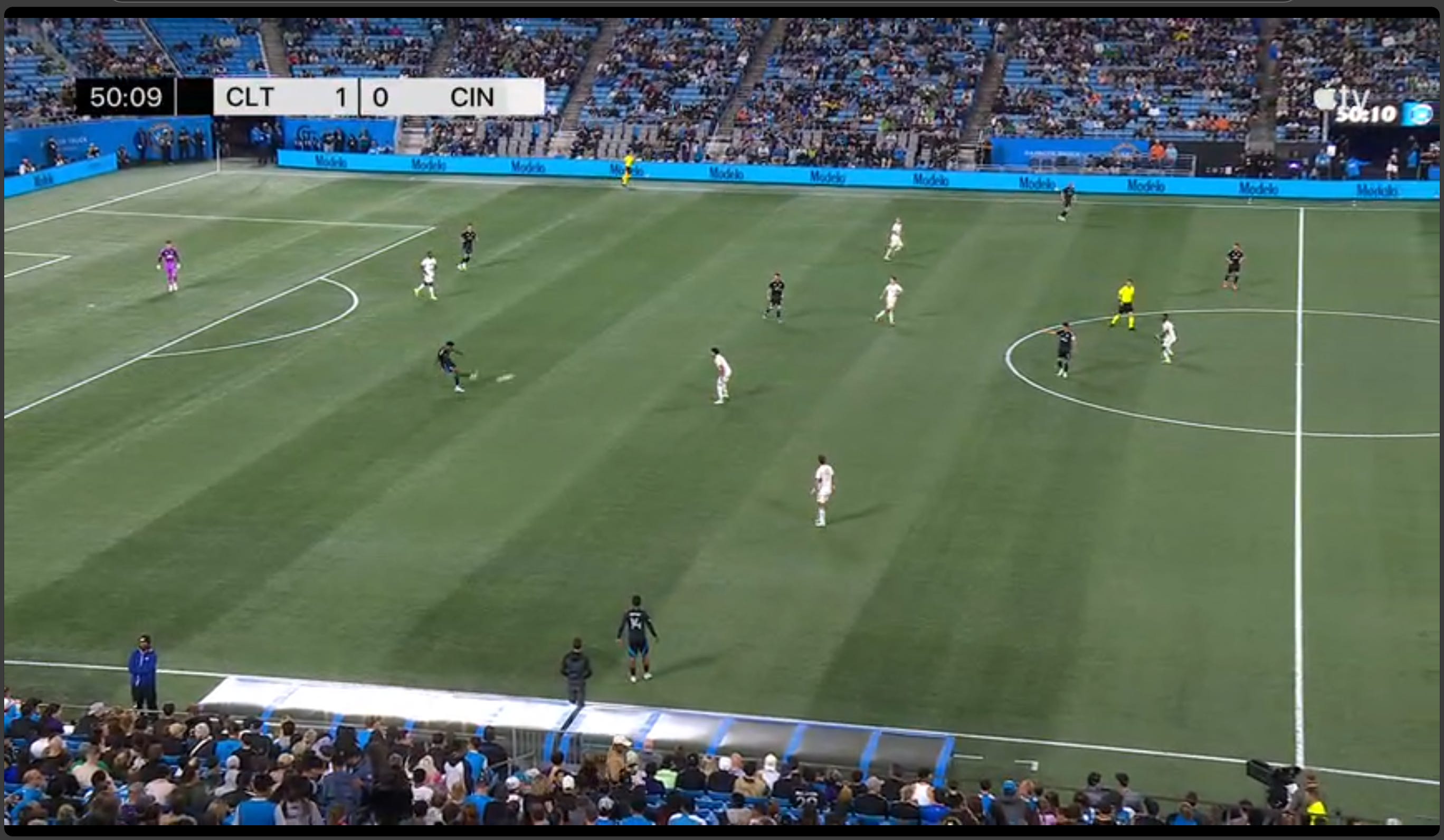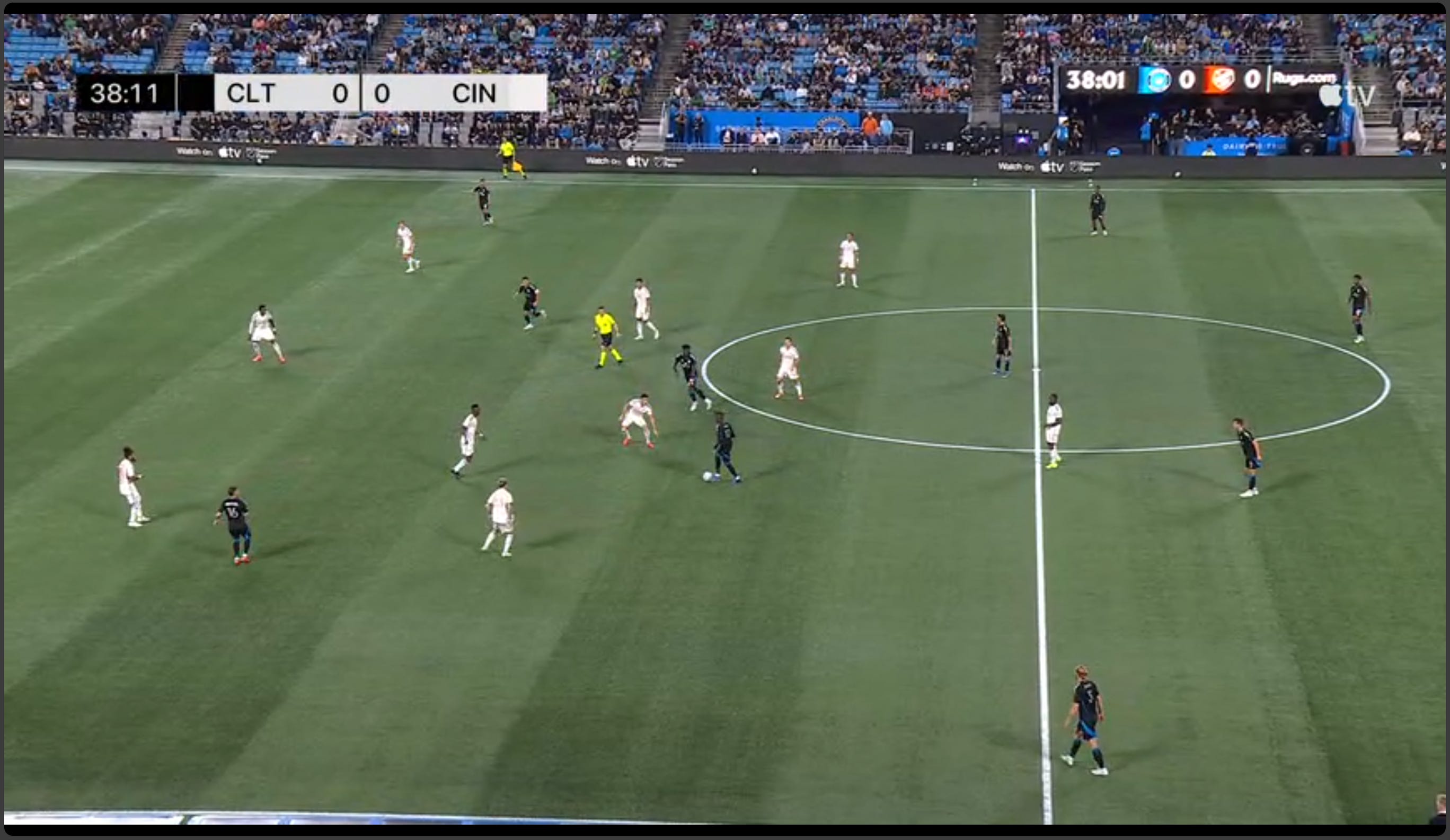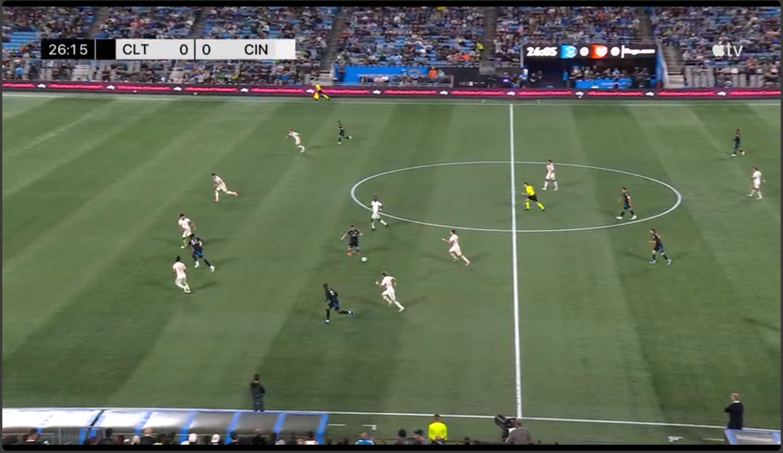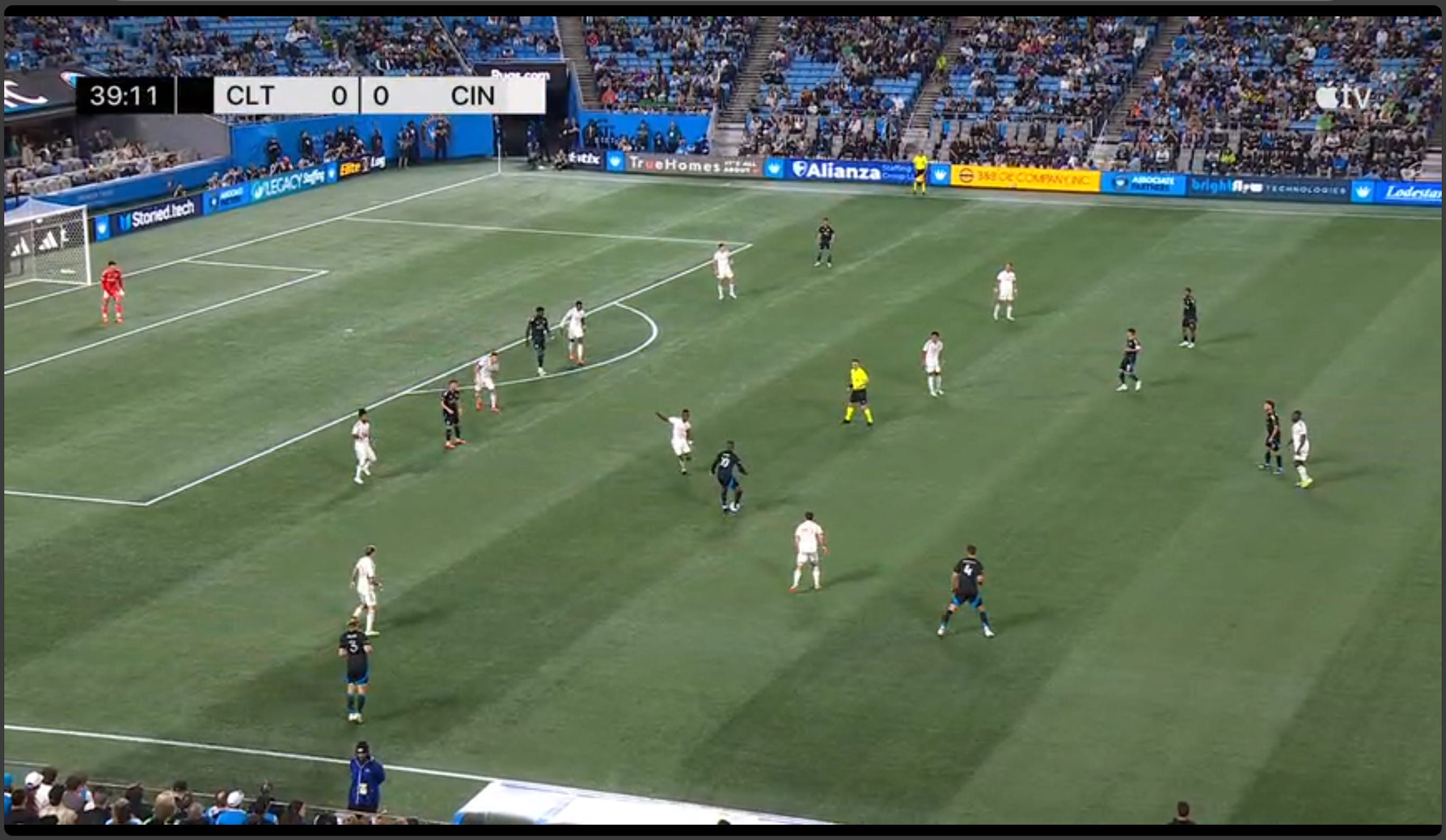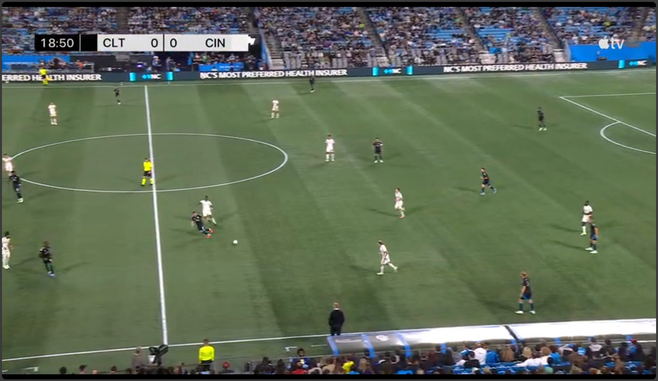Malanda receives the ball and has no pressure on him and plenty of time to survey the field. As Cincy sets their defense, Nwobodo is central near Westwood and Biel finds open space on the far side.