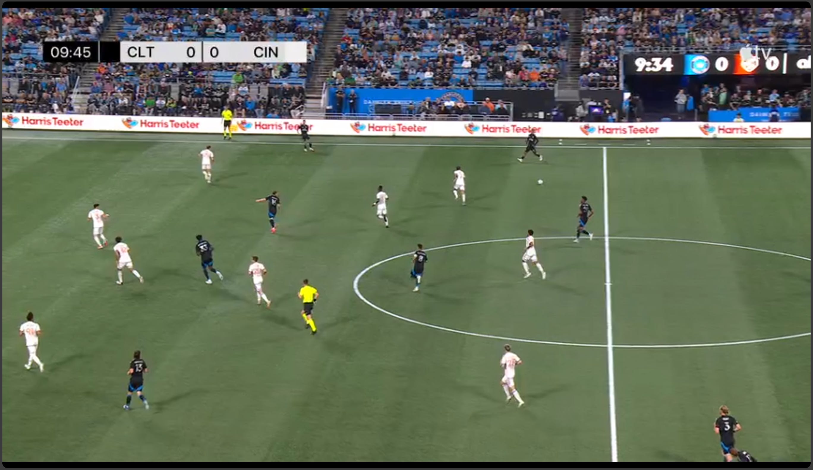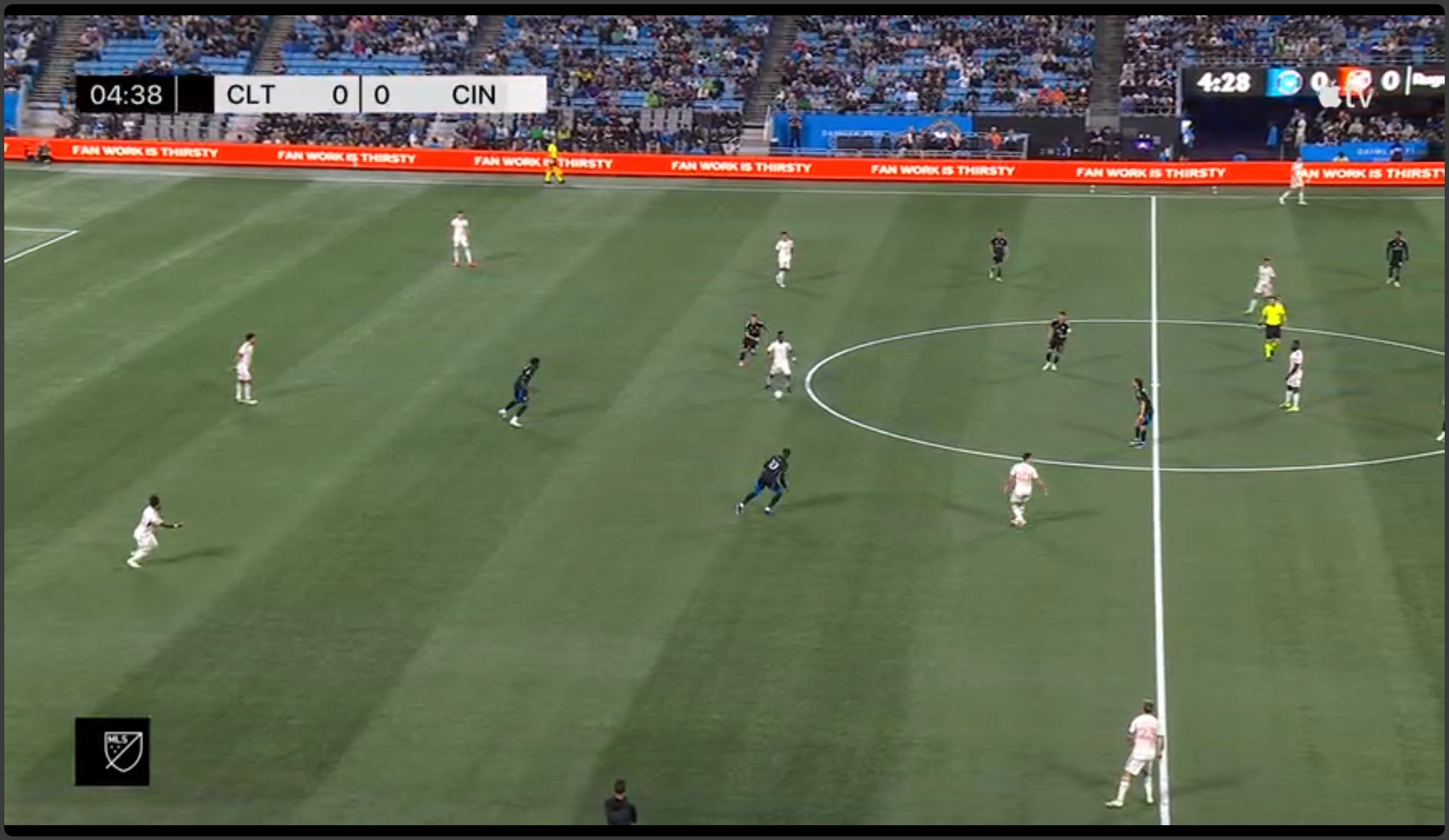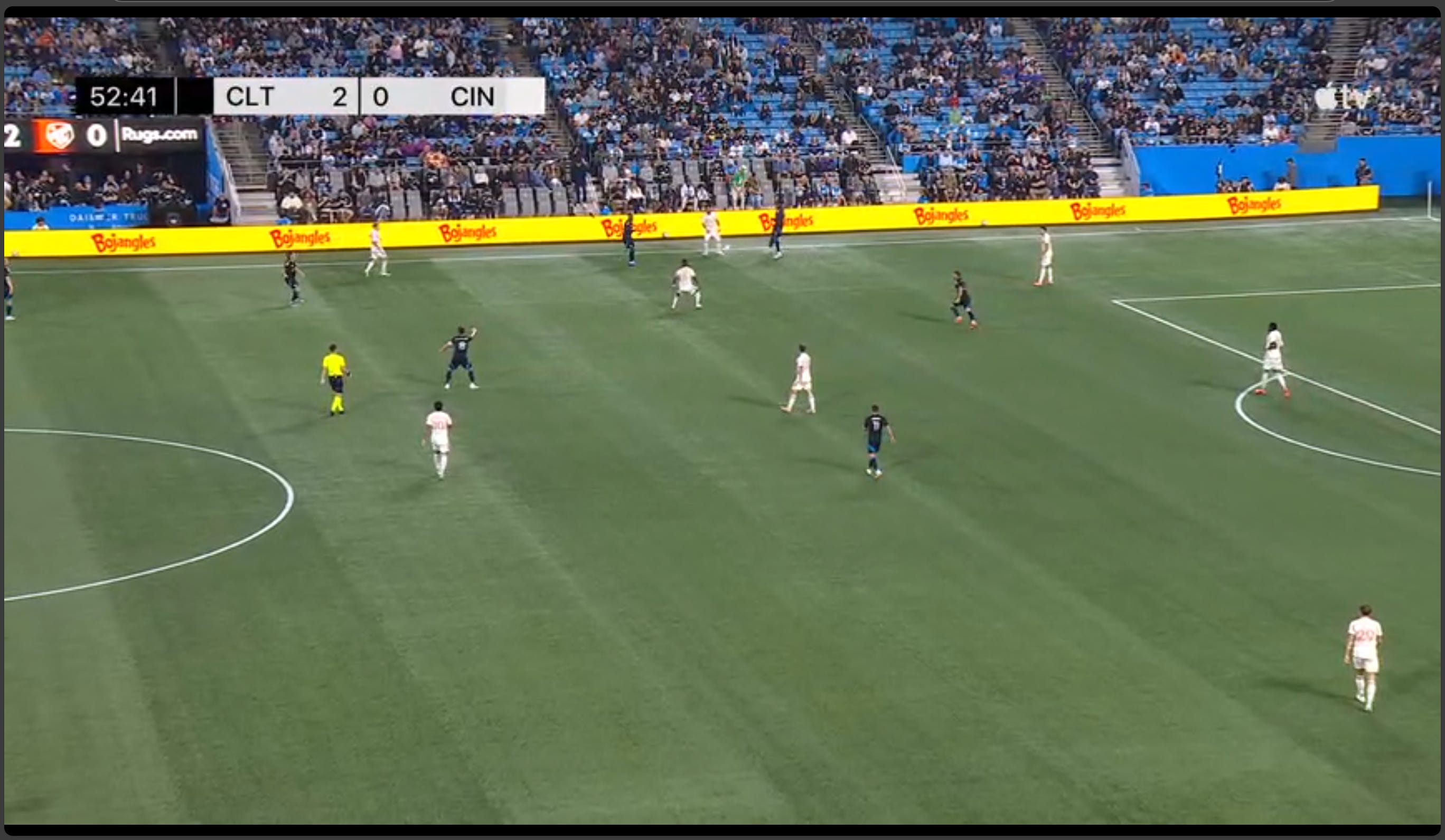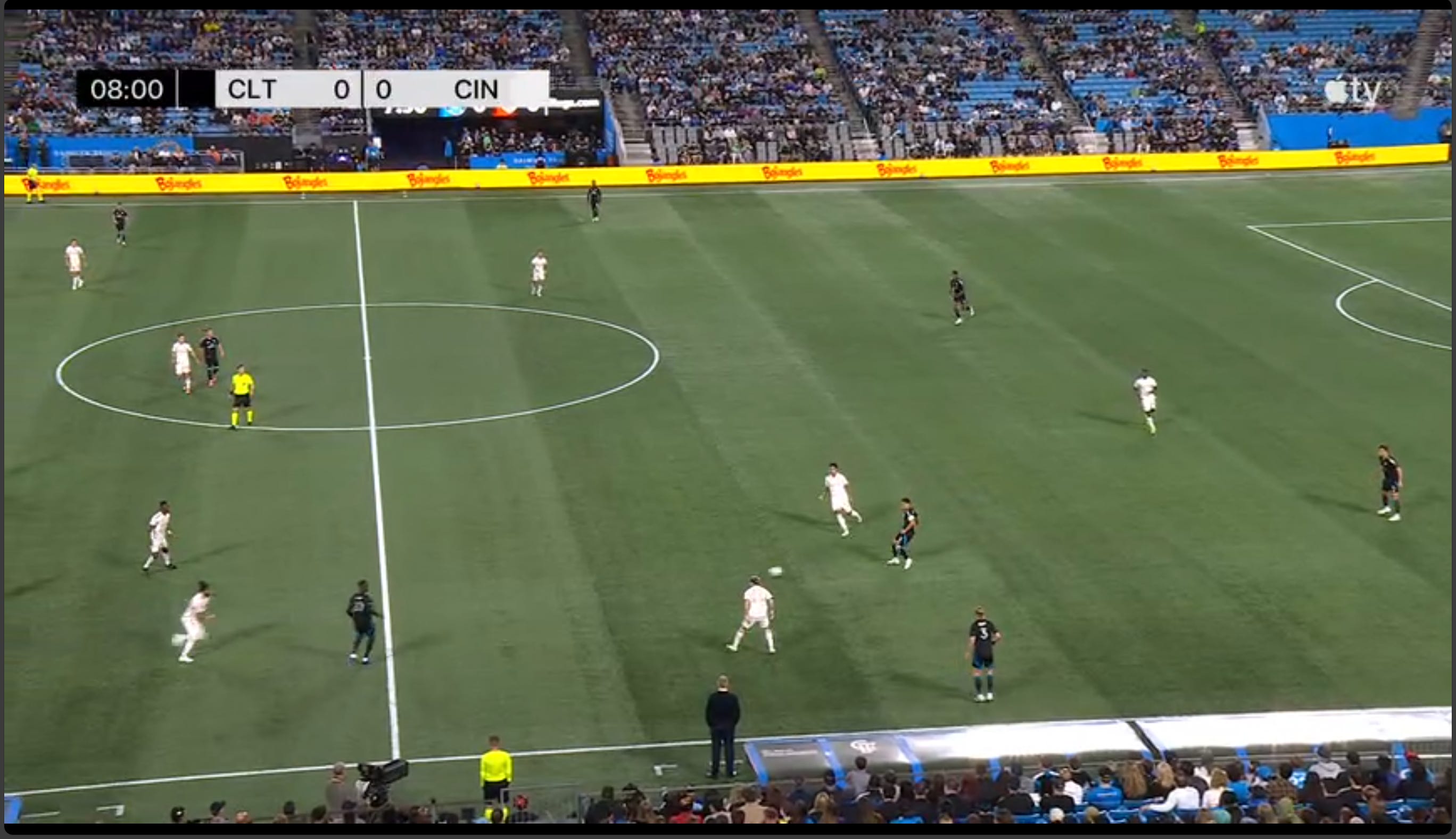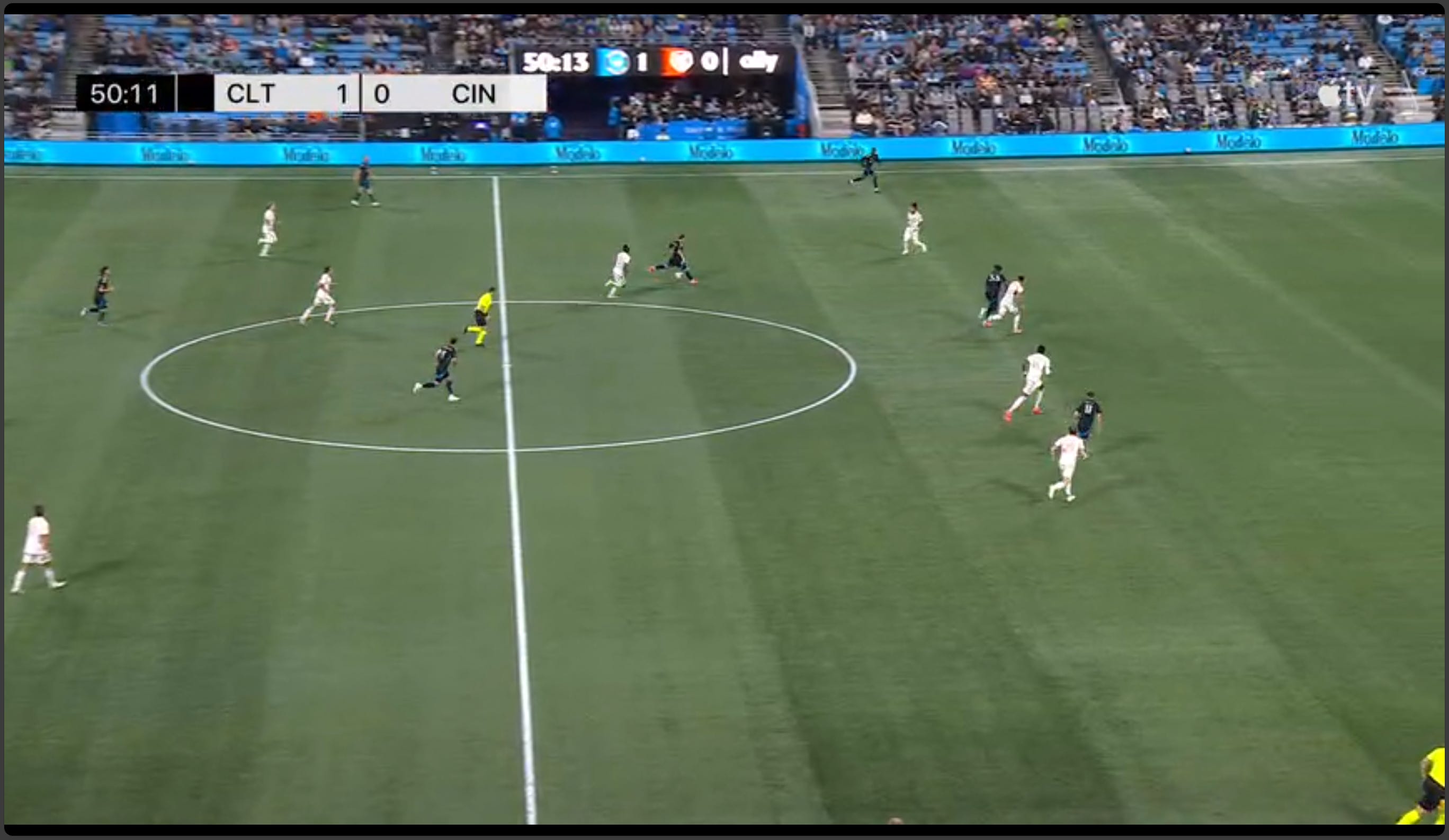 Malanda receives the ball and has no pressure on him and plenty of time to survey the field. As Cincy sets their defense, Nwobodo is central near Westwood and Biel finds open space on the far side.