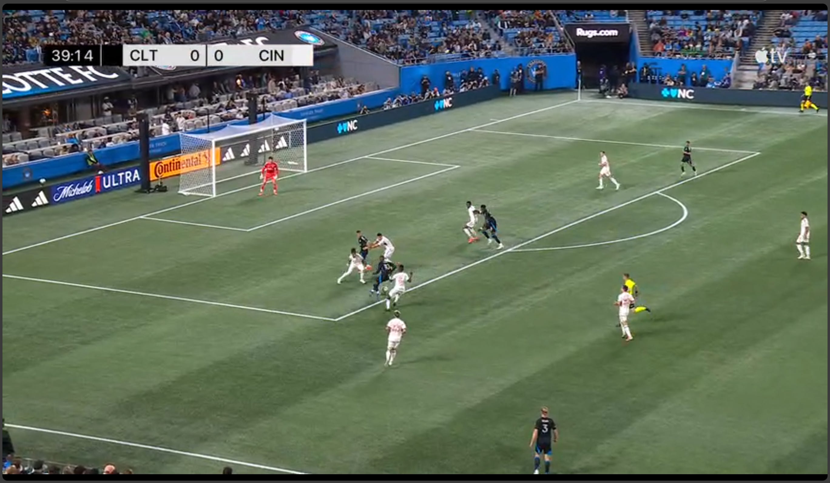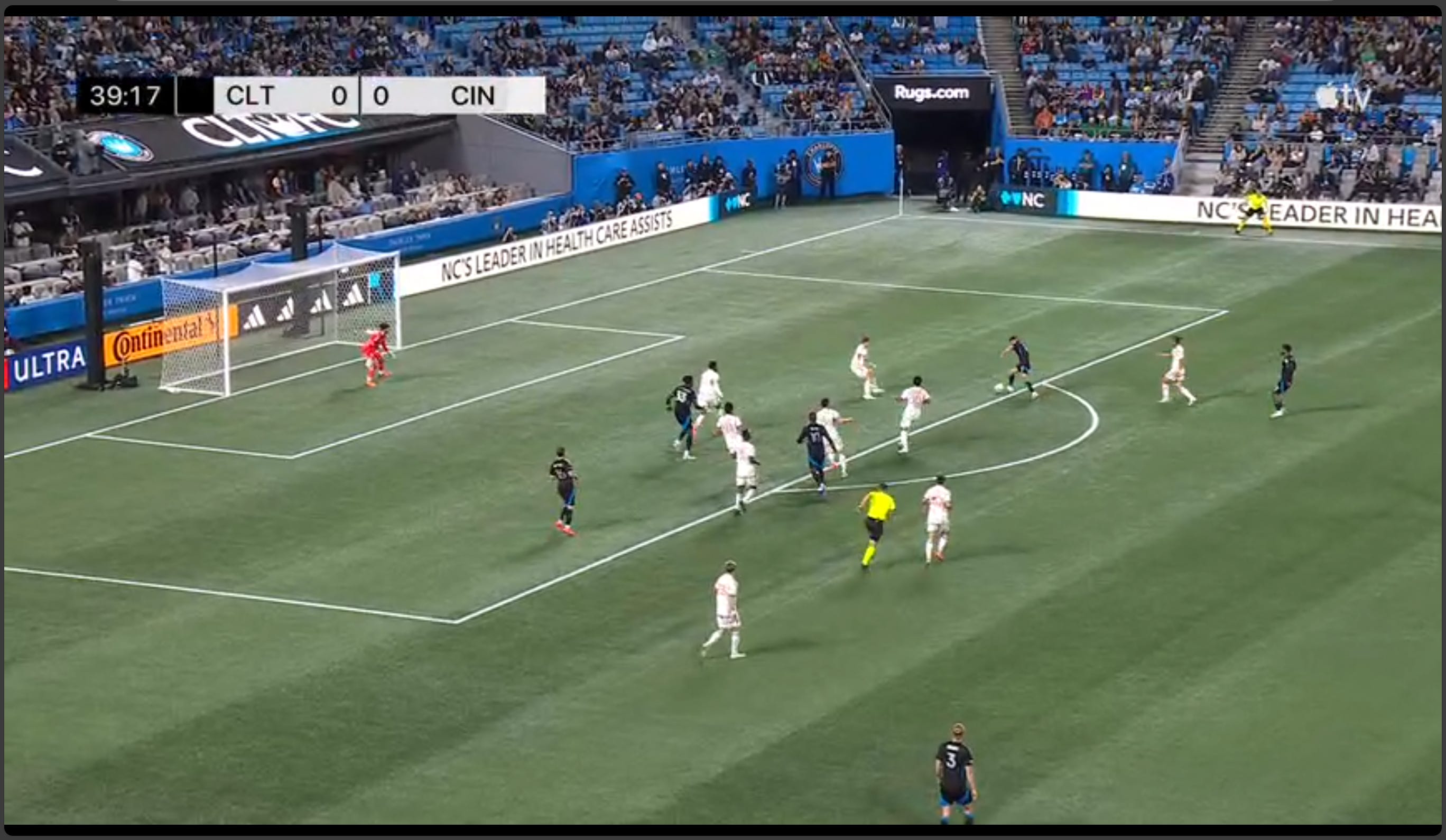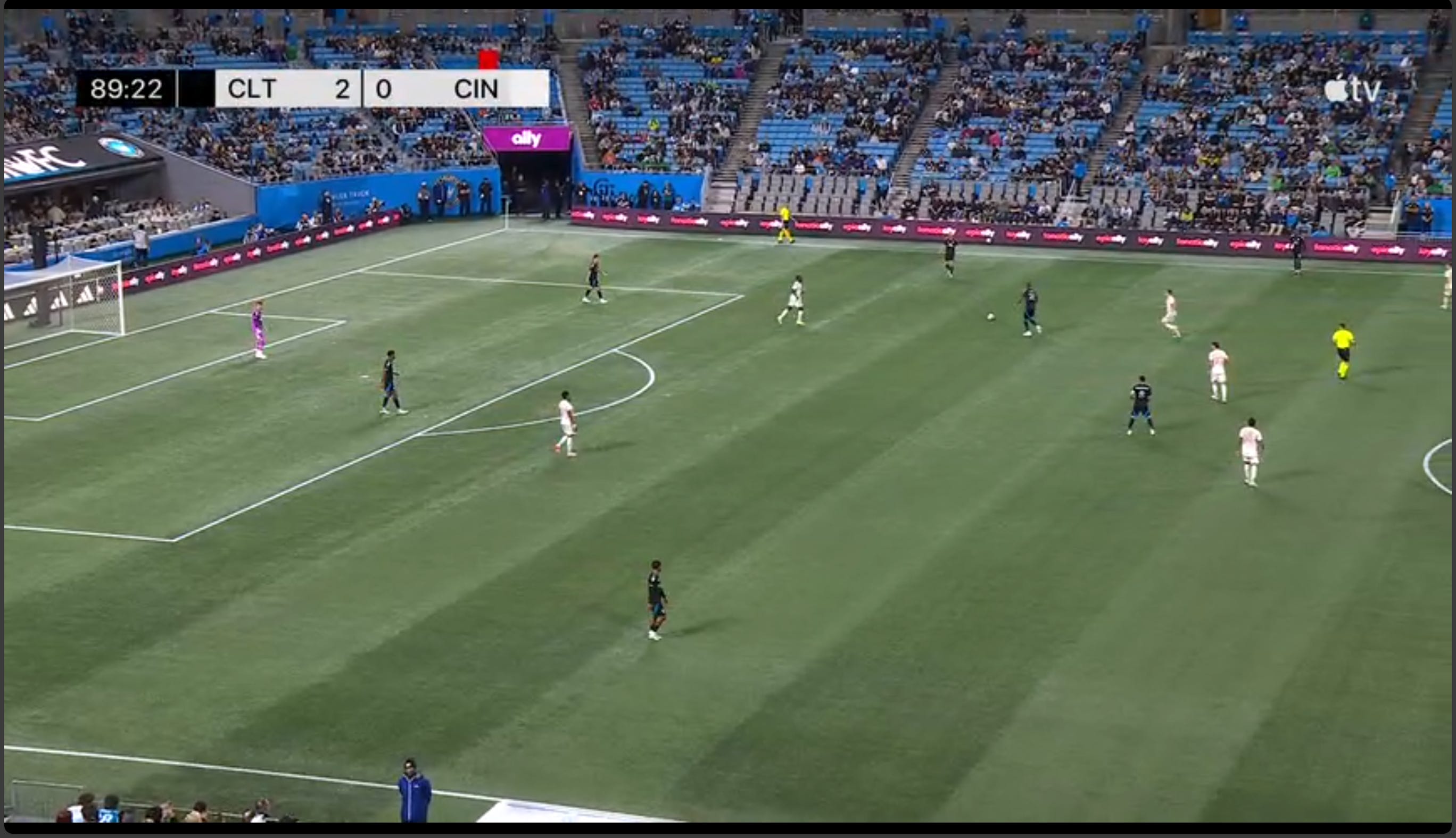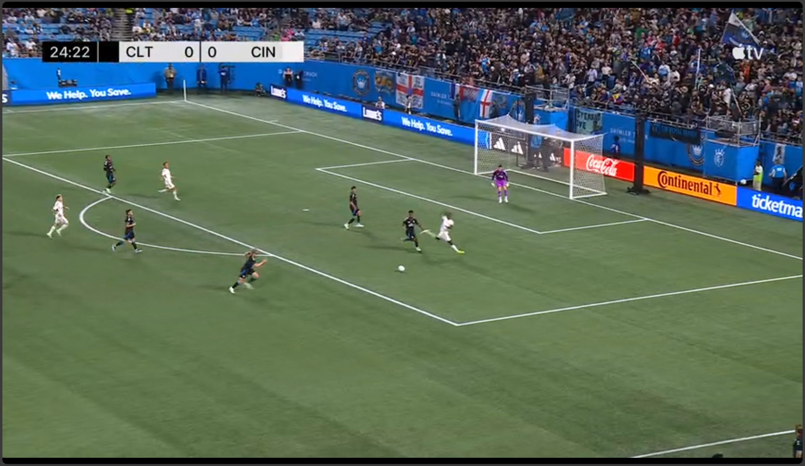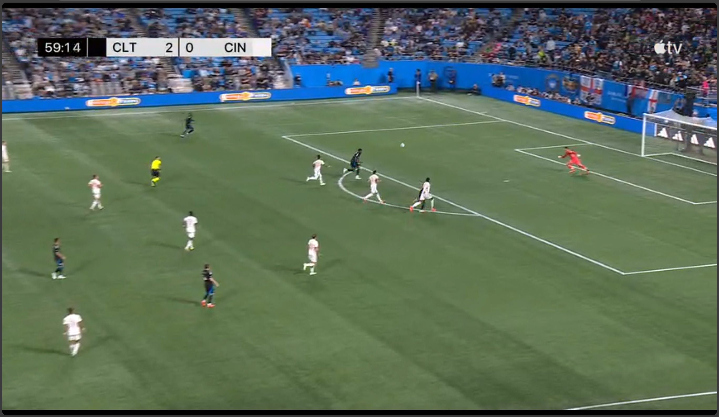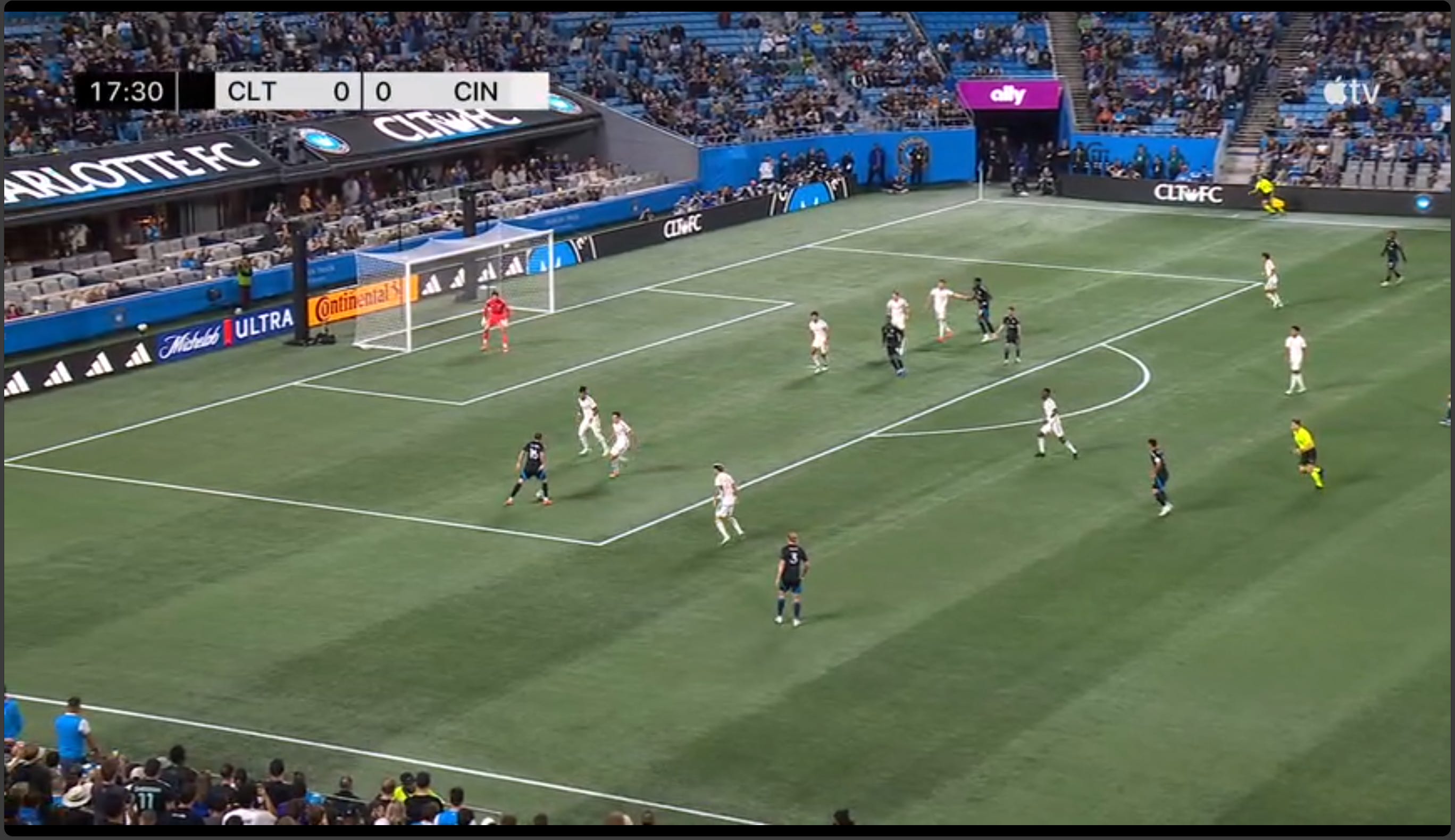 Malanda receives the ball and has no pressure on him and plenty of time to survey the field. As Cincy sets their defense, Nwobodo is central near Westwood and Biel finds open space on the far side.