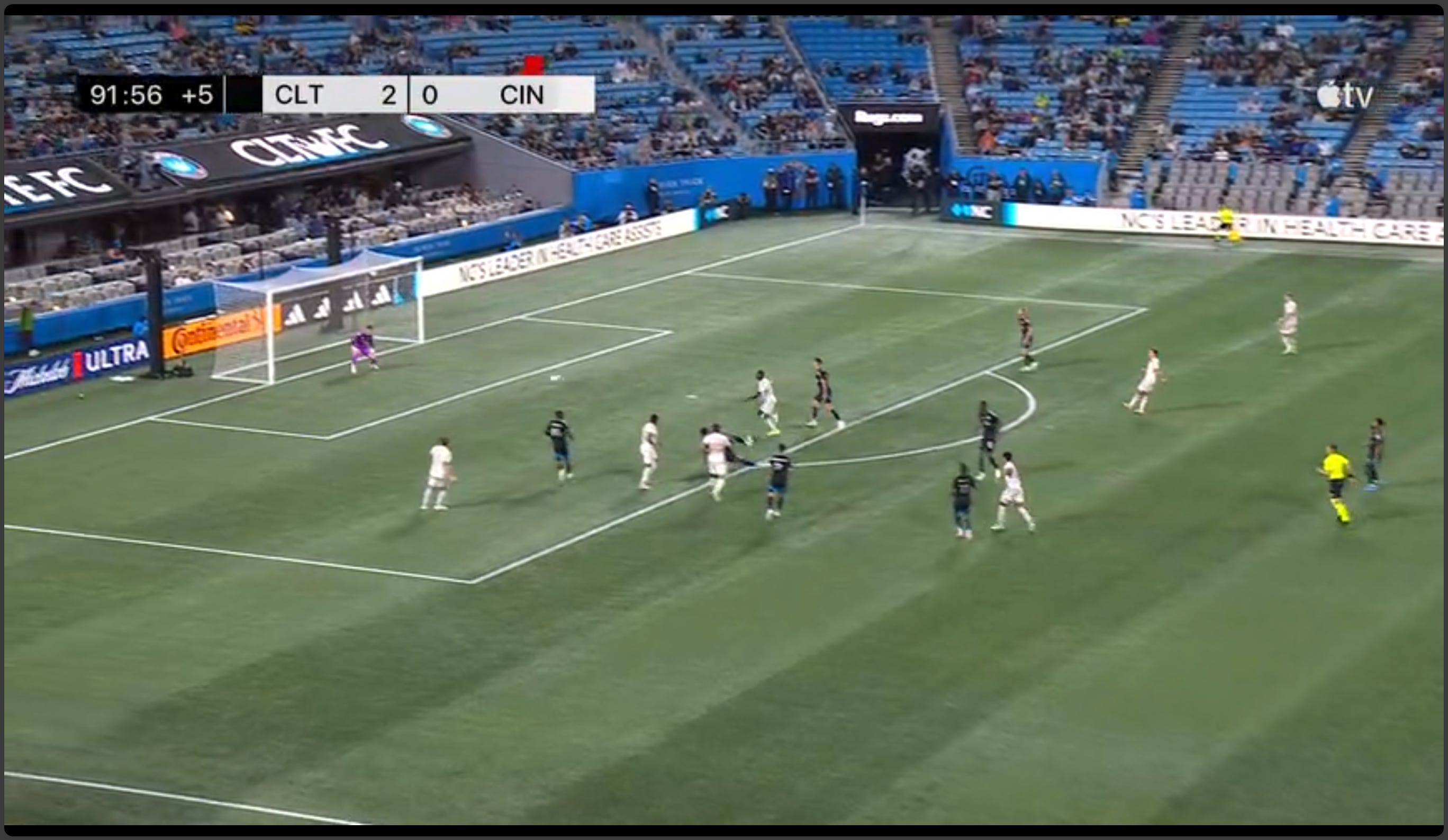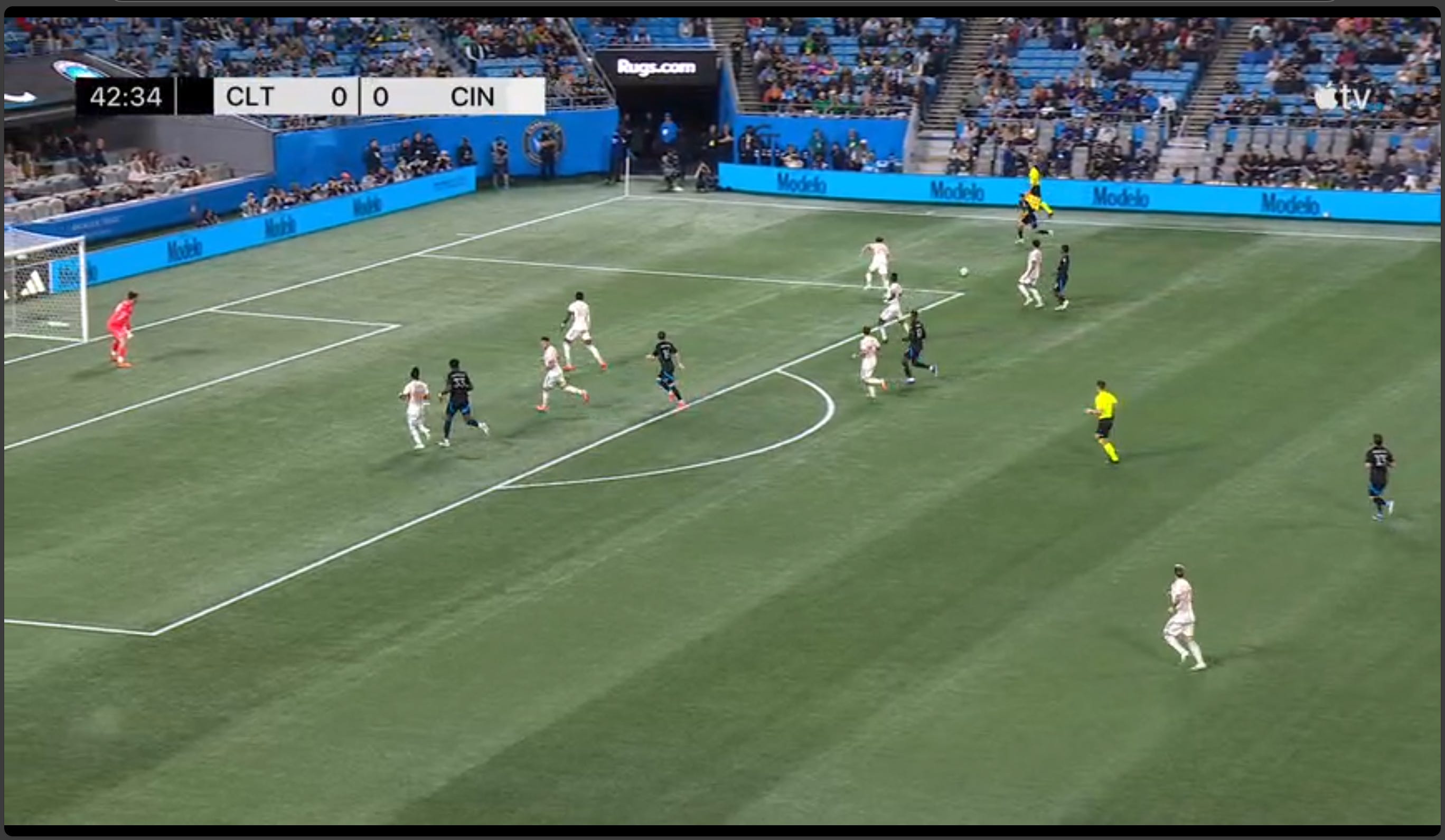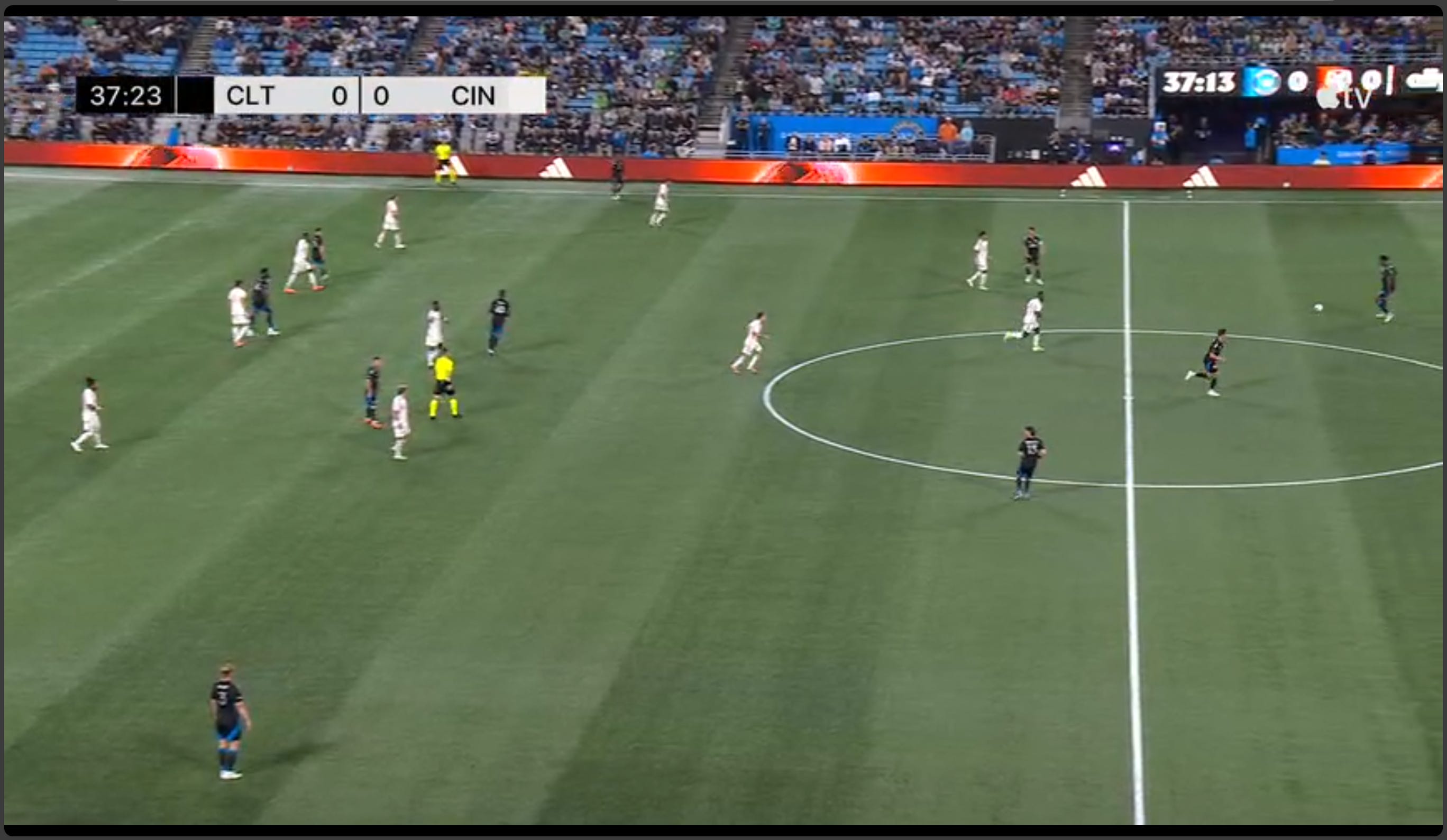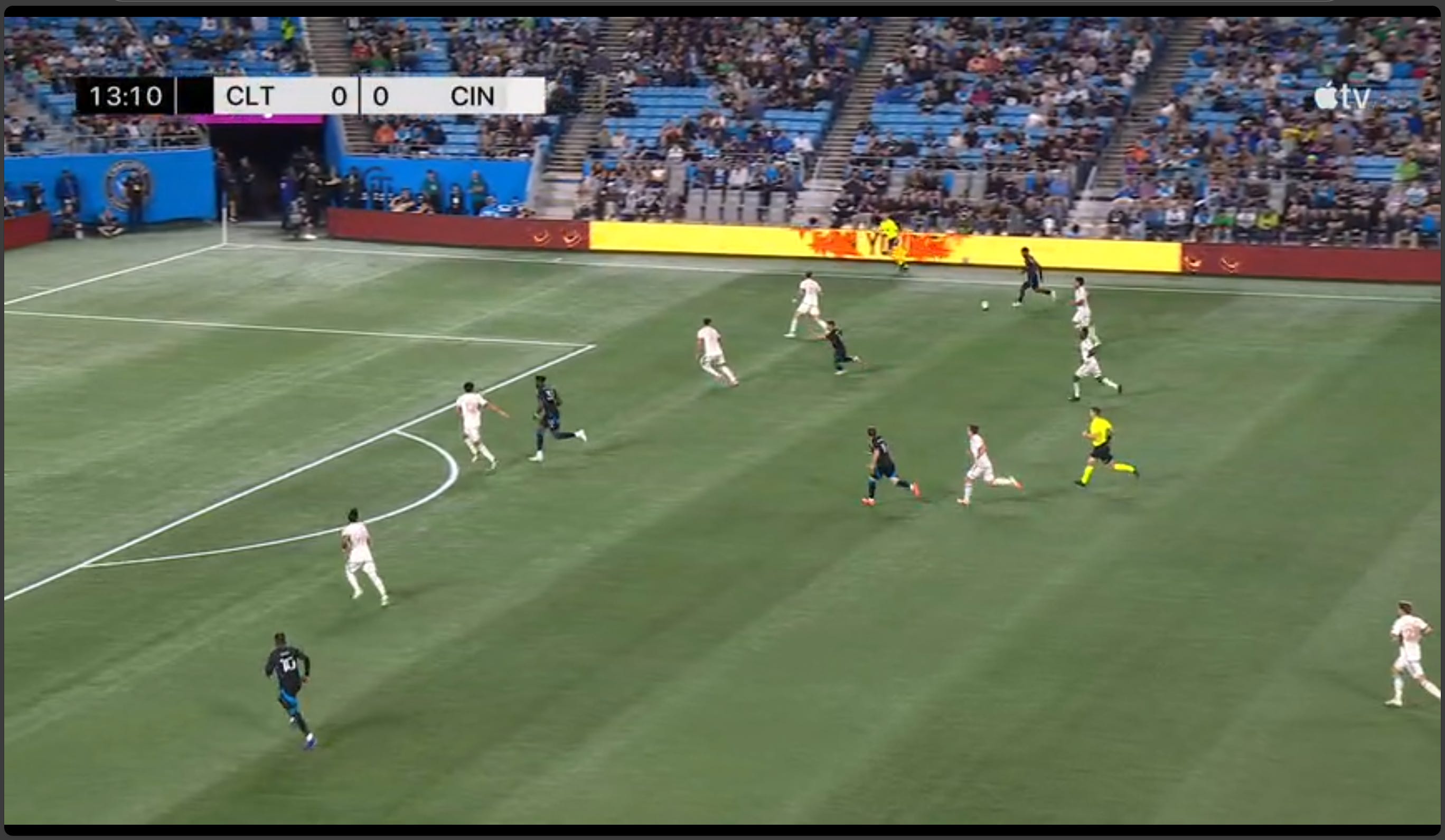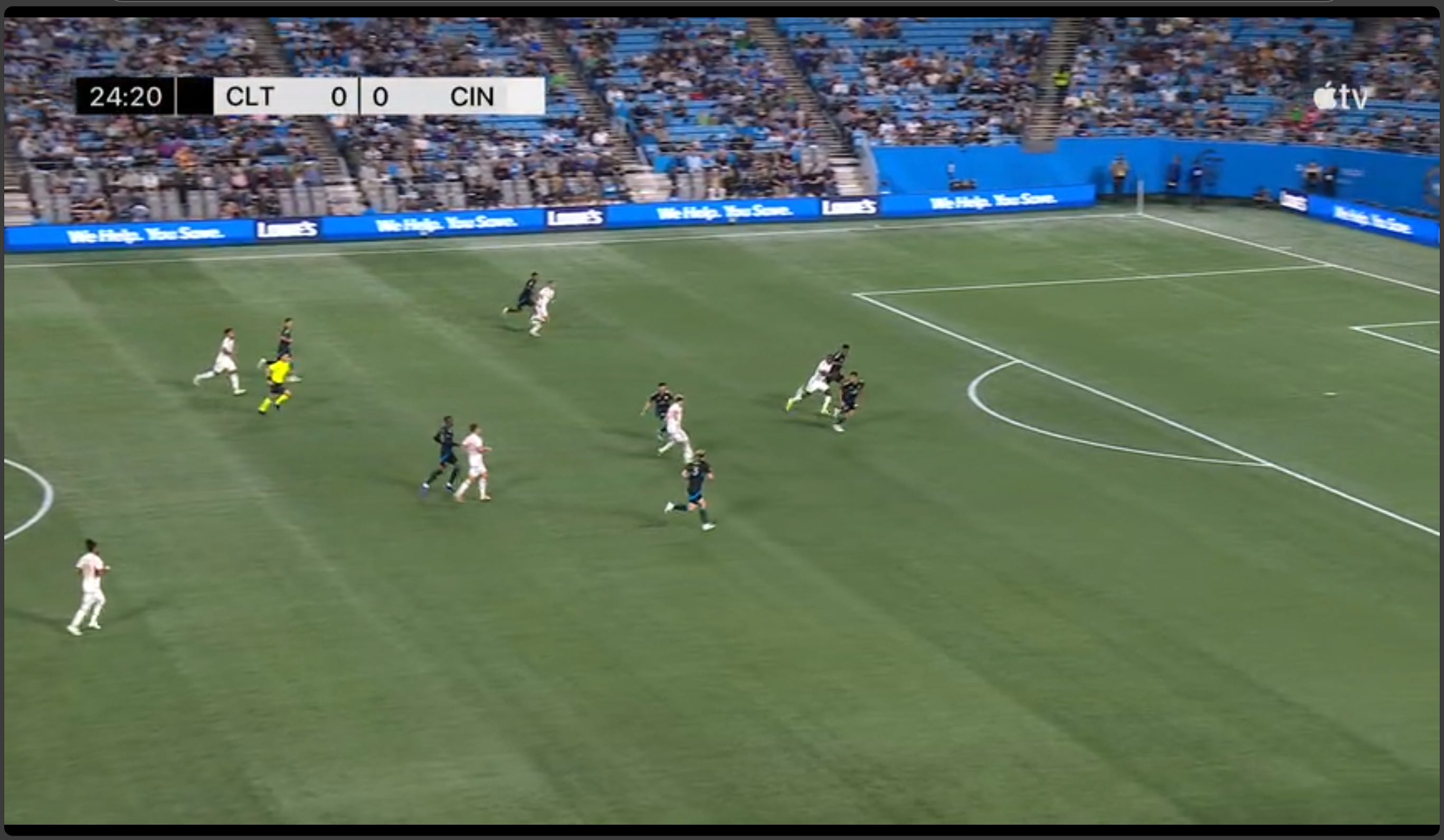 Malanda receives the ball and has no pressure on him and plenty of time to survey the field. As Cincy sets their defense, Nwobodo is central near Westwood and Biel finds open space on the far side.