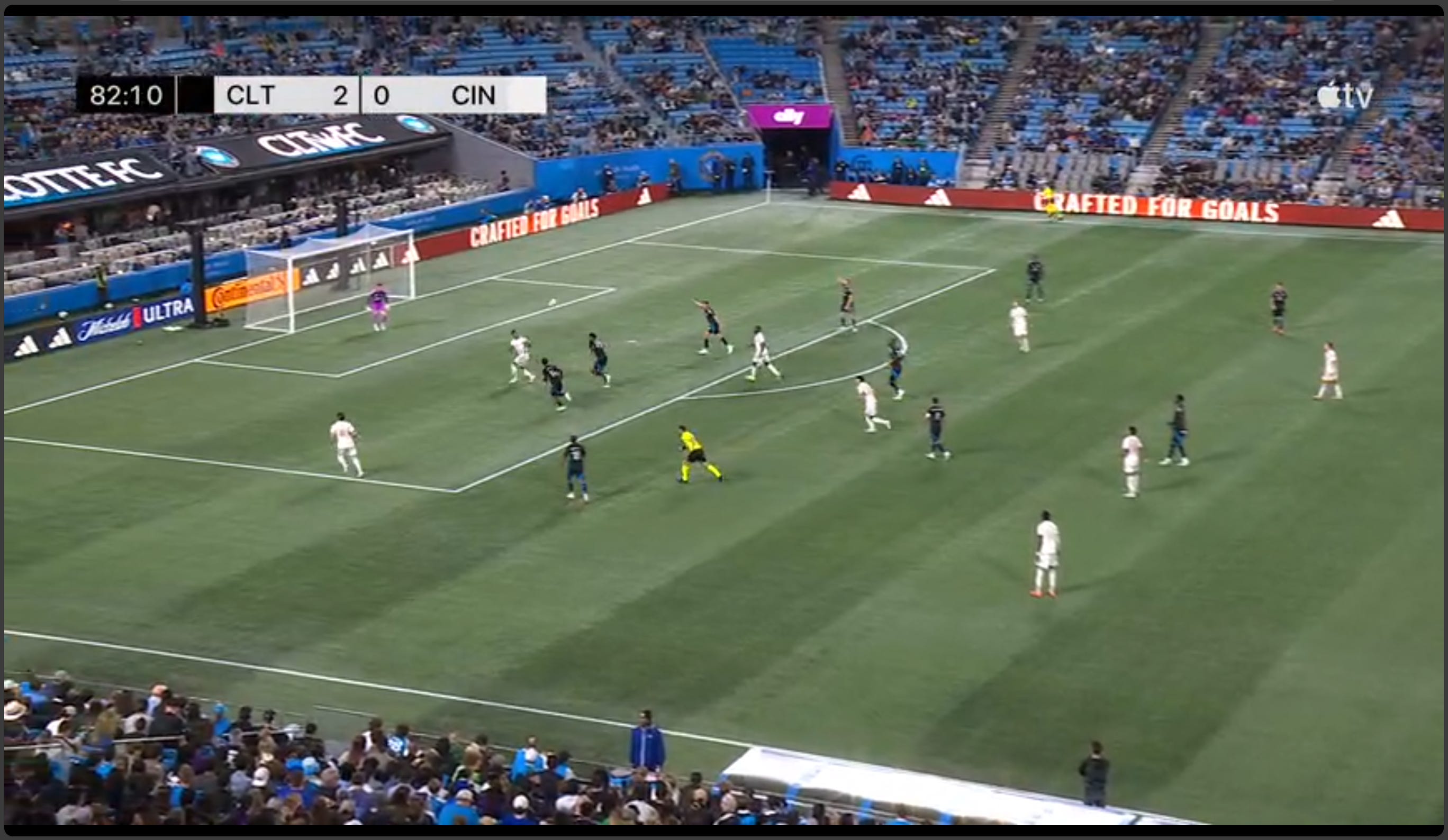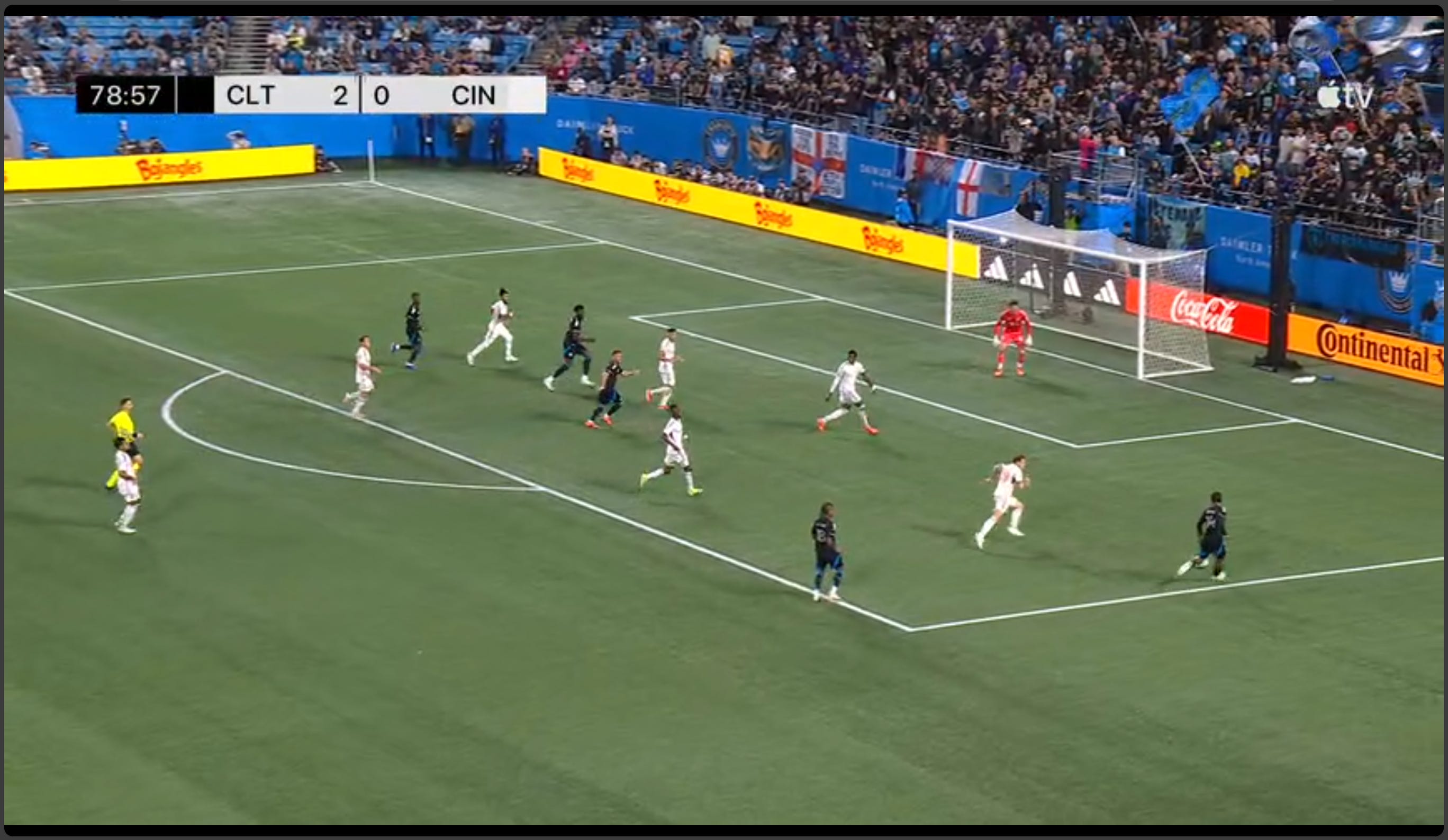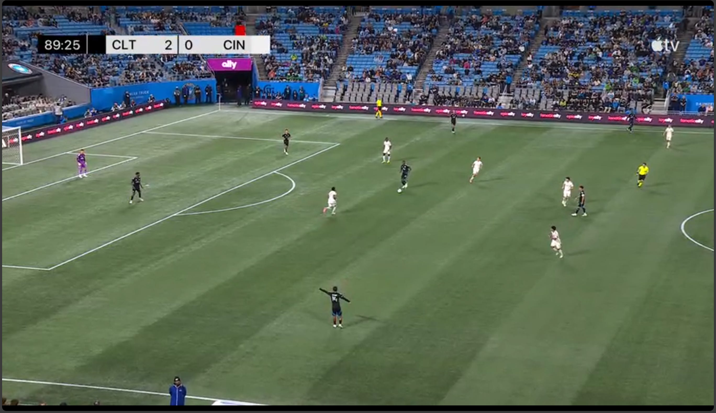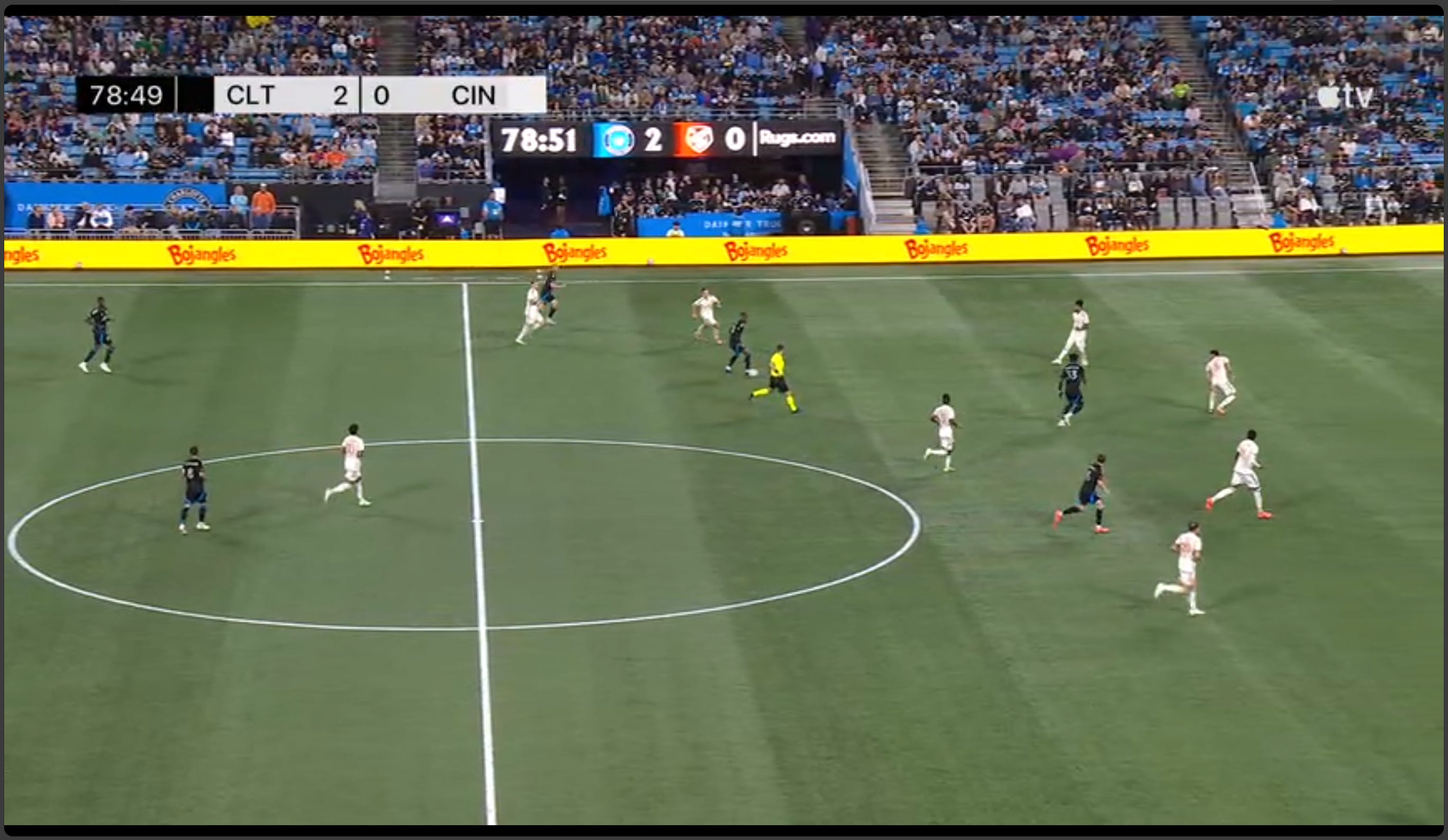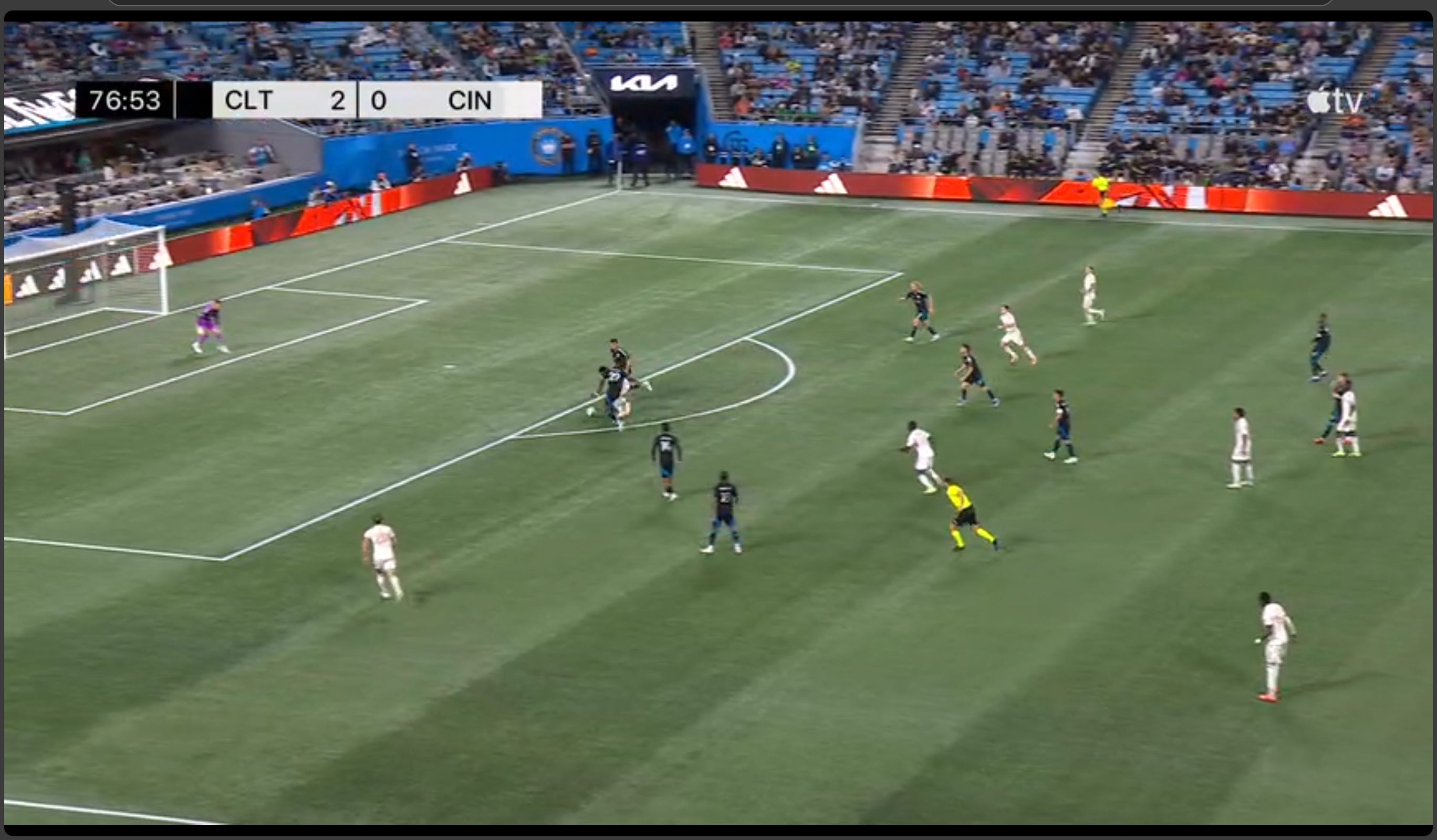 Malanda receives the ball and has no pressure on him and plenty of time to survey the field. As Cincy sets their defense, Nwobodo is central near Westwood and Biel finds open space on the far side.