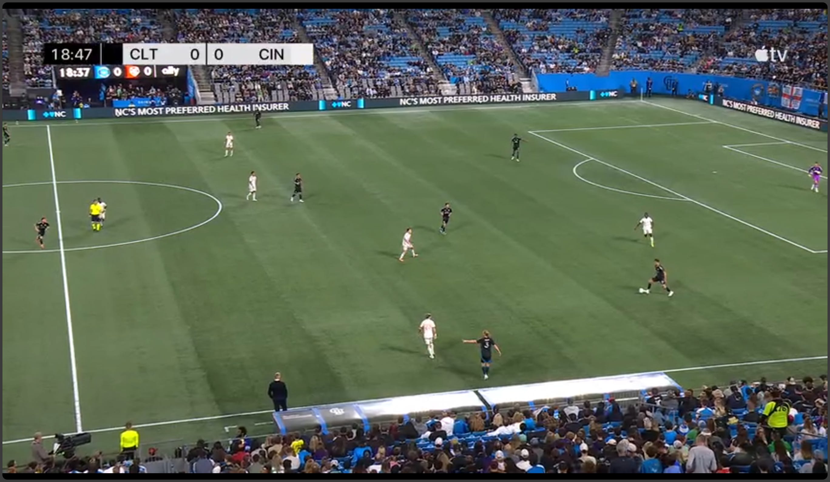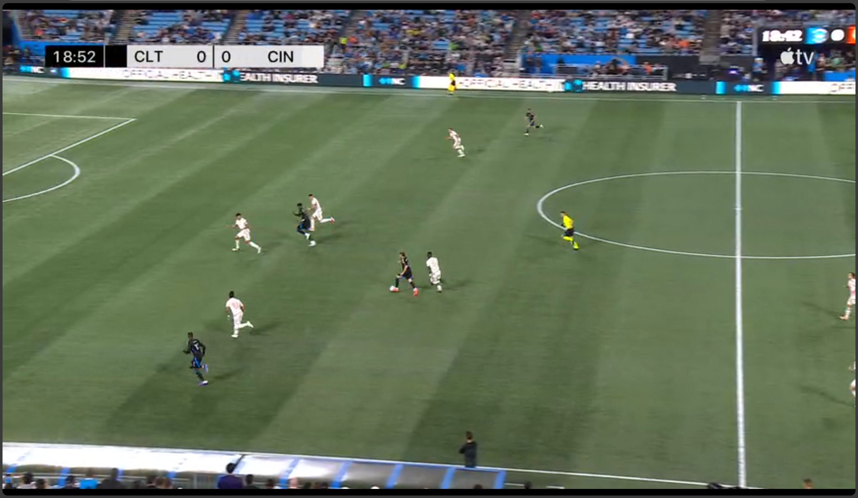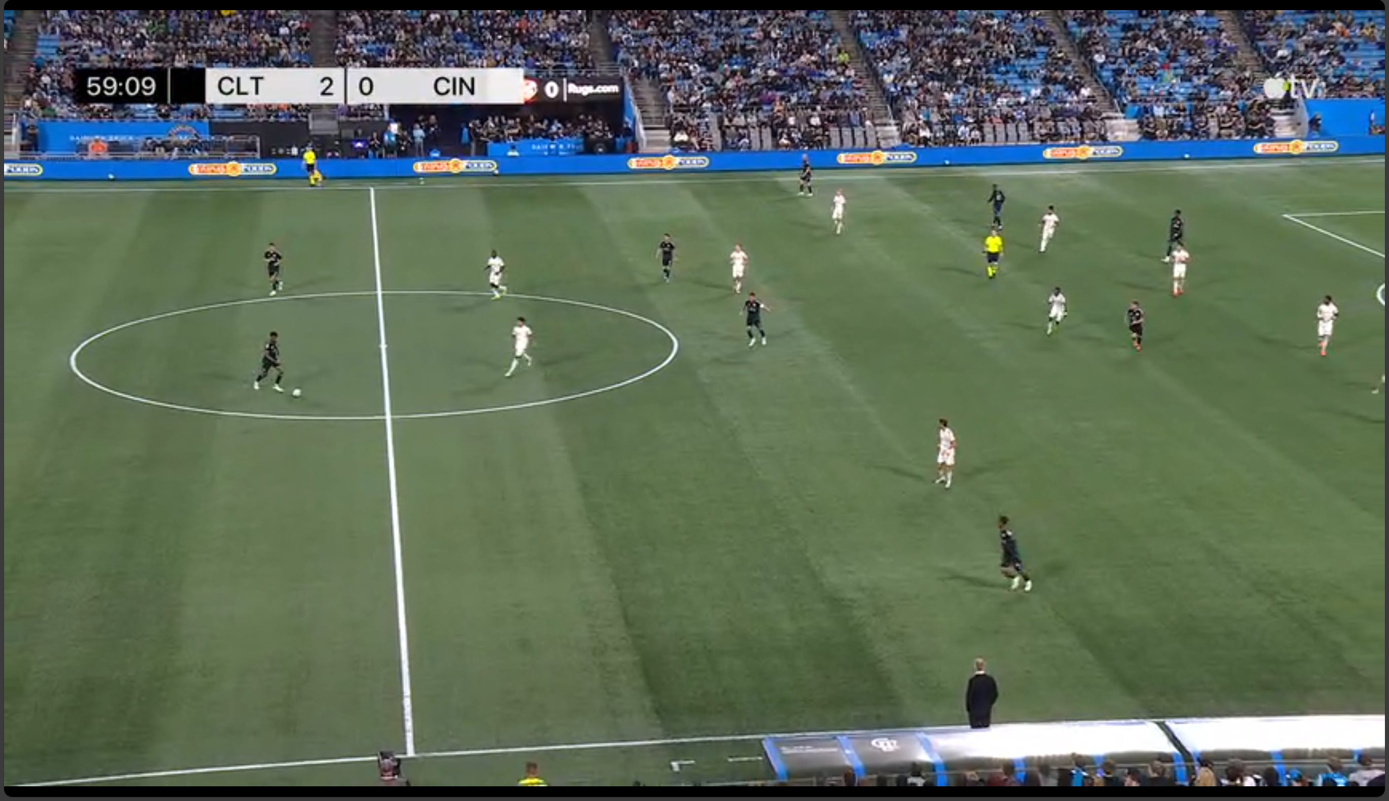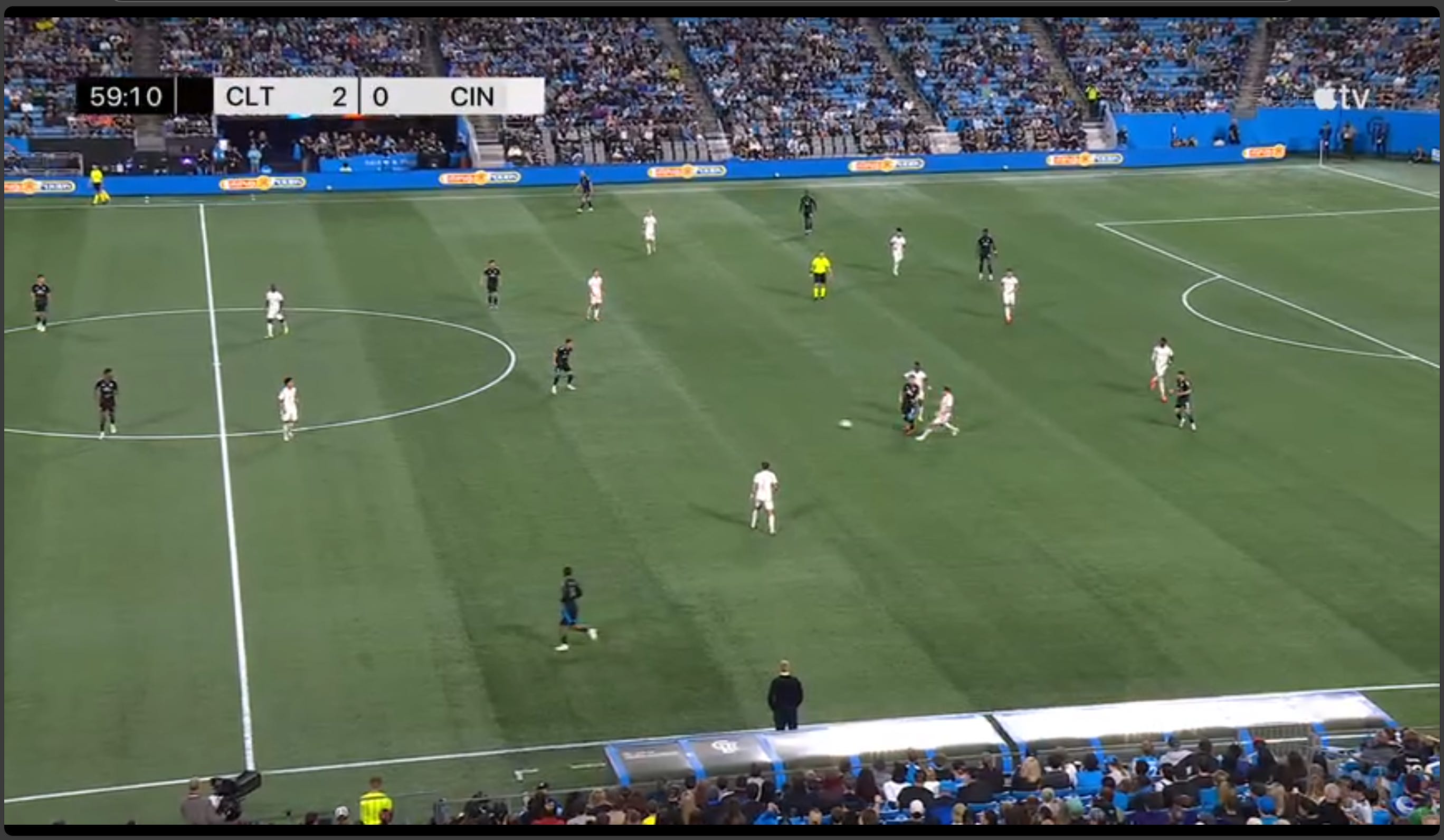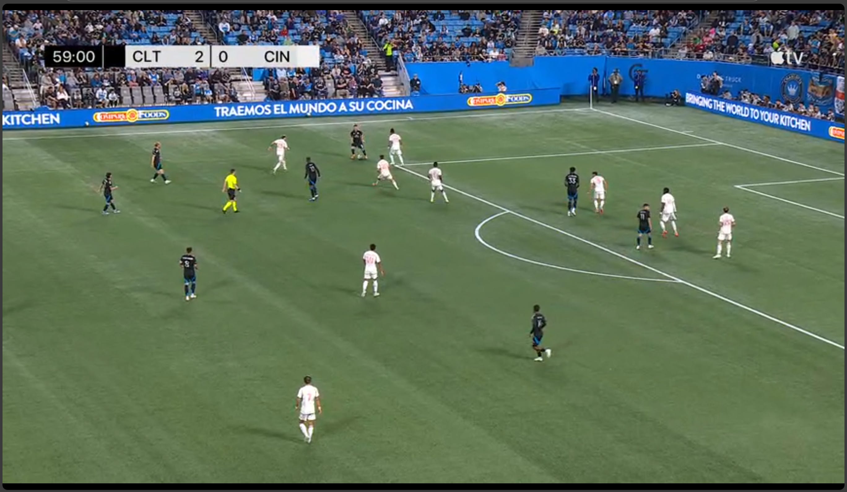 Charlotte’s 2-0 win over FC Cincinati was their best game so far this season. We were finally able to build up through our opponent’s mid-block and it allowed our attackers (particularly Biel and Agyemang) to cause problems. But as we analyze what made Charlotte successful in this game, I also think about what is repeatable and is an improvement on our part, and what was game specific. FC Cincinnati’s setup was different than our other 3 opponents creating different opportunities and threats. So, let’s dive into the film and understand how Charlotte played through the press and how Biel and Agyemang took advantage of it. Then we are going to show how both Abada and Zaha have adjusted their positioning on each wing. Last, we will look at our defense and how our back 4 and Kahlina had to bail out a poor pressing performance. But first…