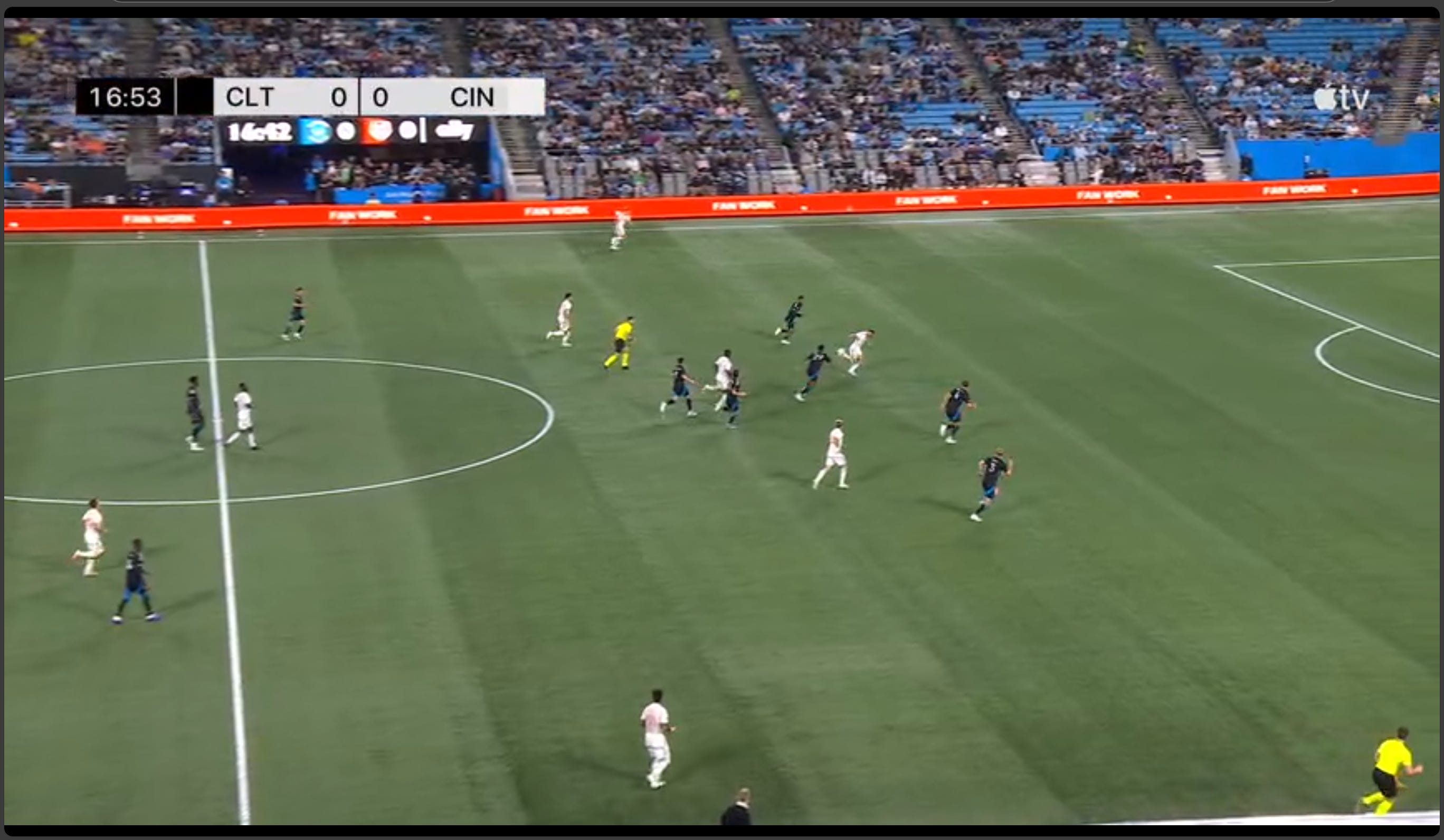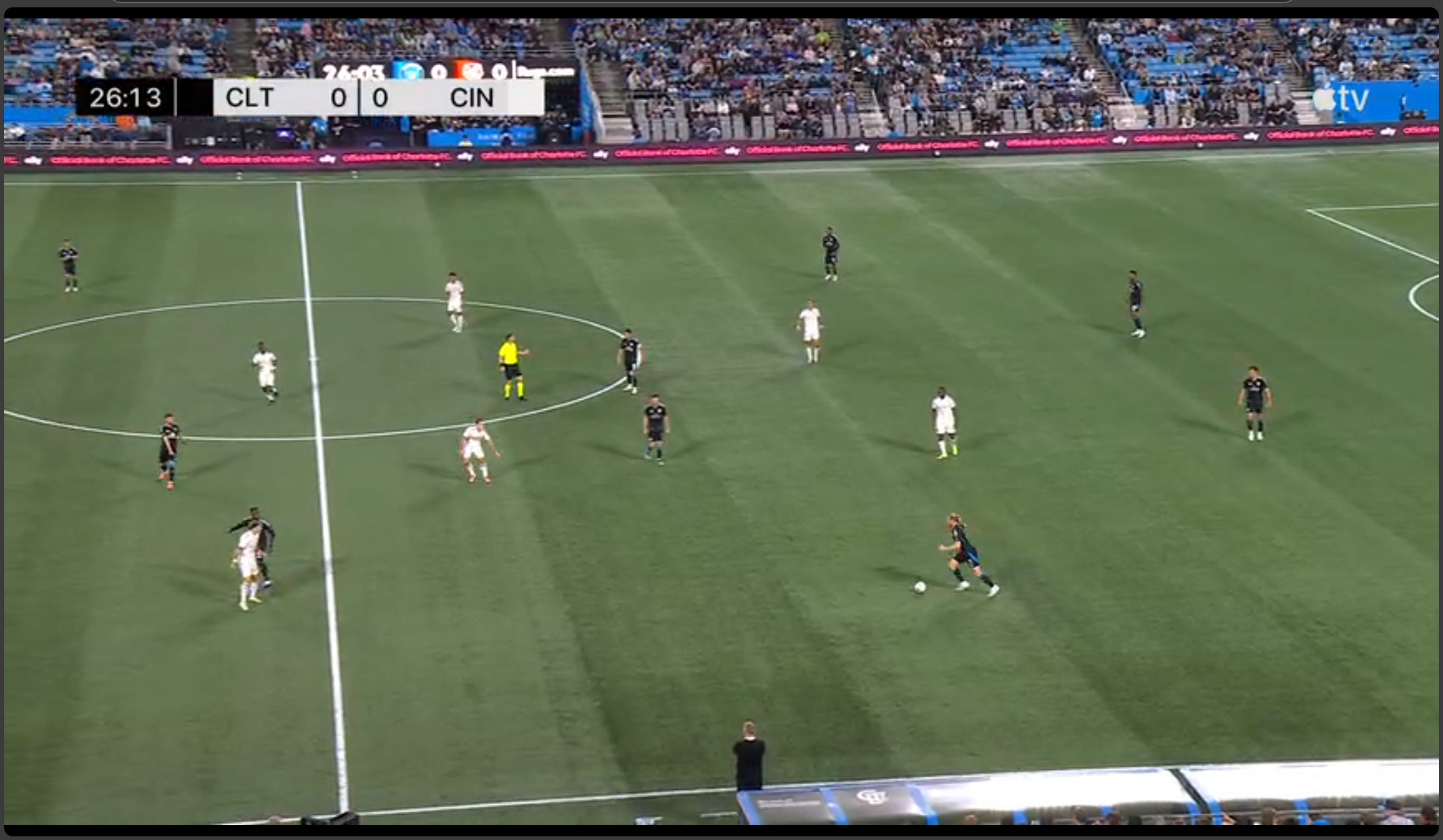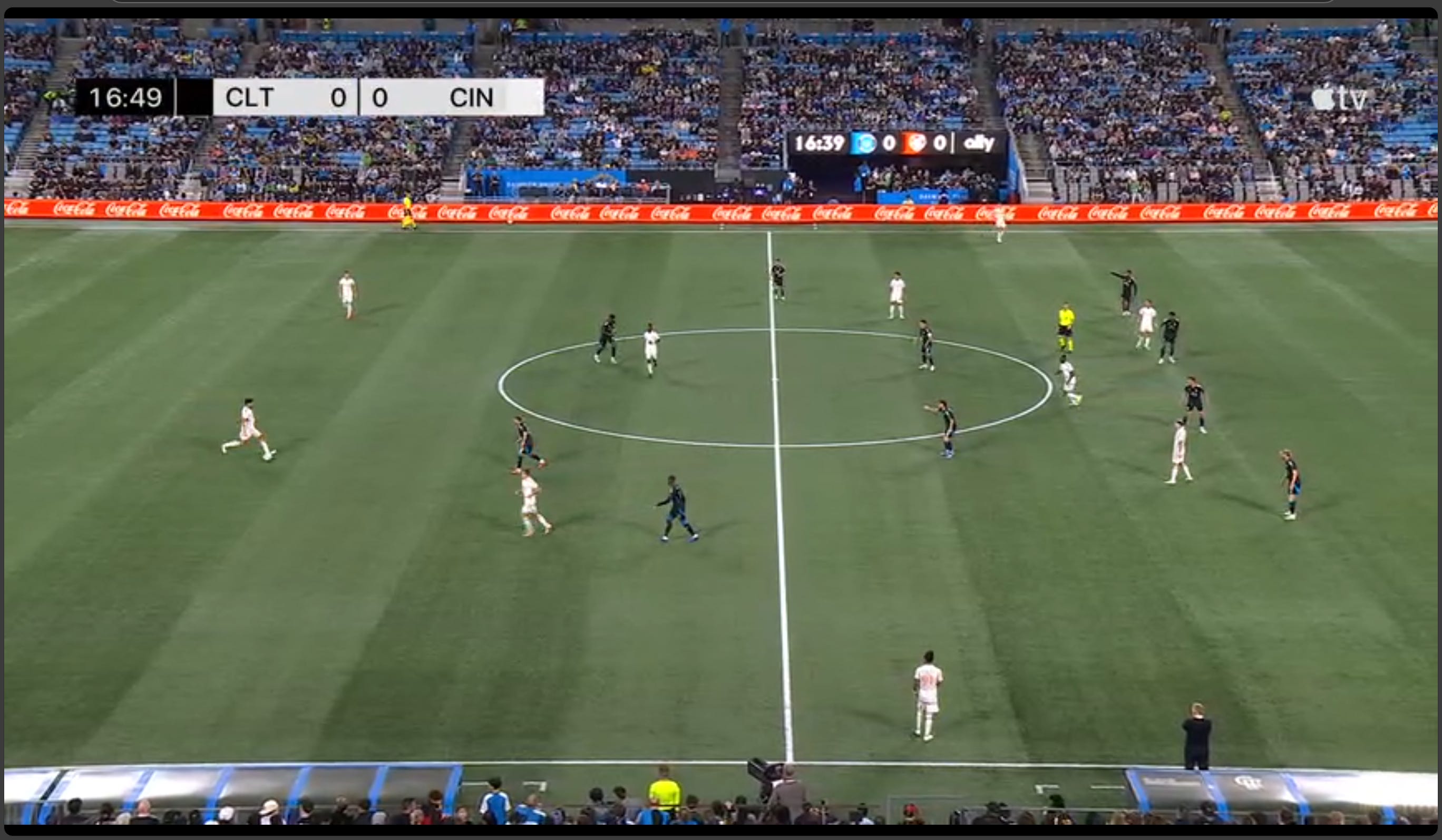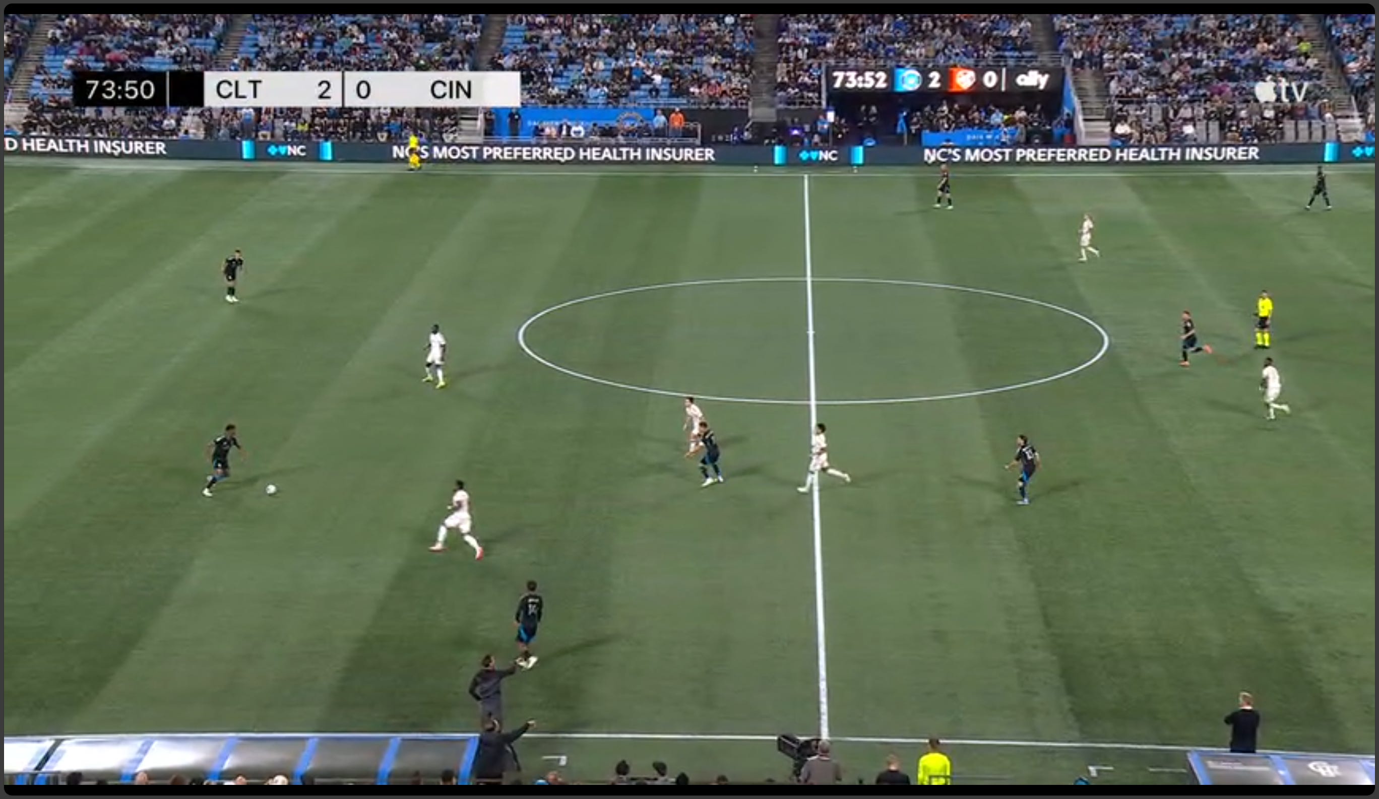 Charlotte’s 2-0 win over FC Cincinati was their best game so far this season. We were finally able to build up through our opponent’s mid-block and it allowed our attackers (particularly Biel and Agyemang) to cause problems. But as we analyze what made Charlotte successful in this game, I also think about what is repeatable and is an improvement on our part, and what was game specific. FC Cincinnati’s setup was different than our other 3 opponents creating different opportunities and threats. So, let’s dive into the film and understand how Charlotte played through the press and how Biel and Agyemang took advantage of it. Then we are going to show how both Abada and Zaha have adjusted their positioning on each wing. Last, we will look at our defense and how our back 4 and Kahlina had to bail out a poor pressing performance. But first…