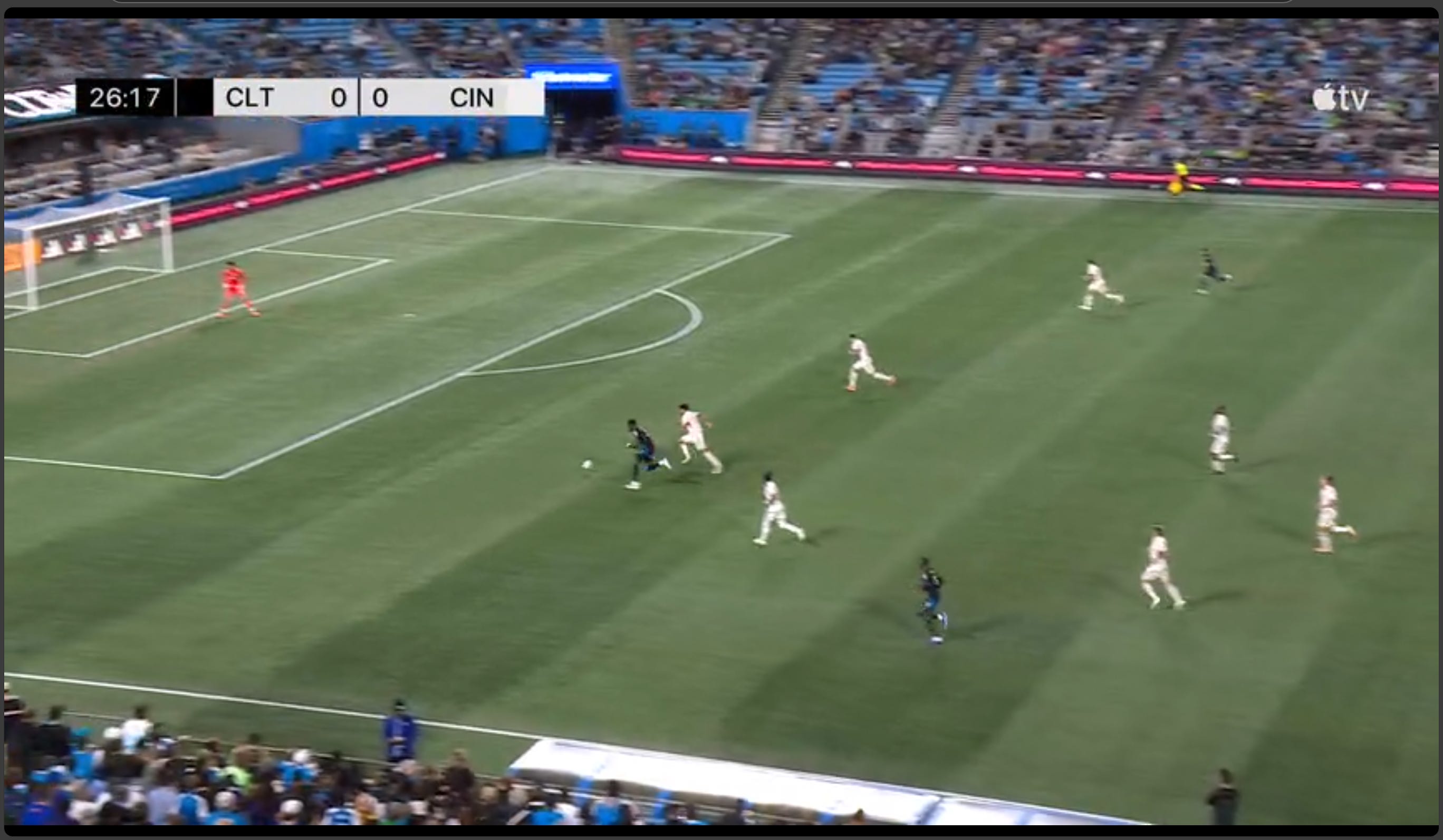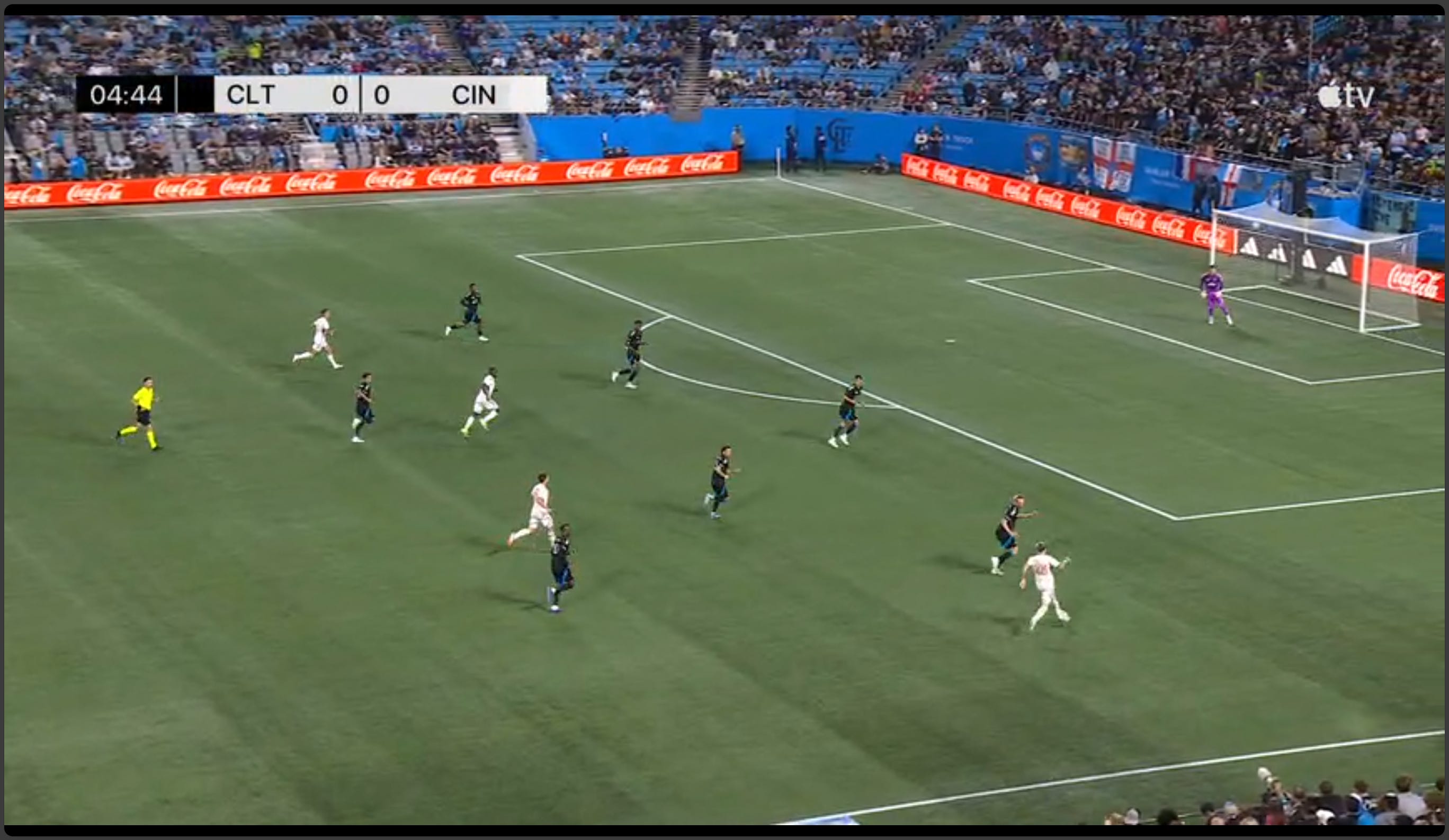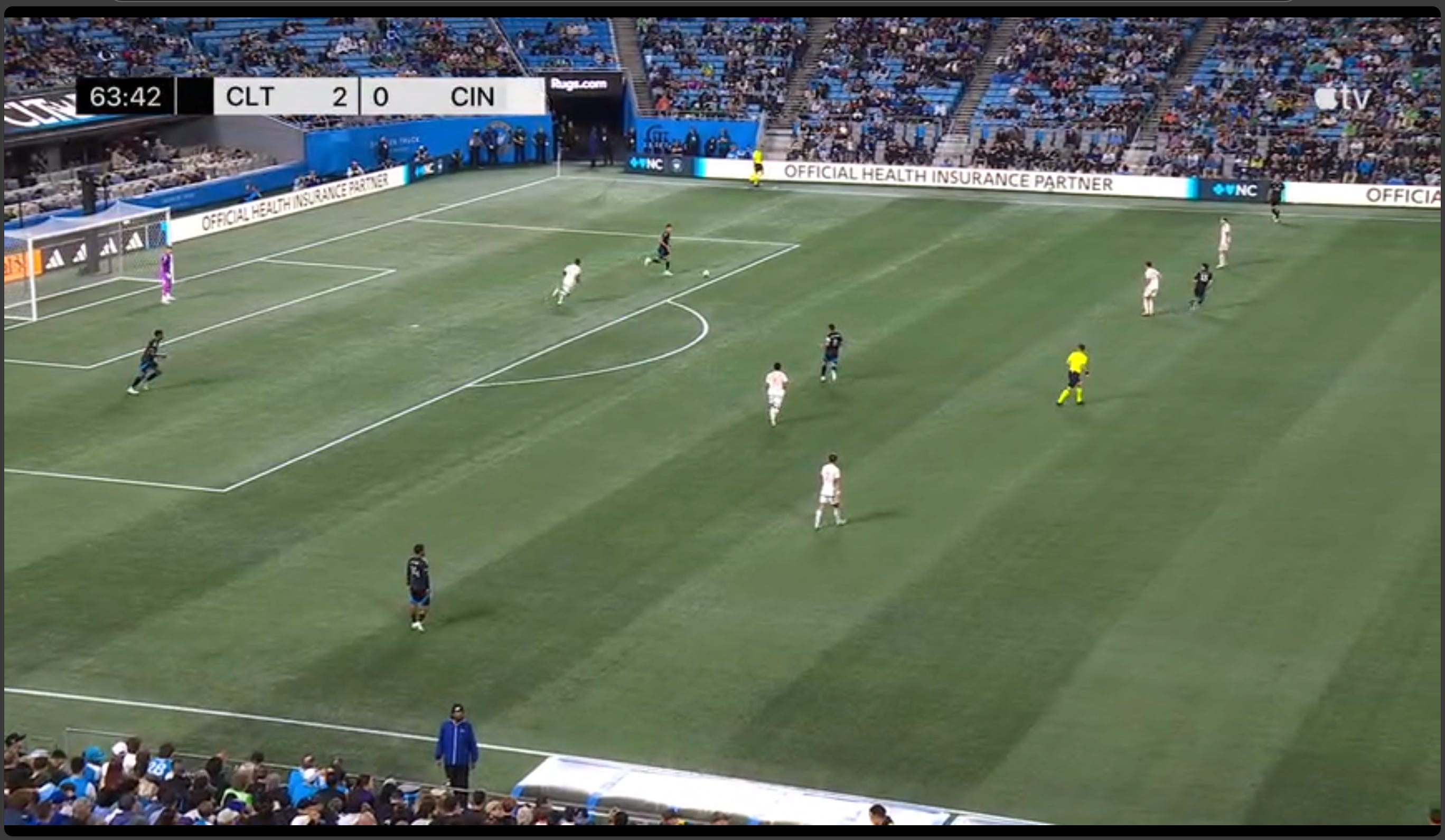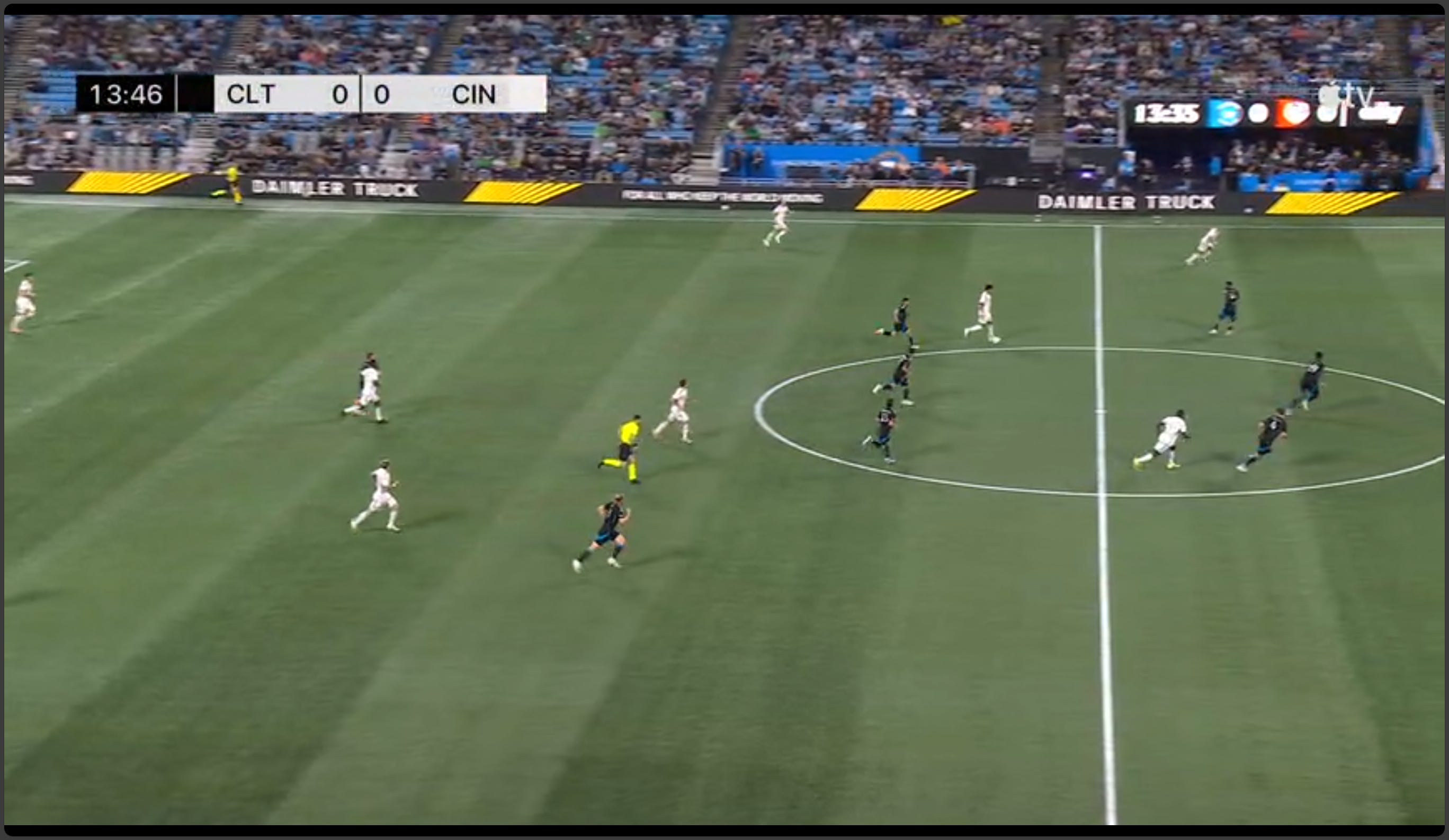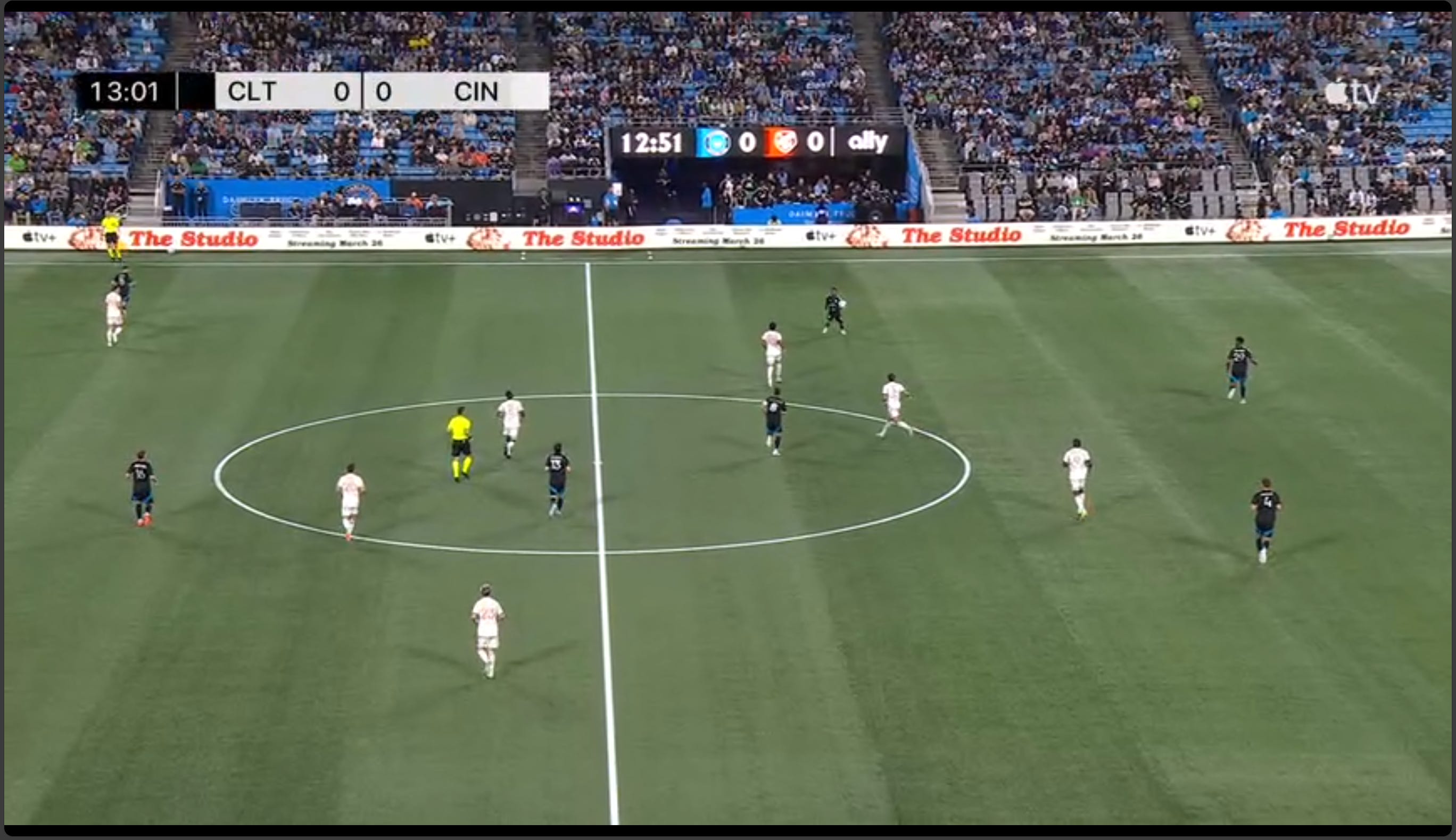 Charlotte’s 2-0 win over FC Cincinati was their best game so far this season. We were finally able to build up through our opponent’s mid-block and it allowed our attackers (particularly Biel and Agyemang) to cause problems. But as we analyze what made Charlotte successful in this game, I also think about what is repeatable and is an improvement on our part, and what was game specific. FC Cincinnati’s setup was different than our other 3 opponents creating different opportunities and threats. So, let’s dive into the film and understand how Charlotte played through the press and how Biel and Agyemang took advantage of it. Then we are going to show how both Abada and Zaha have adjusted their positioning on each wing. Last, we will look at our defense and how our back 4 and Kahlina had to bail out a poor pressing performance. But first…