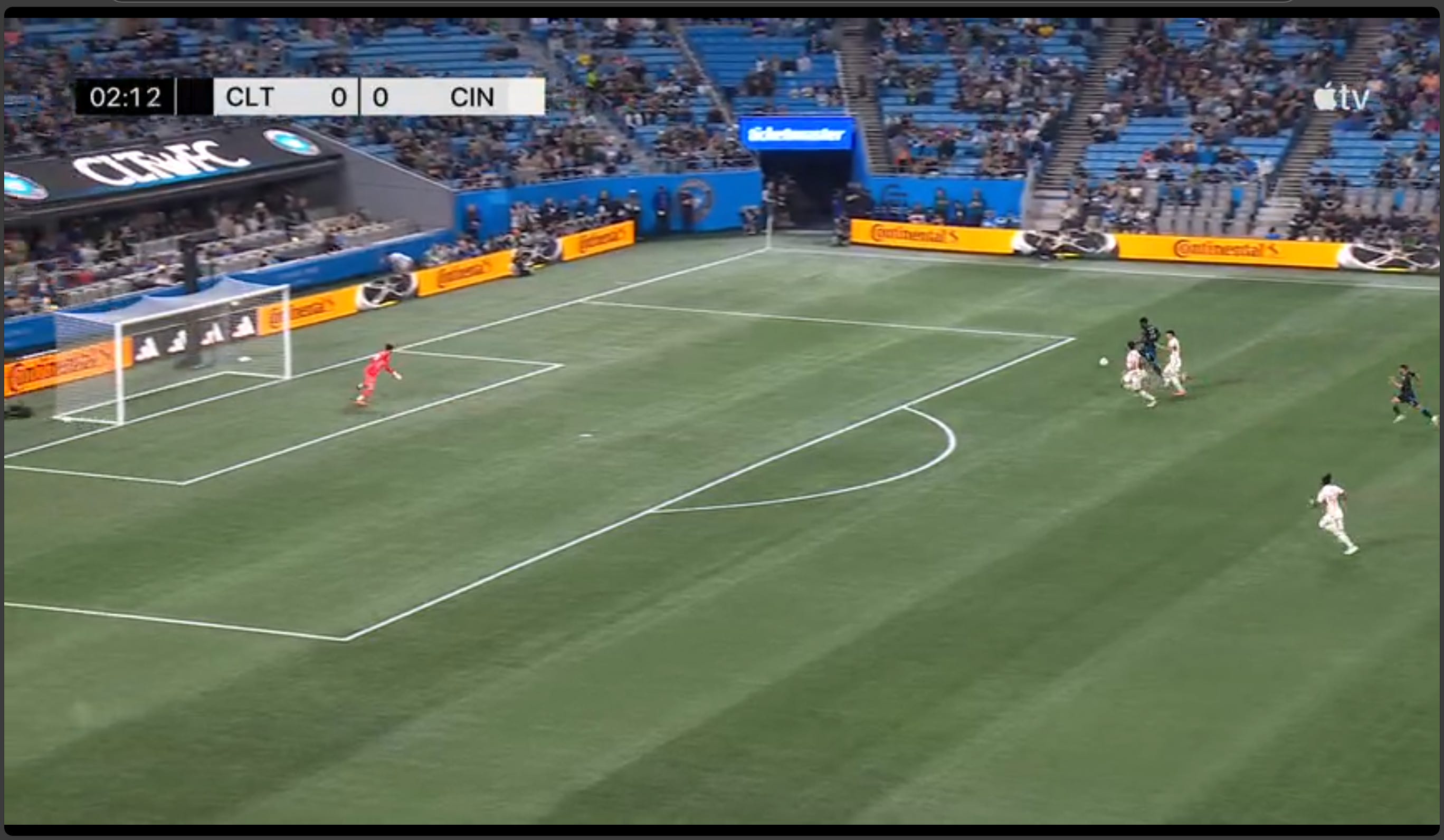 From here he picks his head up and sees Agyemang making a vertical run between Cincy’s center-back and left-back and finds him with a beautiful ball.