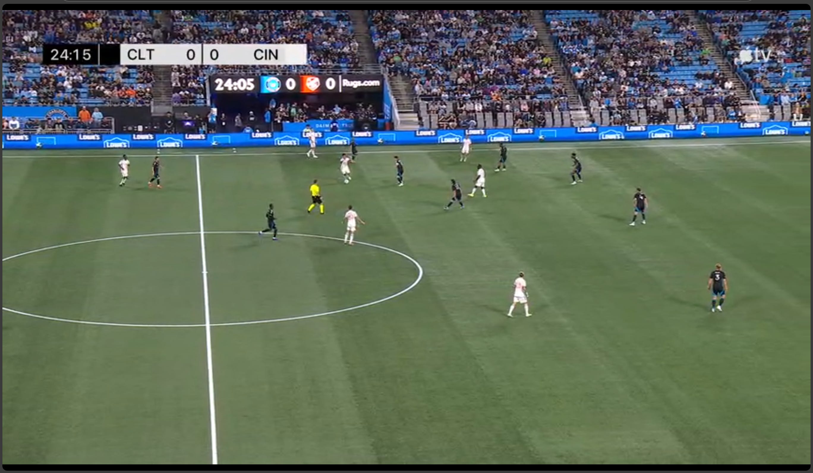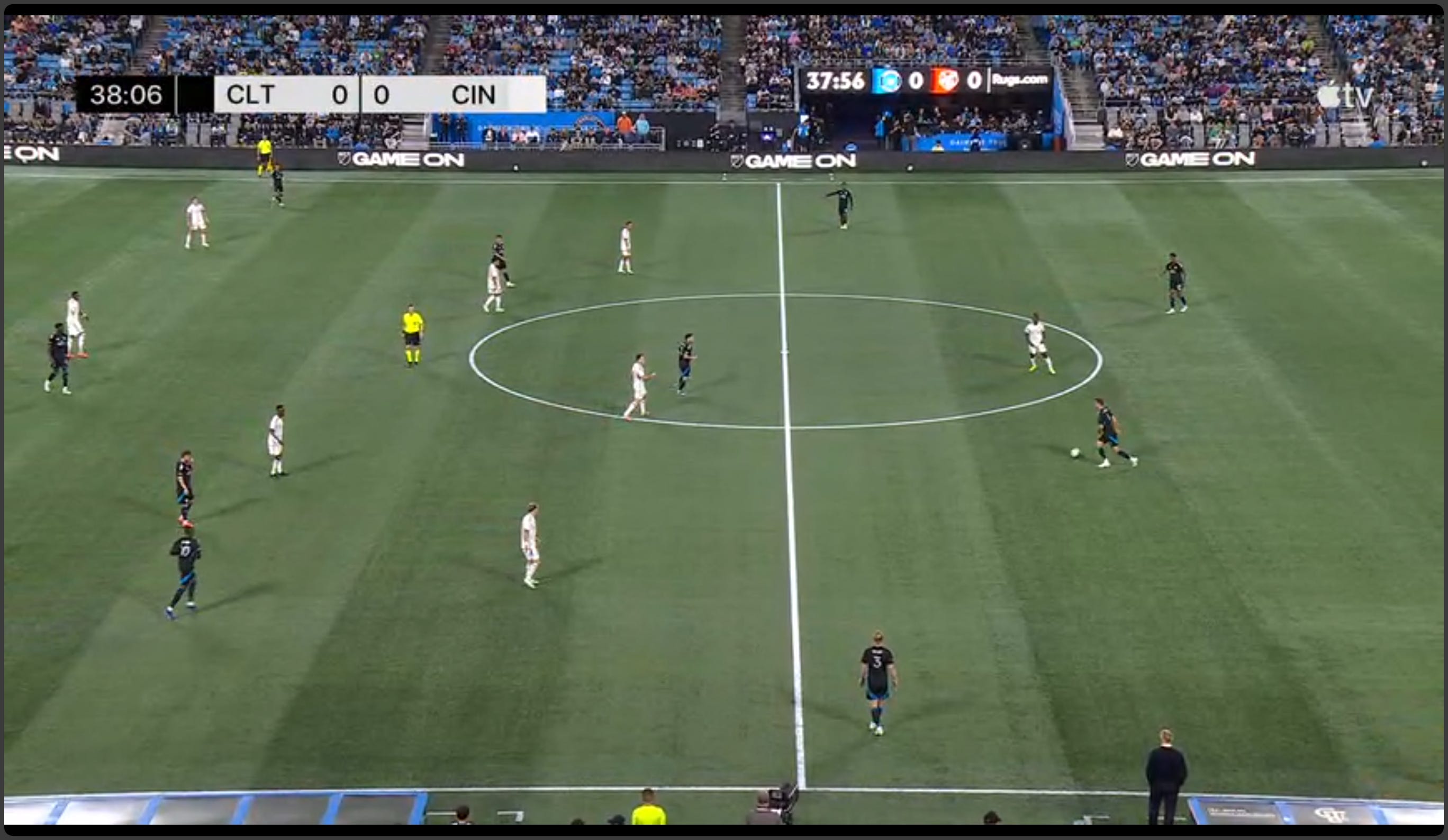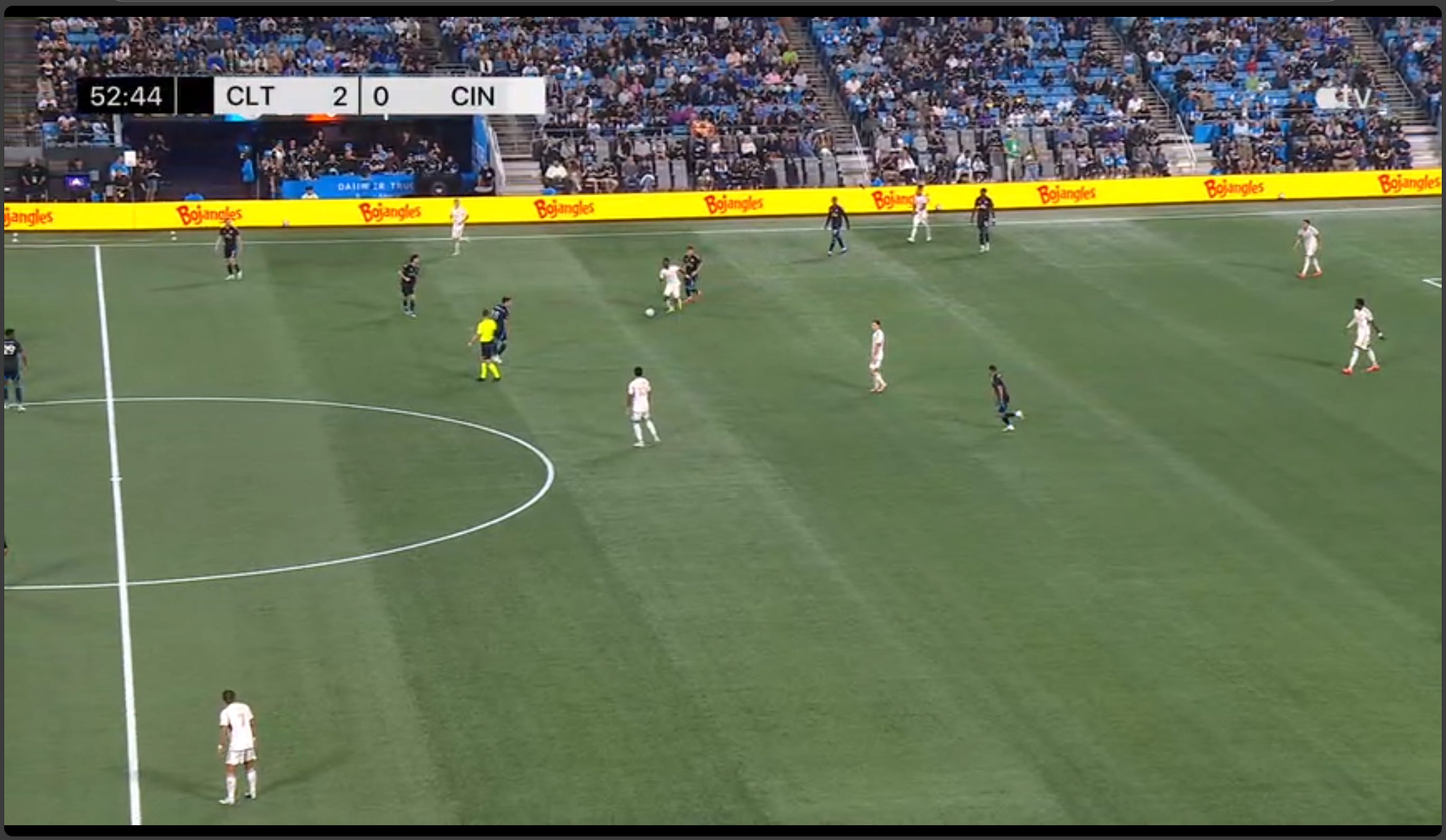 The second issue may have been our tactical setup. It seems we either were ok with not putting pressure on their center backs and instead sitting in this mid-block or our players did not know who they should mark. Usually either Biel or Agyemang is right in front of their midfield pivot but Nwobodo is somewhat open between both of them. Cincy’s center back plays a direct pass right to him and he turns without being pressured.