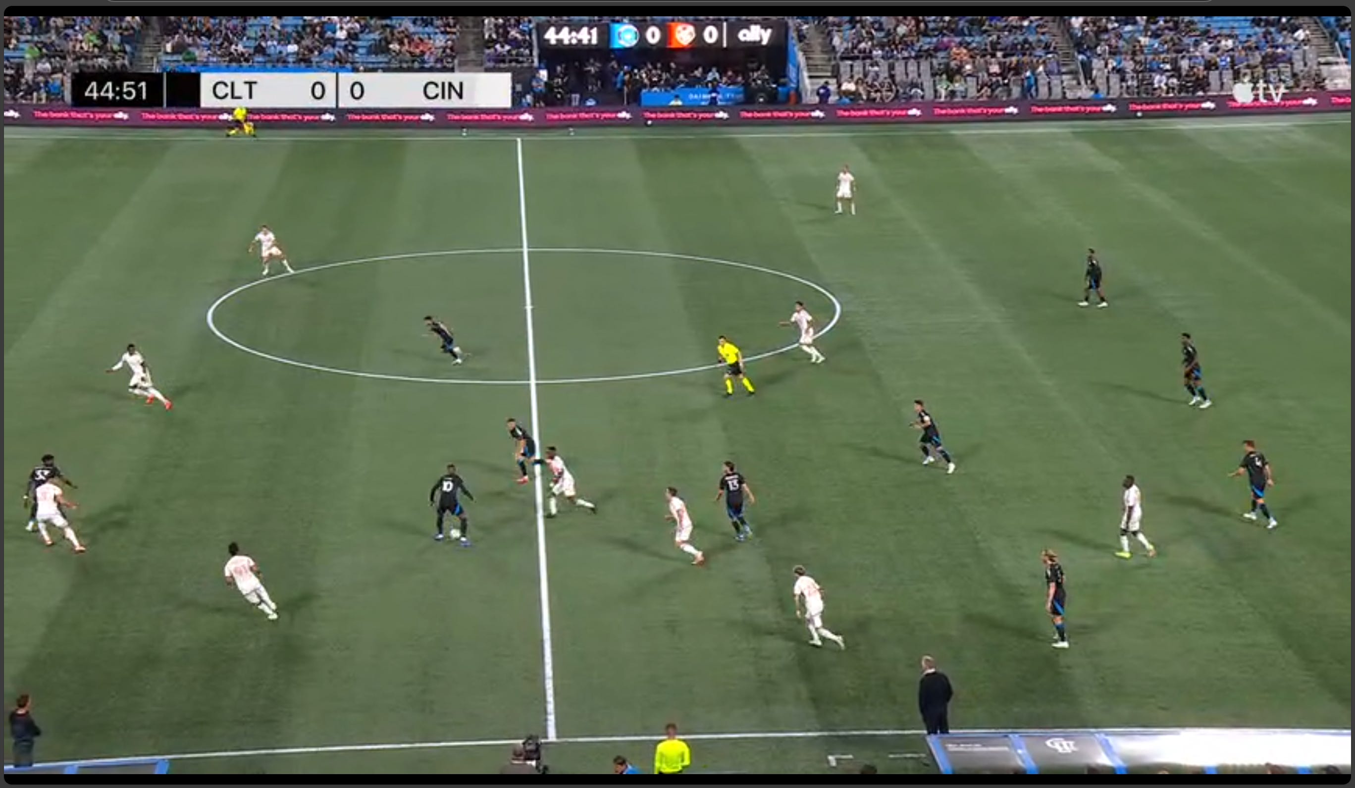 The problem is Charlotte is already bad and building up through our pivot players. By having two defensive lines with only 1 player on them, Cincy is giving our center backs time to step forward and look to pass and giving tons of space for Biel and Zaha to operate in past the line of 4.