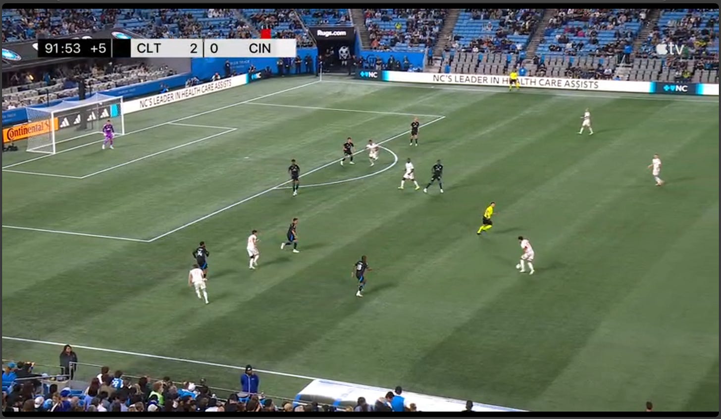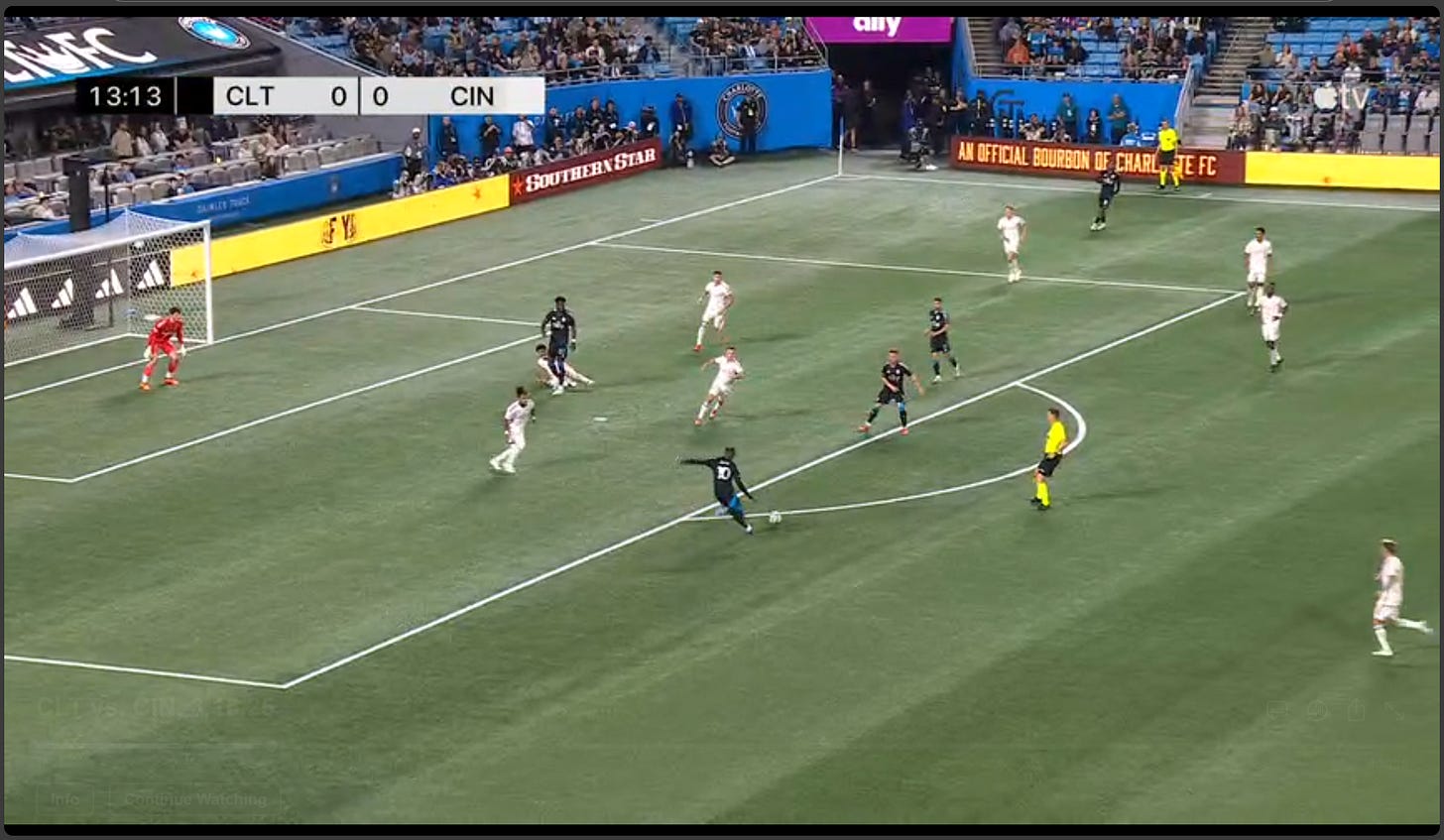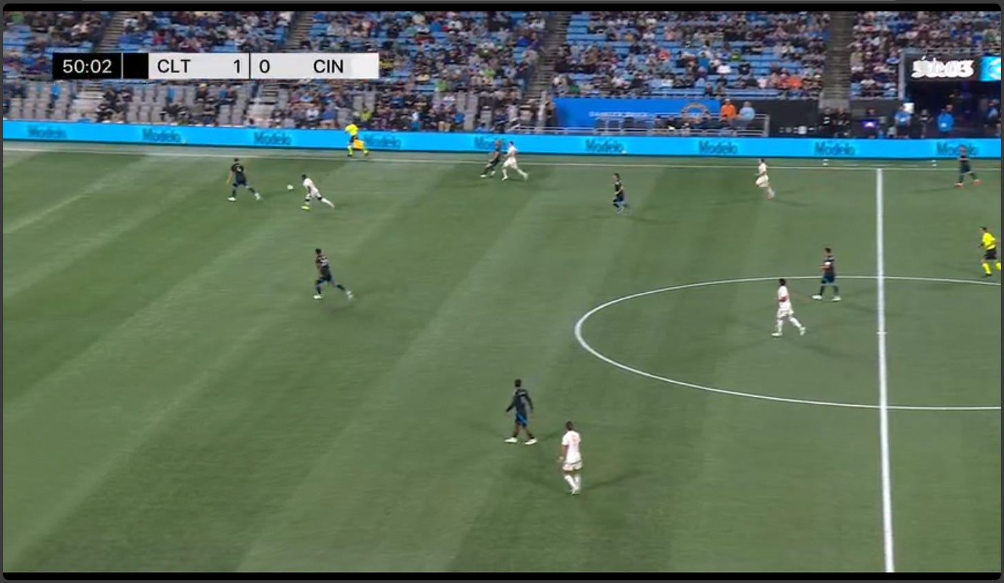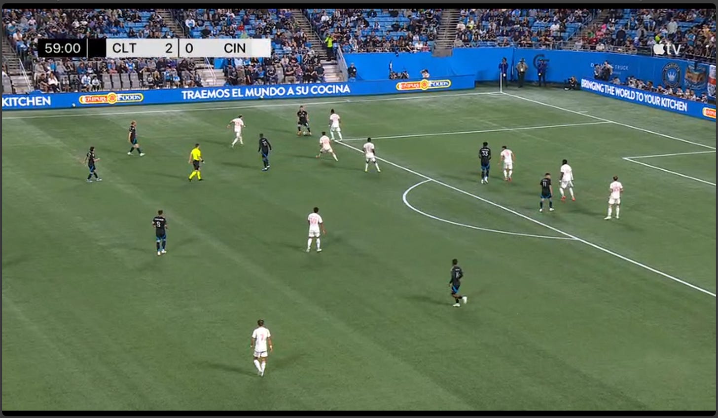 Malanda receives the ball and has no pressure on him and plenty of time to survey the field. As Cincy sets their defense, Nwobodo is central near Westwood and Biel finds open space on the far side.