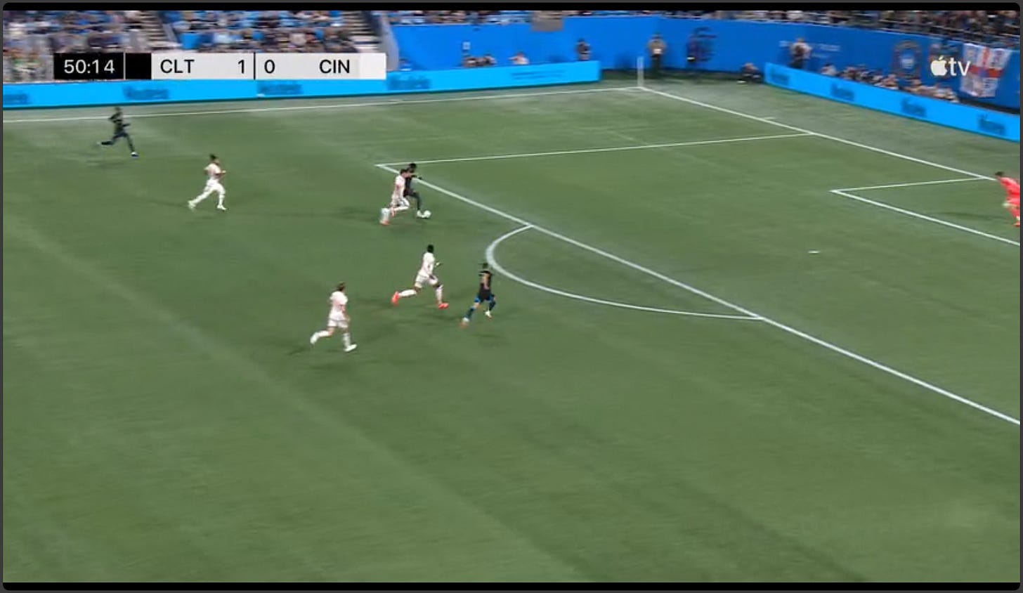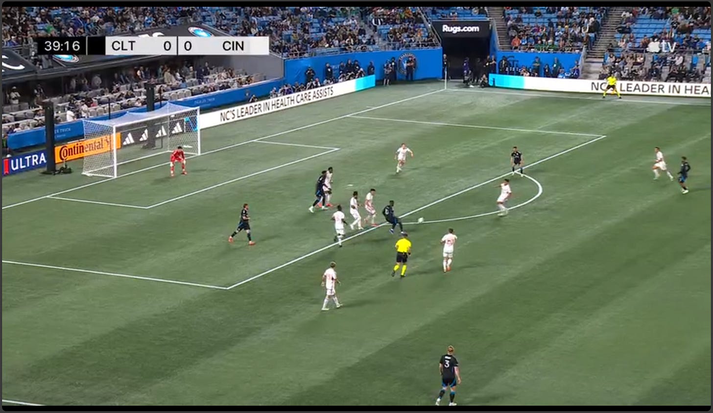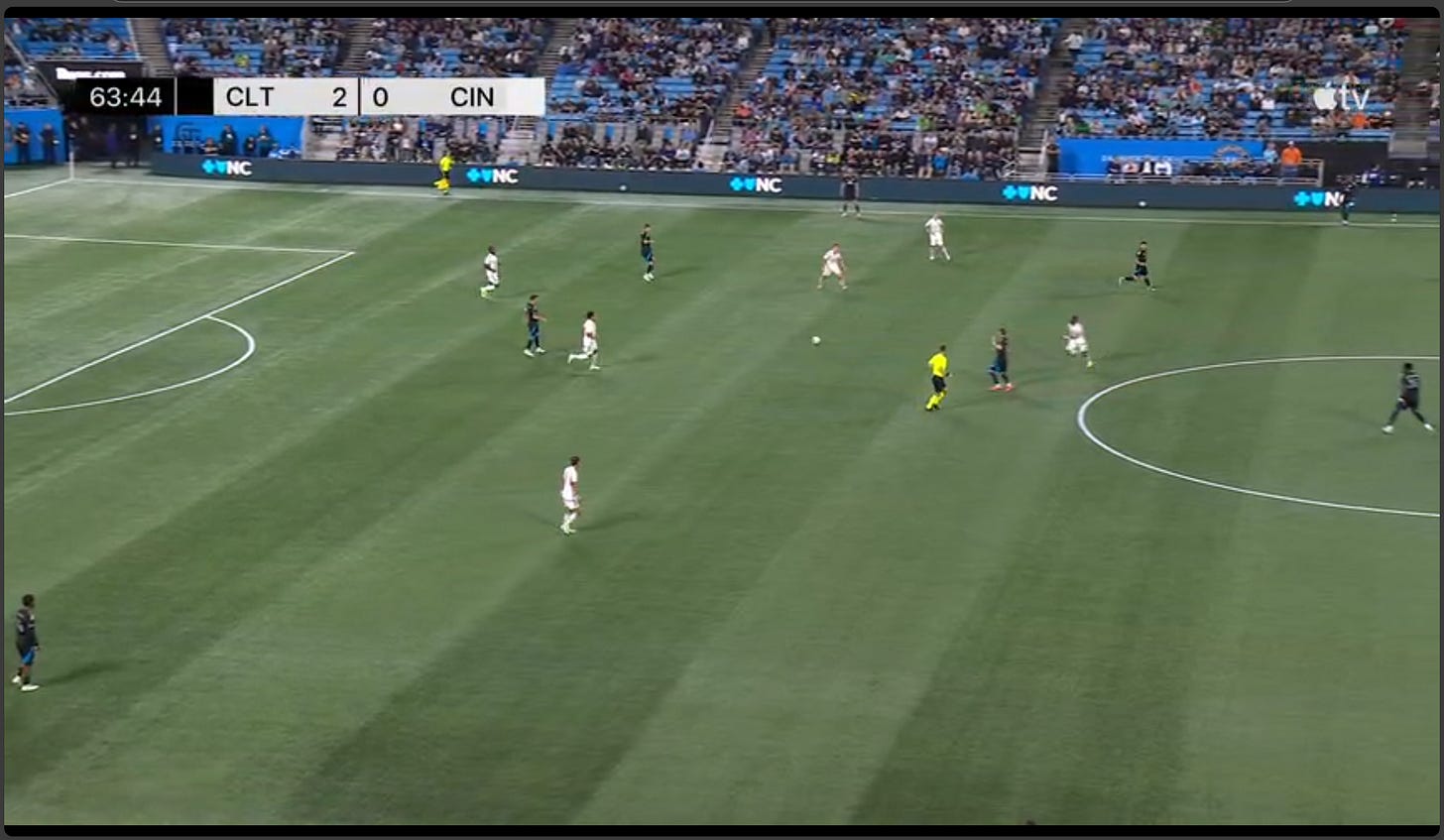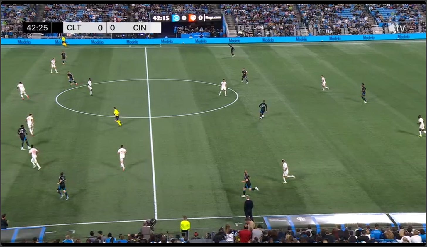 Malanda receives the ball and has no pressure on him and plenty of time to survey the field. As Cincy sets their defense, Nwobodo is central near Westwood and Biel finds open space on the far side.