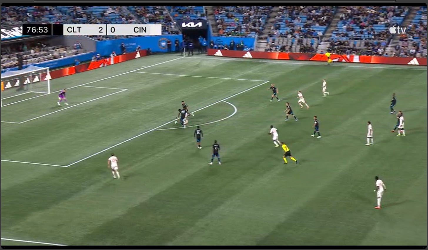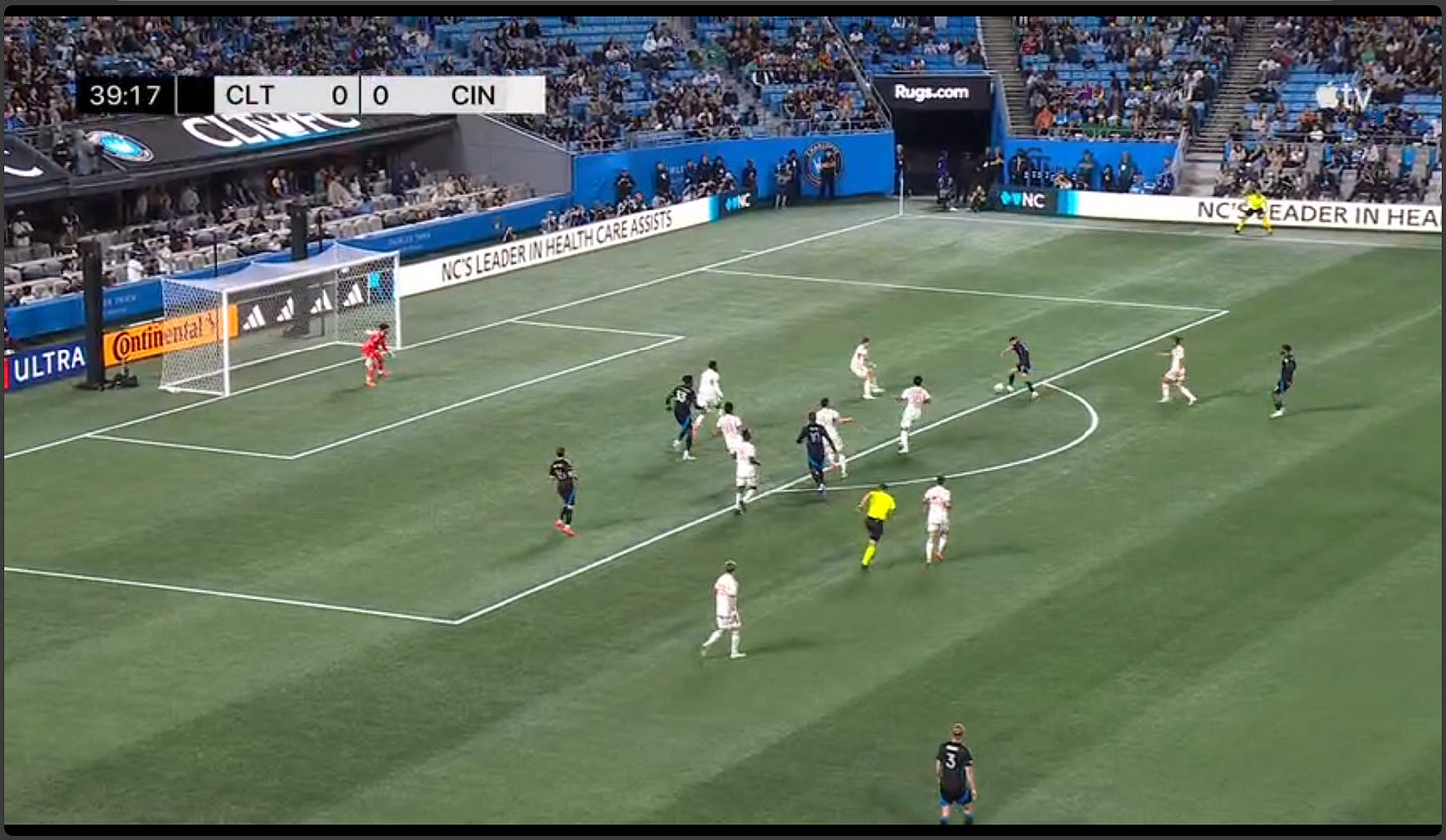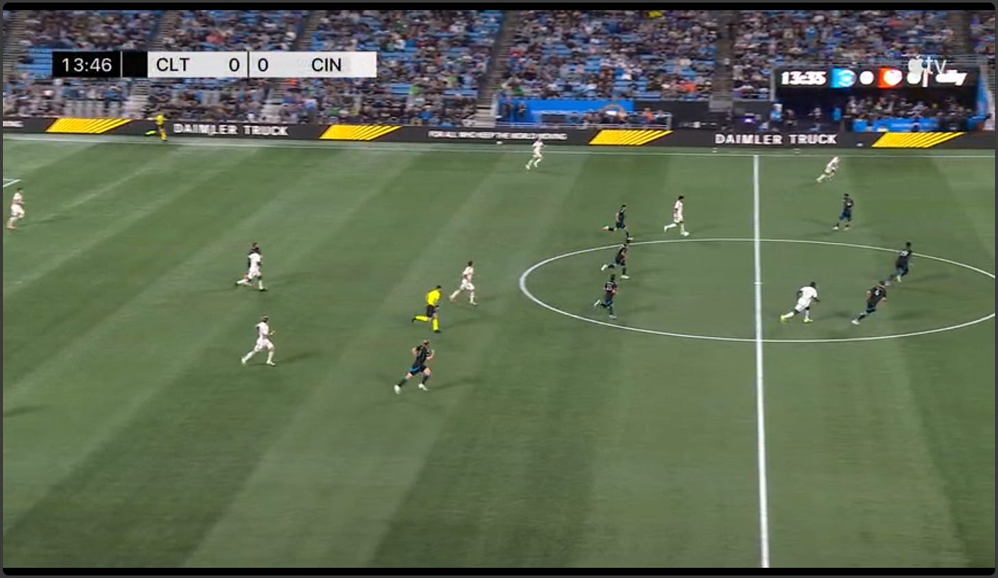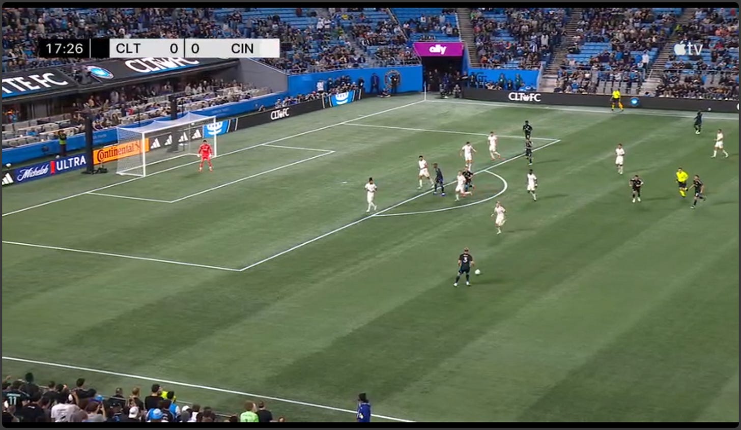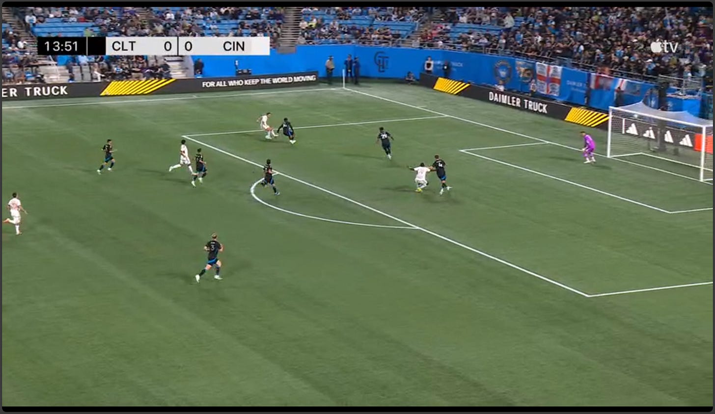 Malanda receives the ball and has no pressure on him and plenty of time to survey the field. As Cincy sets their defense, Nwobodo is central near Westwood and Biel finds open space on the far side.