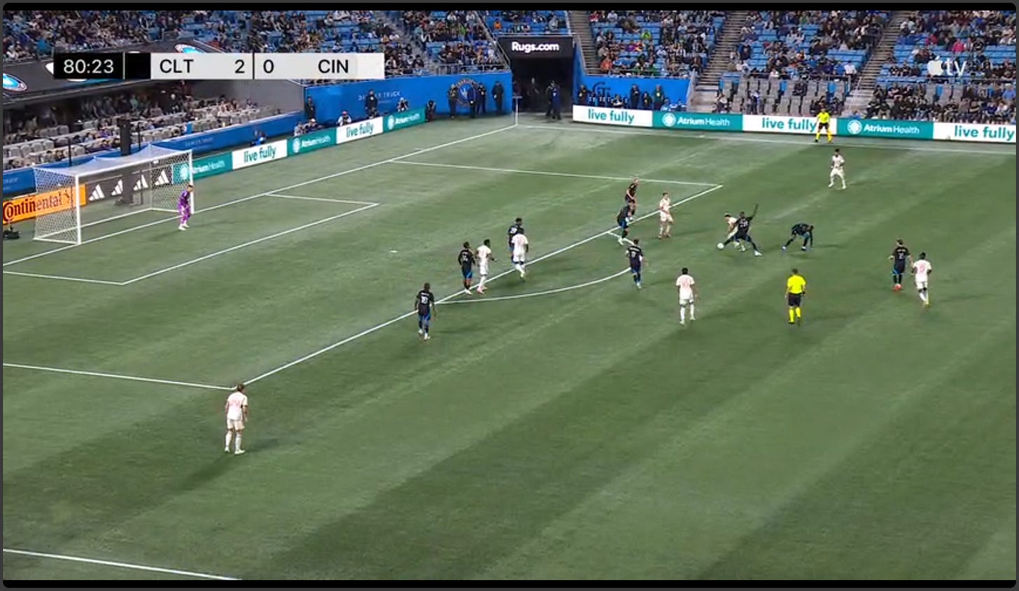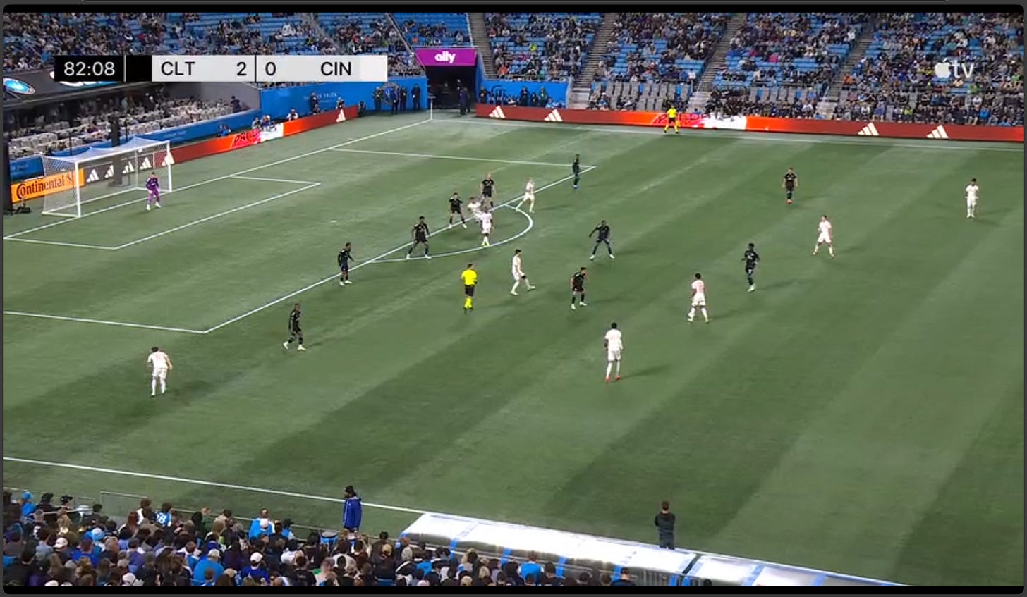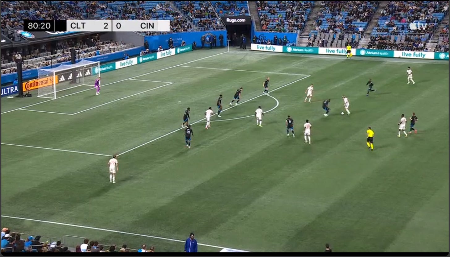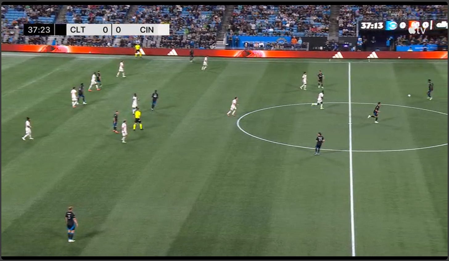 Malanda receives the ball and has no pressure on him and plenty of time to survey the field. As Cincy sets their defense, Nwobodo is central near Westwood and Biel finds open space on the far side.