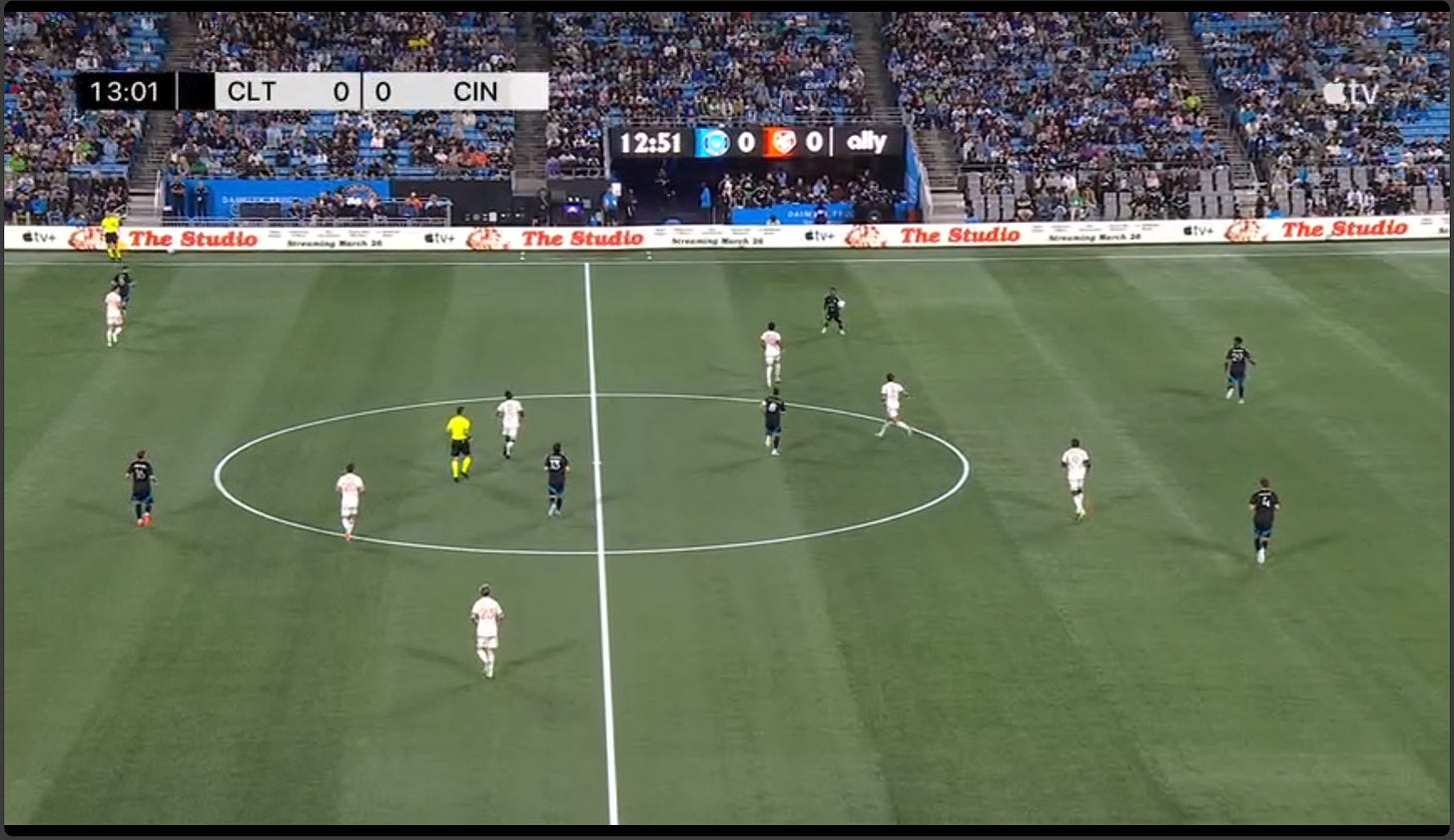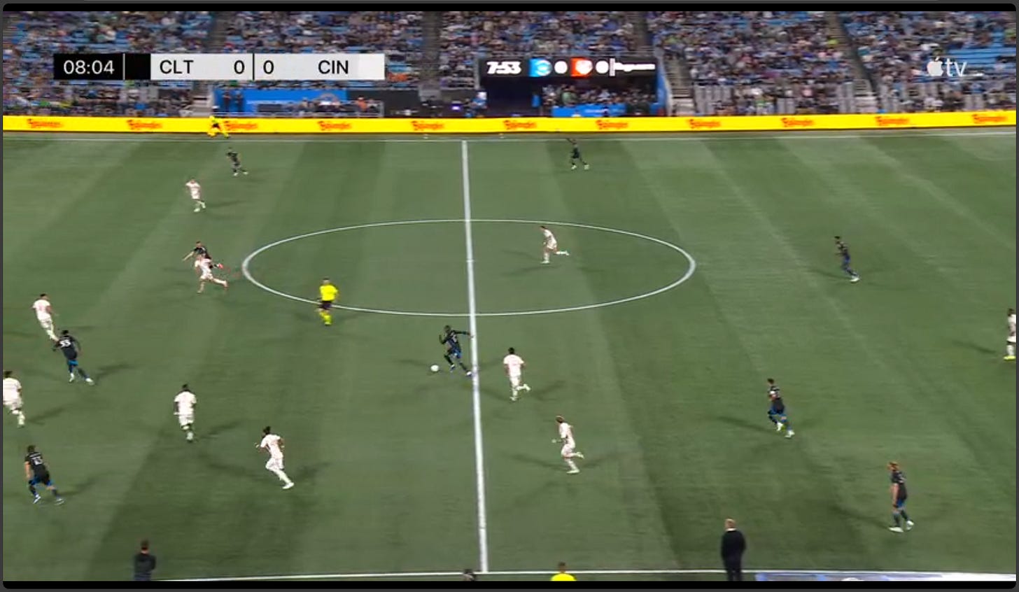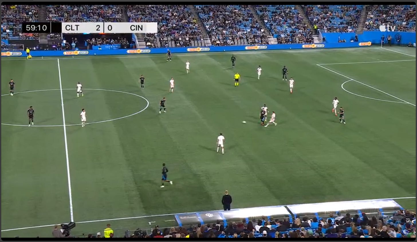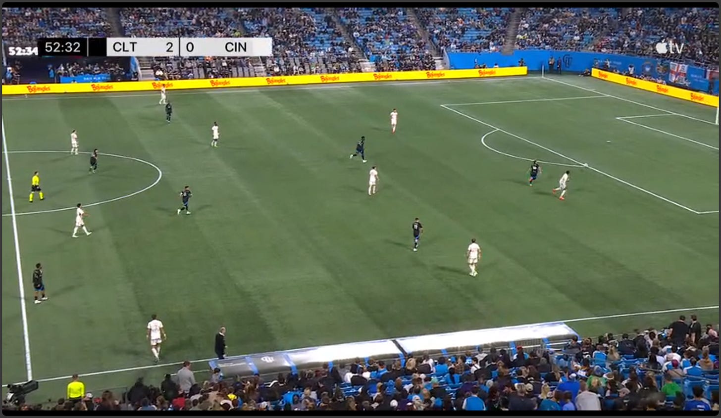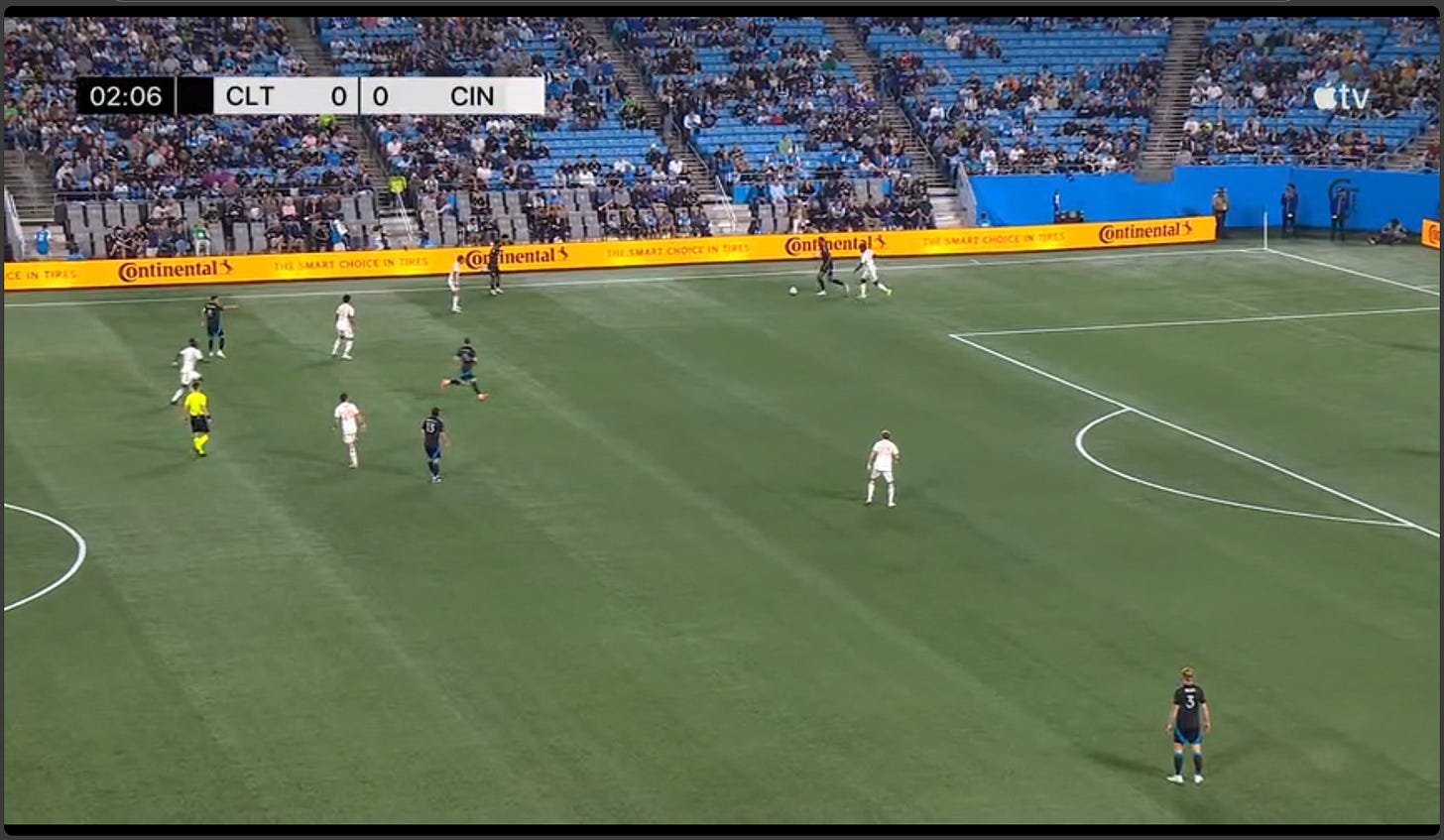 Charlotte’s 2-0 win over FC Cincinati was their best game so far this season. We were finally able to build up through our opponent’s mid-block and it allowed our attackers (particularly Biel and Agyemang) to cause problems. But as we analyze what made Charlotte successful in this game, I also think about what is repeatable and is an improvement on our part, and what was game specific. FC Cincinnati’s setup was different than our other 3 opponents creating different opportunities and threats. So, let’s dive into the film and understand how Charlotte played through the press and how Biel and Agyemang took advantage of it. Then we are going to show how both Abada and Zaha have adjusted their positioning on each wing. Last, we will look at our defense and how our back 4 and Kahlina had to bail out a poor pressing performance. But first…