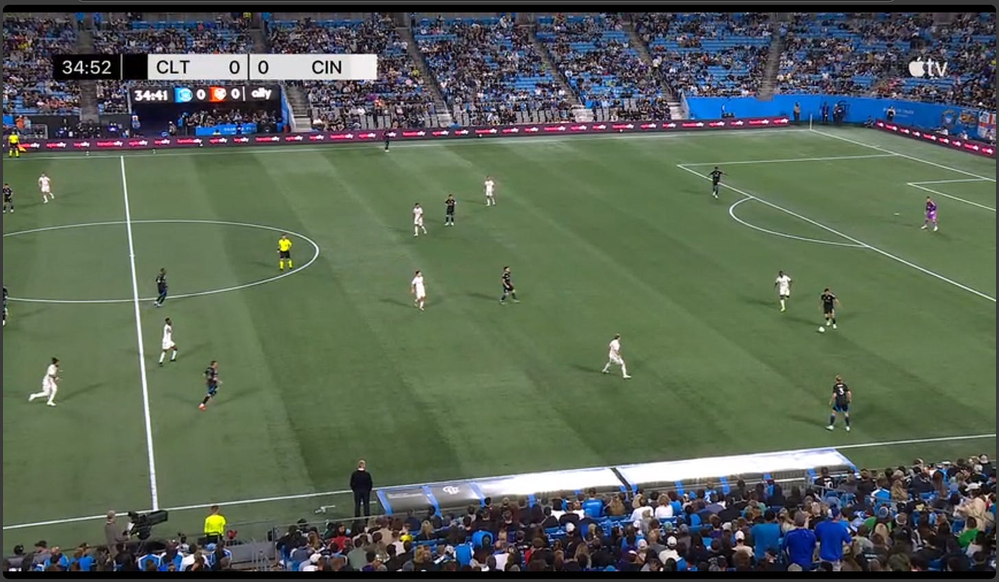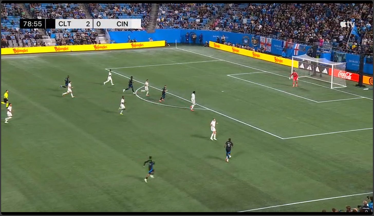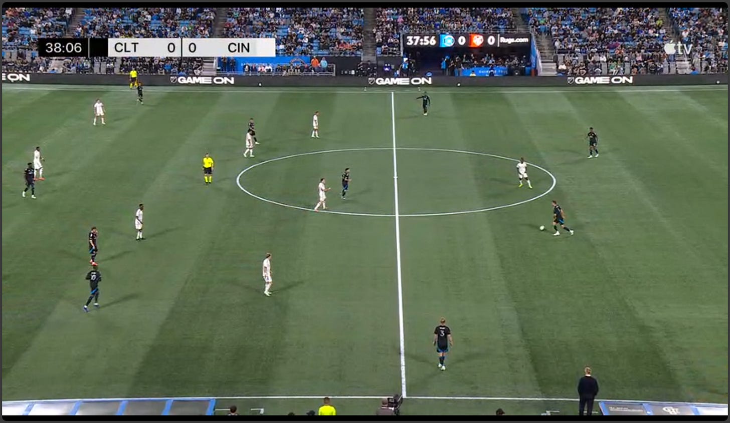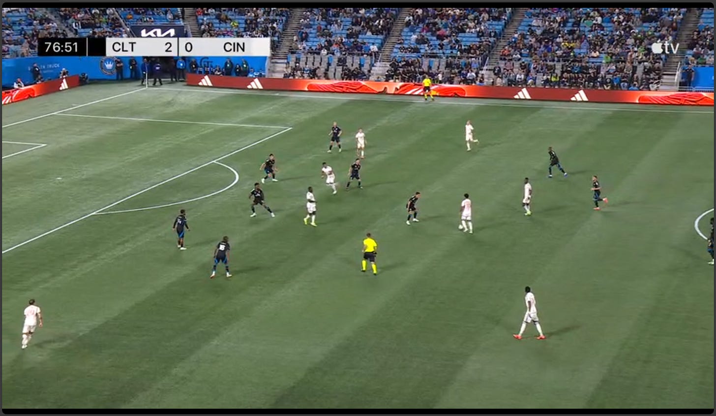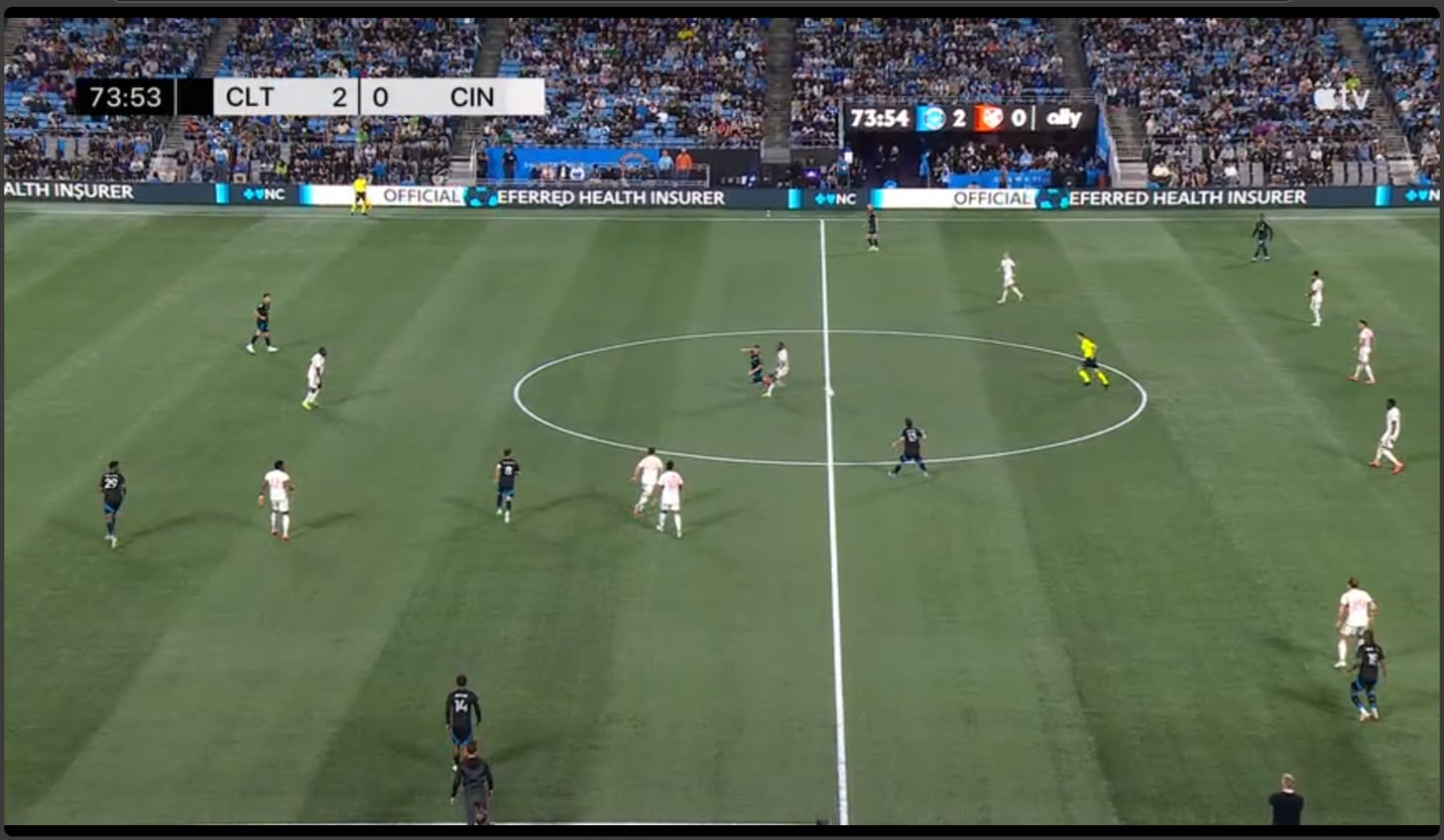 Charlotte’s 2-0 win over FC Cincinati was their best game so far this season. We were finally able to build up through our opponent’s mid-block and it allowed our attackers (particularly Biel and Agyemang) to cause problems. But as we analyze what made Charlotte successful in this game, I also think about what is repeatable and is an improvement on our part, and what was game specific. FC Cincinnati’s setup was different than our other 3 opponents creating different opportunities and threats. So, let’s dive into the film and understand how Charlotte played through the press and how Biel and Agyemang took advantage of it. Then we are going to show how both Abada and Zaha have adjusted their positioning on each wing. Last, we will look at our defense and how our back 4 and Kahlina had to bail out a poor pressing performance. But first…