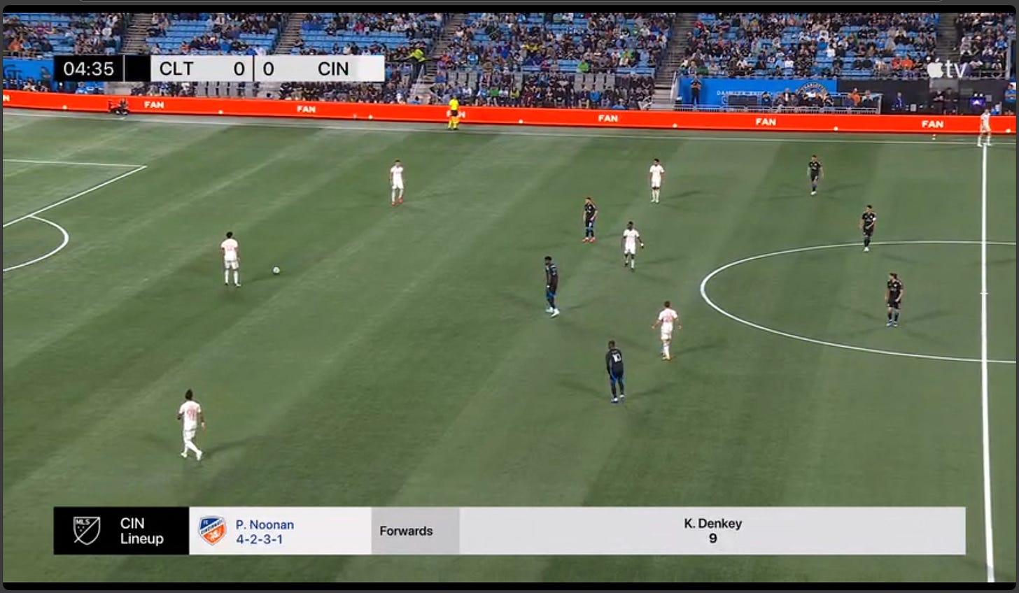 Cincy used multiple ways to play through our press. We do not pressure their center backs here and (in a throwback to the Seattle game) Denkey drifts from the main line to in between our 2 center backs and 2 midfielders.