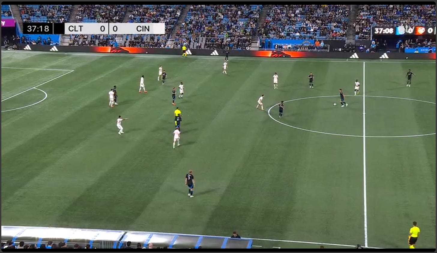 The second issue may have been our tactical setup. It seems we either were ok with not putting pressure on their center backs and instead sitting in this mid-block or our players did not know who they should mark. Usually either Biel or Agyemang is right in front of their midfield pivot but Nwobodo is somewhat open between both of them. Cincy’s center back plays a direct pass right to him and he turns without being pressured.
