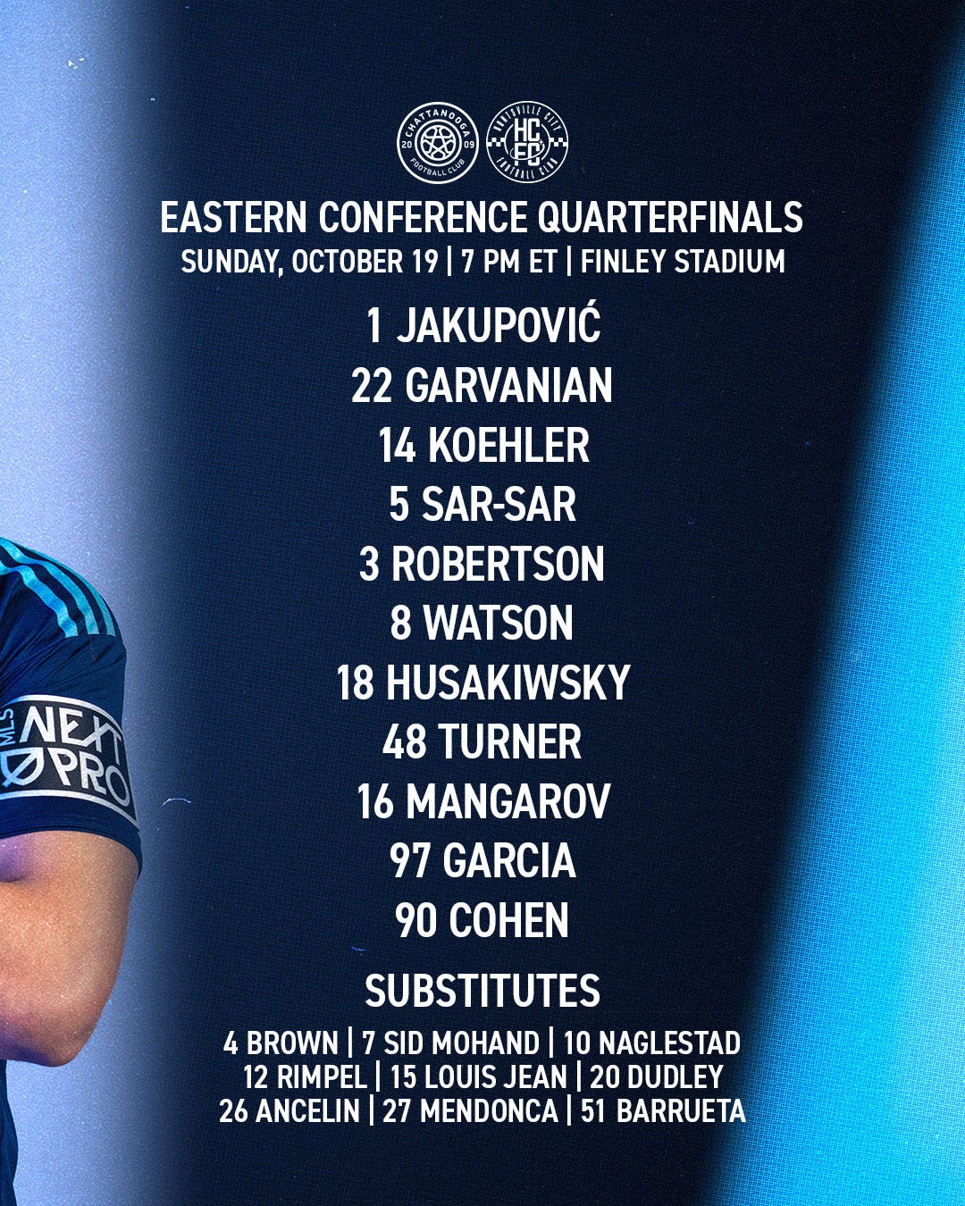 Chattanooga FC (4-3-3): Eldin Jakupović; Milo Garvanian, Farid Sar-Sar (C), Nathan Koehler, Tate Robertson; Luke Husakiwsky (Steeve Louis Jean 74’), Gavin Turner, Callum Watson; Daniel Mangarov (Ameziane Sid Mohand 74’), Anthony García (Keegan Ancelin 62’), Yuval Cohen