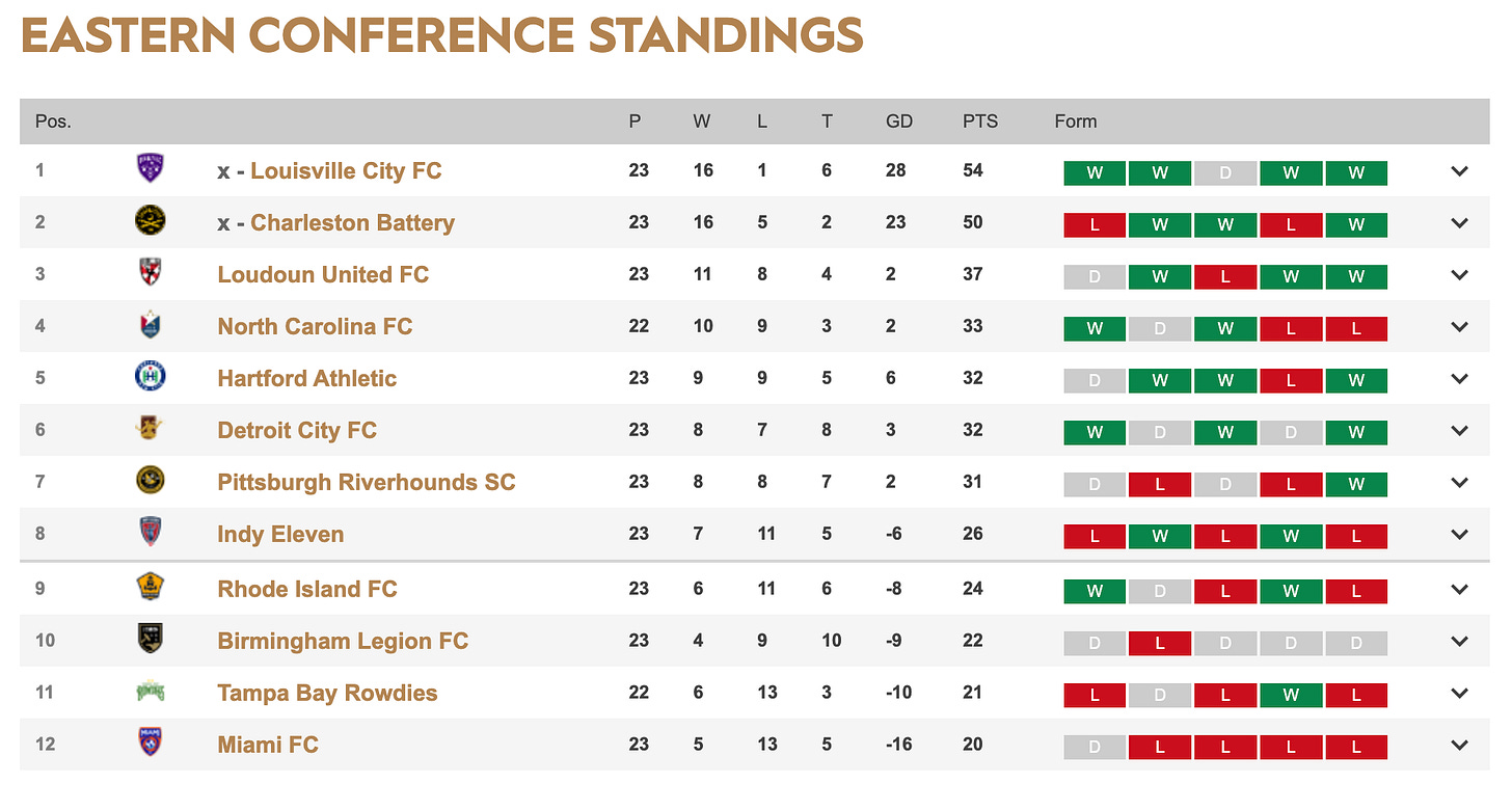 That is because not one other team at or below the playoff line picked up any points this weekend. Losses for Indy Eleven, Rhode Island, Tampa Bay Rowdies and Miami FC confirmed that the final Eastern Conference playoff spot is still anyone’s to claim.