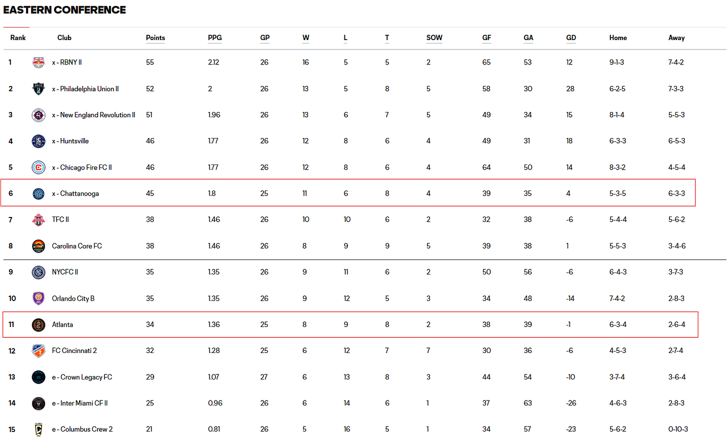 Atlanta United 2 (P:25 W:8 D:8 L:9 SOW:2 GF:38 GA:39 GD:-1) currently sits in 11th place in the East, four points outside of the playoff spots. A win for them tonight at home will see them leapfrog NYCFC II and Orlando City B into 9th place and one point away from 8th place Carolina Core. While a loss tonight won’t be the end of their playoff hopes, it would severely dent them as they’d likely need full points in their remaining two games to even have a chance of getting in. At home, they’ve won seven and lost six of their games.