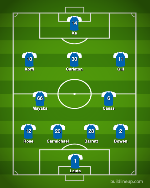 Ahead of them, I’ve got what I think has molded into a close-to-first-choice front four. Alan Carleton and Christian Koffi are nailed into their positions, but striker and right wing are less clear. Carleton could play there, and have Ethan O’Brien in the middle, or either of Damien Barker John or Real Gill on the right. I’ve got Gill in for this one.