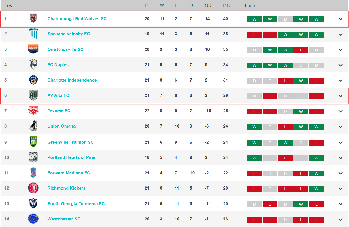 Sixth place AV Alta FC comes east to take on the Chattanooga Red Wolves at CHI Memorial Stadium tonight at 7pm (Eastern). Winless in their last five games, Alta faces a difficult challenge to squeeze points out of a relentless 1st place Chattanooga.