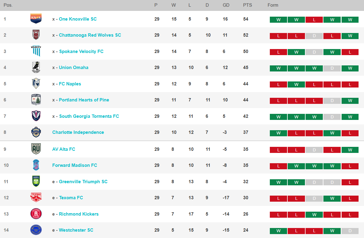 Westchester (W5 D9 L15 GF:42 GA:57 GD:-15) was eliminated from playoff contention back in Week 30. All they’re playing for is potentially not finishing bottom if they can get a result and jump ahead of Richmond. It’s been a tough debut season for the New York-based side but they have picked up points in half (7/14) of their away matches. Last weekend they managed a 2-2 away tie at regional rivals Portland Hearts of Pine. Captain Juan Carlos Obregón scored both their goals. The Honduran international is the league’s top goalscorer with 17 on the season and is likely win the golden boot.