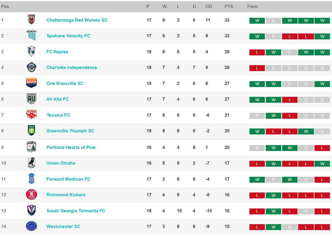 Omaha (P:16 W:5 D:2 L:9 GF:20 GA:27 GD:-7 in league play) are on stuttering form. Under interim Head Coach Vincenzo Candela, they’re three wins and three losses but won their most recent game at home against Westchester. Chasing a playoff spot, they do have a couple of games in-hand on some of the clubs around them. However, they have the second-worst home form in the league, having won just two of five games at Werner Park.