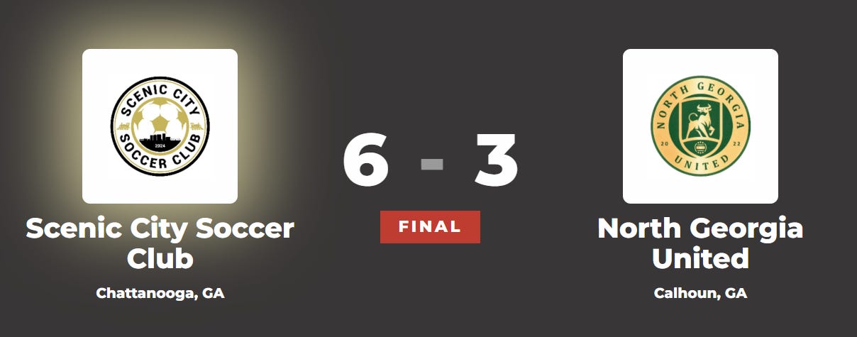 CHATTANOOGA, Tn. — Spectators in attendance at the Chattanooga School for the Liberal Arts were treated to nine goals on a balmy night last Saturday. Scenic City SC defeated visitors North Georgia United 6-3 in an exciting game that featured plenty of skill and talent on show, as well as the many goals.