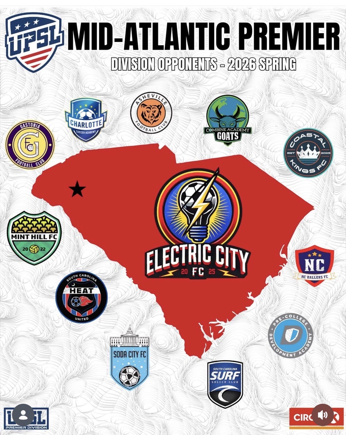 The UPSL Premier Mid-Atlantic Conference has announced the Spring 2026 teams vying for one of the most competitive UPSL crowns in the nation. Perennial powers Soda City and the SC United Heat will have new South Carolina foes Electric City (Spring 2025 UPSL D1 Promotion Champs) and the South Carolina Surf (rebranding of former Charleston United franchise) battling it out for state bragging rights. Boiling Springs United will skip the Spring UPSL season leaving South Carolina with four franchises. Fall expansion team the Coastal Kings are back from Savannah, Georgia with several clubs from North Carolina (Asheville FC, Ballers FC, Mint Hill, Charlotte SA, Gastonia FC, Combine Academy, and Pre-College DA) rounding out the 12-team conference. The spring season will kickoff in early March.