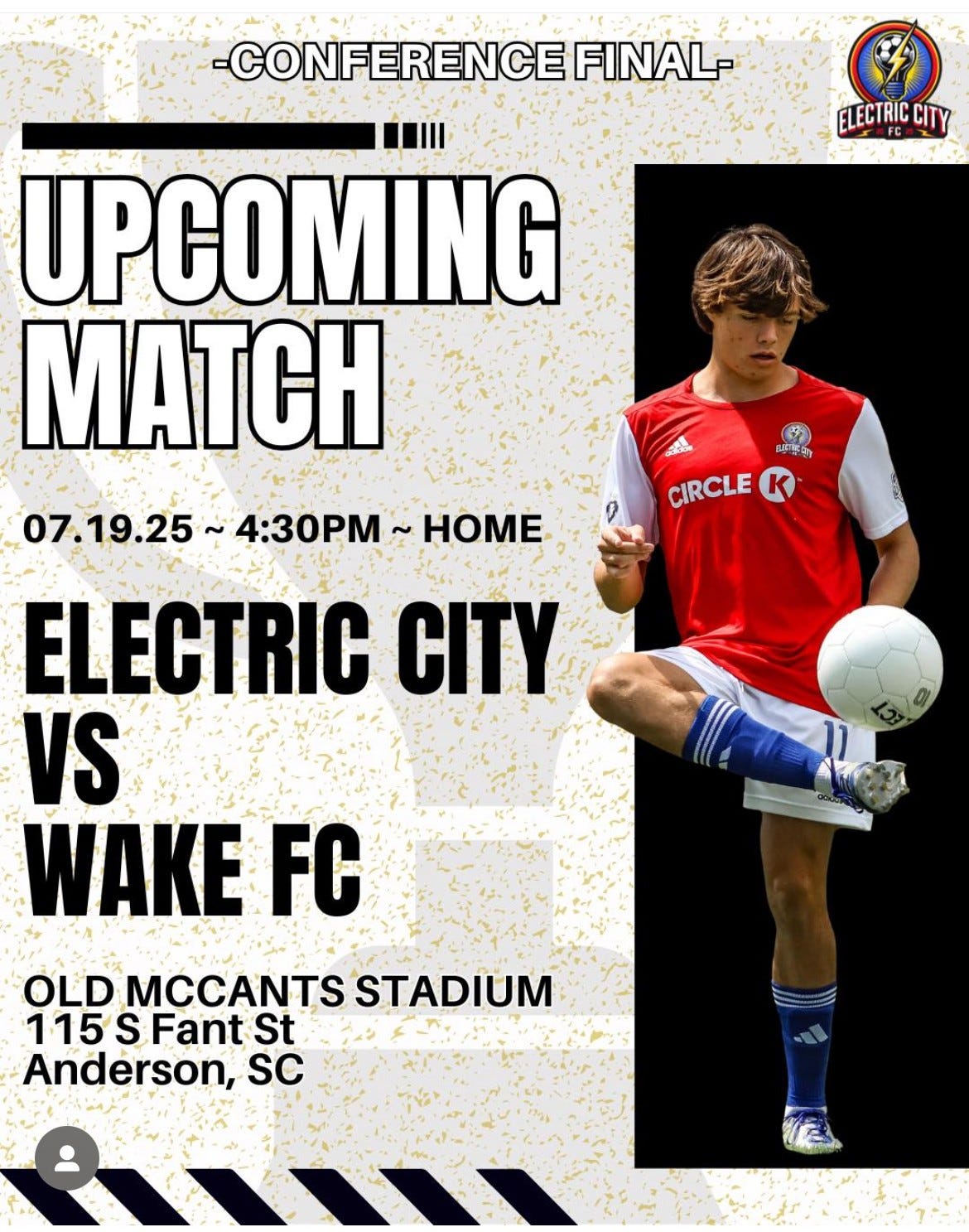Electric City FC will host the final this Saturday at Old McCants Stadium in Anderson as Wake Futbol Club visits for a 4:30 PM kickoff. This exact matchup didn’t happen during the regular season as Wake had travel issues and was forced to forfeit the scheduled match this Spring. The playoff match up features Electric with a 10W-1L-0T record scoring 48 goals hosting Wake with a 8W-1L-1T record scoring 33 goals for the Spring crown.