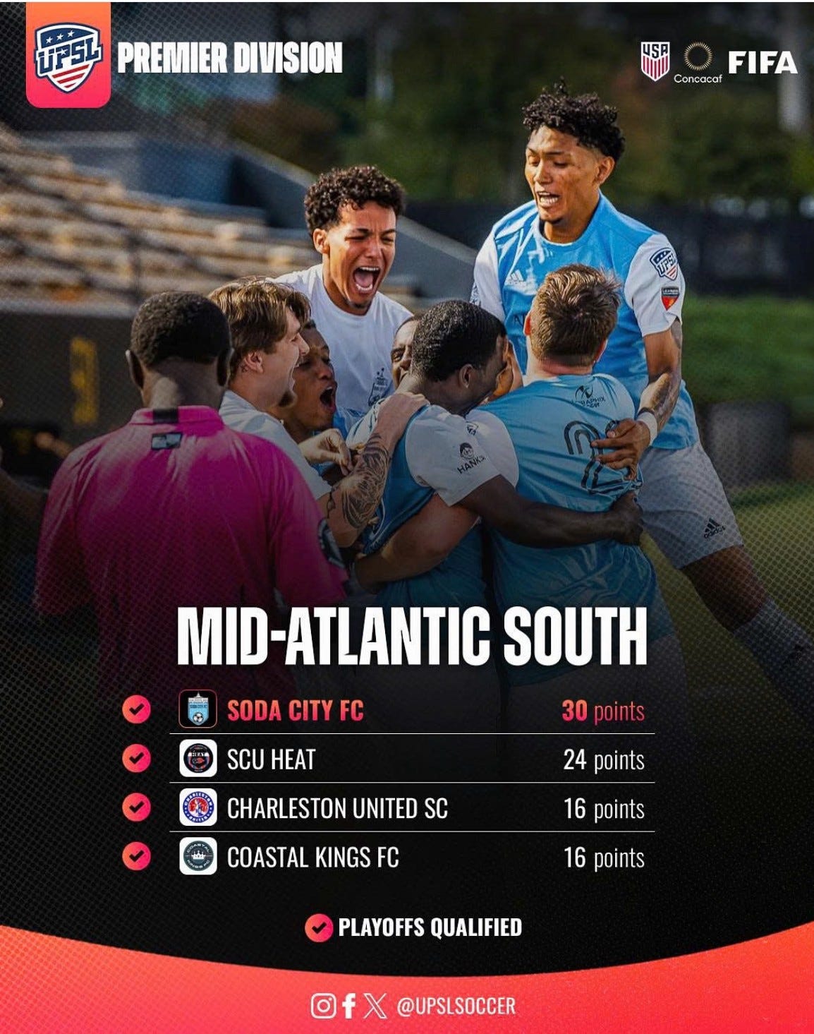 Soda City completed an undefeated season with their 3-1 win over Boiling Springs in the Upstate last Sunday night. Soda will host AC Raleigh in the first round of the Mid-Atlantic playoffs on Saturday at 5 PM. Soda scored 40 goals allowing just 5 goals en route to their latest regular season title.