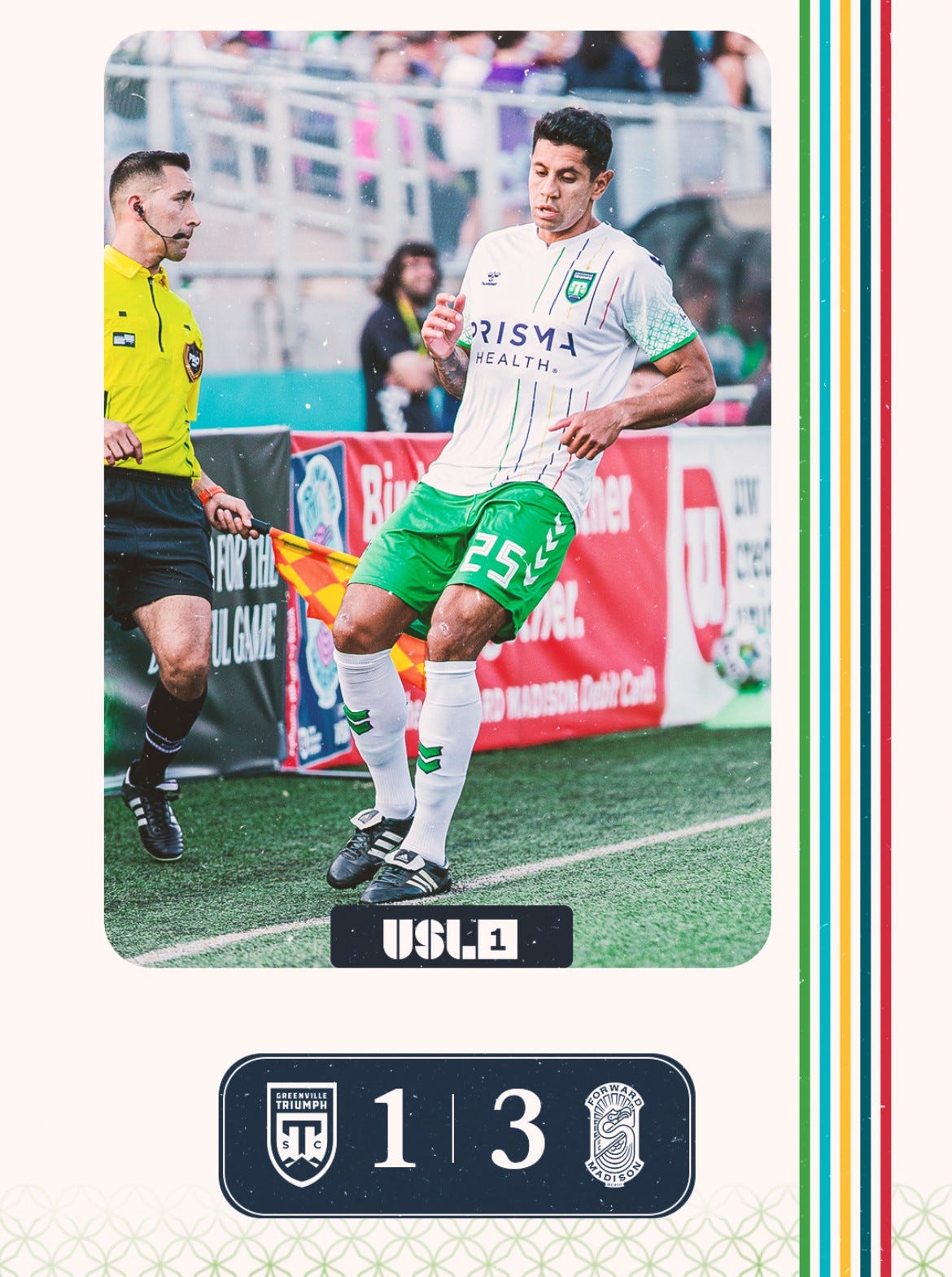 The Greenville Triumph slipped 1-3 on the road at Forward Madison Saturday night. Chevone Marsh headed in his first goal for the Triumph in the final minutes of the match after a free kick was played back into the goal mouth for March to apply the final touch. Greenville continues their road trip in Maine this coming Wednesday to play the Portland Hearts of Pine in their first-ever meeting.