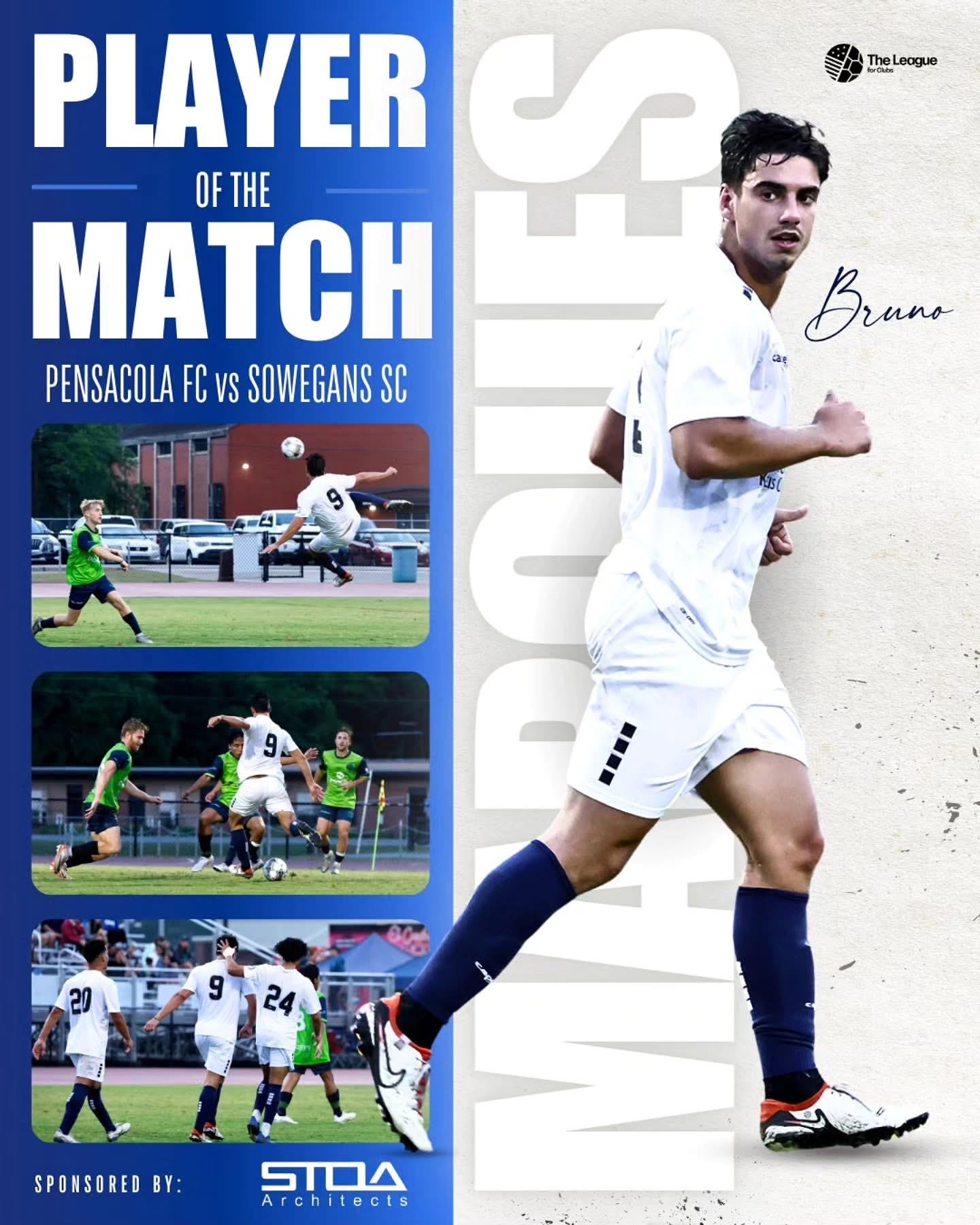 Bruno Marques, a newcomer to Pensacola FC from São Paulo, Brazil, scored three of the Pelicans’ four goals and the defense kept the host Sowegans out of the net in a 4-0 season-opening win last week in Georgia.