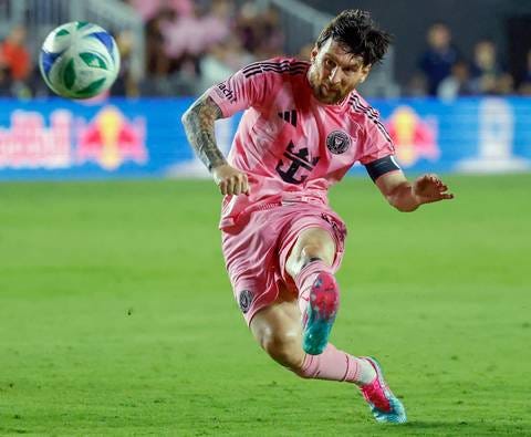 Lionel Messi kicks the ball during Inter Miami’s 4-1 victory against the New York Red Bulls on Saturday at Chase Stadium. PHOTO: Al Diaz/Miami Herald