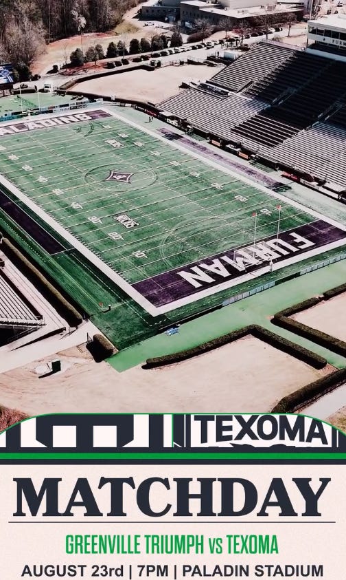 08/23/25 - With 10 games left in the season, Texoma FC faced off against Greenville Triumph SC at Paladin Stadium. The Stadium is home to the Furman Paladins University Football Team, so it was painted for football. They painted soccer lines over in a neon yellow, however, at least on broadcast, the lines were nearly imperceptible.