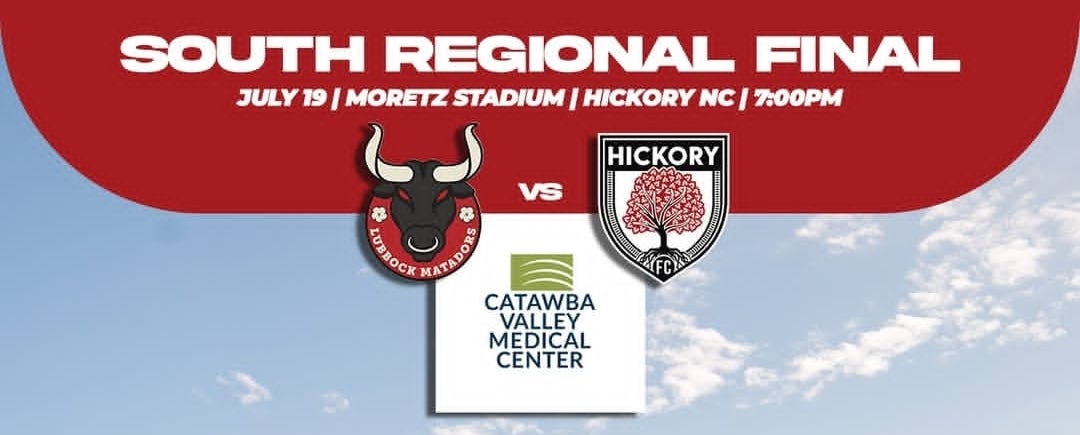 This match is the Region championship, but also the NPSL Elite 8. The winner moves on to the national semifinals to be held on Saturday, July 26. Hickory and Lubbock are two relatively new clubs, but have already made a mark. The Matadors come into the match off of two road playoff wins in a row, beating Jacksonville Armada last week 1-0. Lubbock is part of the Hitchcock portfolio of clubs, and they'll be looking to follow in the footsteps of fellow Hitchcock club Columbus United who dispatched Hickory last year on their way to the semifinals.