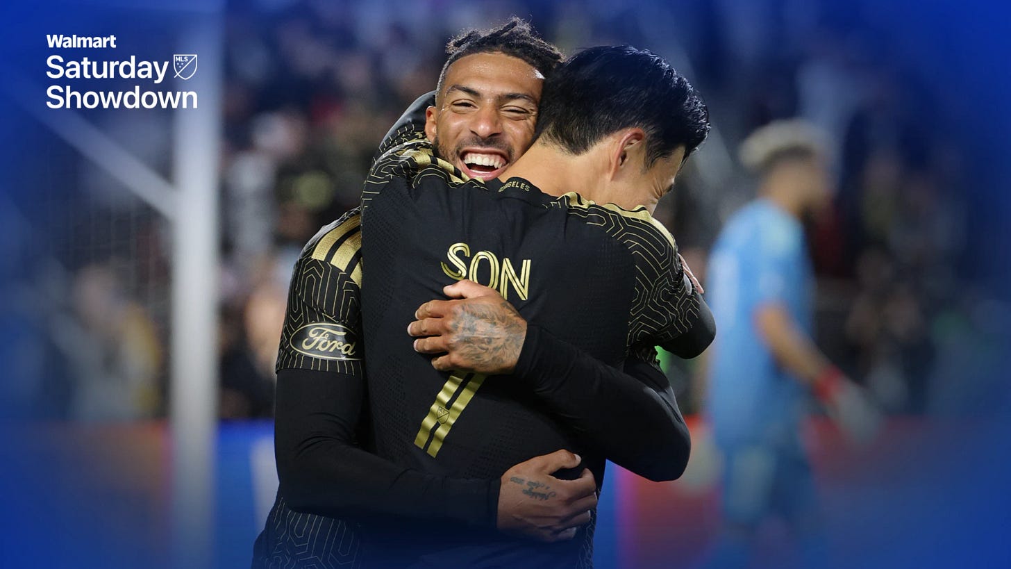 Son Heung-min and Denis Bouanga embrace after Bouanga’s goal in LAFC’s 3-0 season-opening win against defending MLS Cup champion Inter Miami. CREDIT: Major League Soccer