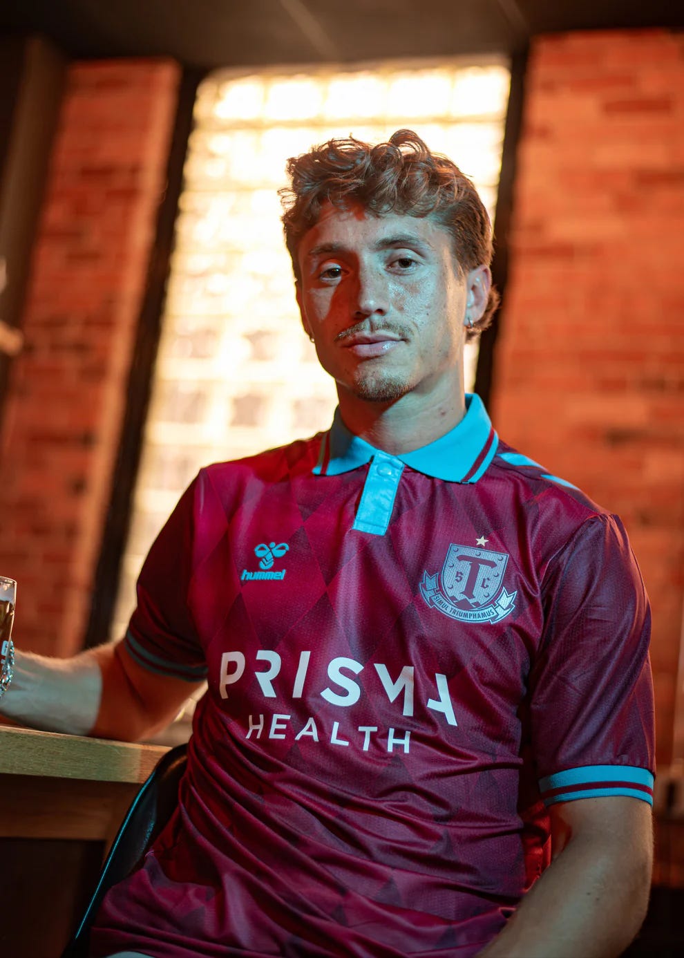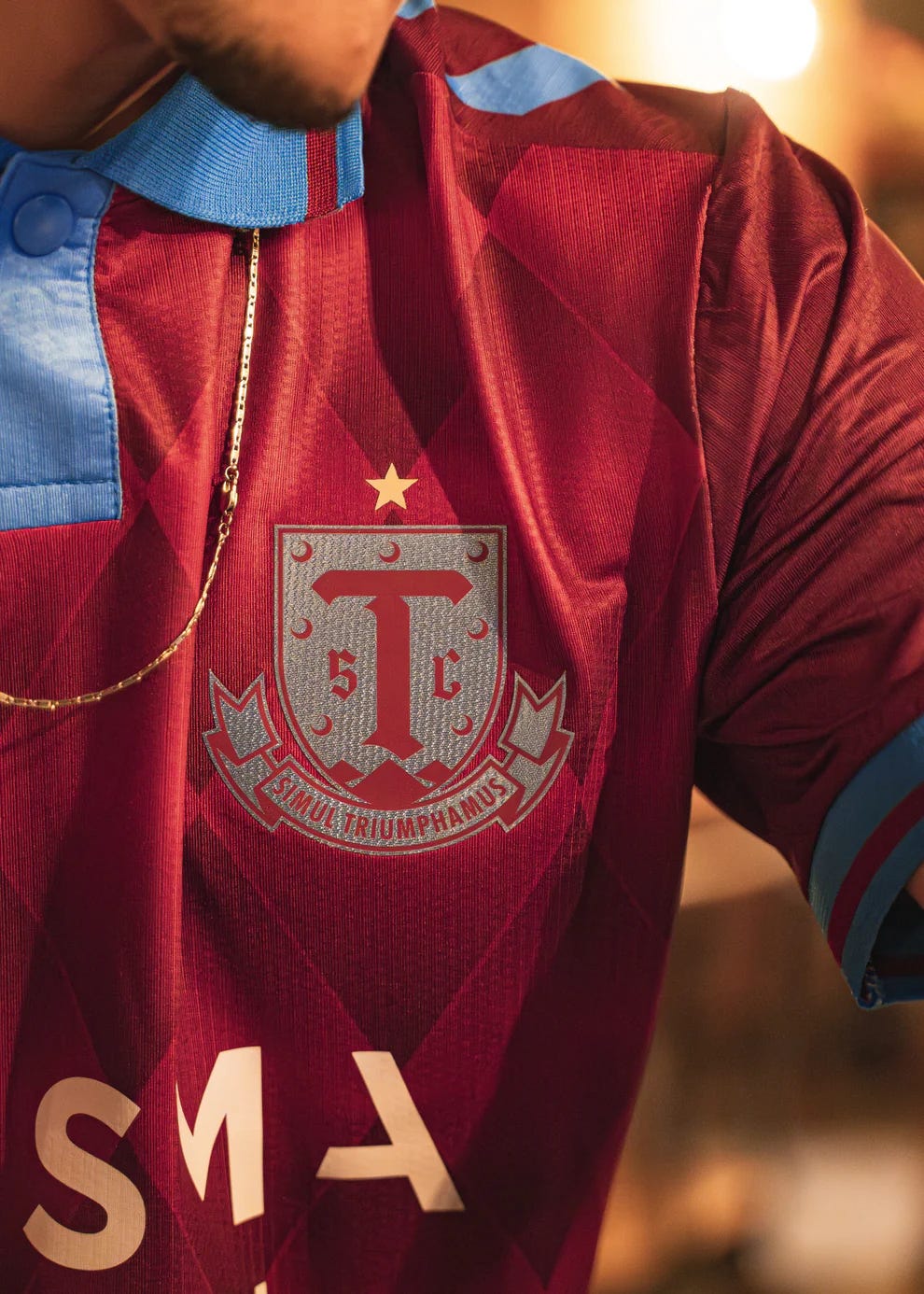 “Paying tribute to the roots of our game with an entirely new look. Introducing the Classic Kit, featuring a Triumph twist on the timeless claret and blue football colors, a diamond stained-glass pattern, and the club’s first-ever button-collared top. The kit is anchored by a retro take on the Triumph crest, featuring a gothic font and “Together We Triumph” in Latin, accented by crescent moon rivets from the South Carolina flag.”