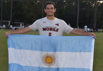 Alej Binaghi, an Argentinian midfielder who won the 2021 NAIA Player of the Year award while playing at the University of Mobile, scored a stoppage-time equalizer and made the deciding kick in a penalty shootout to give Union 10 FC a 1(4)-1(2) win Sunday against Pensacola FC in The League for Clubs Gulf Coast Conference championship match. CREDIT: La Nacion